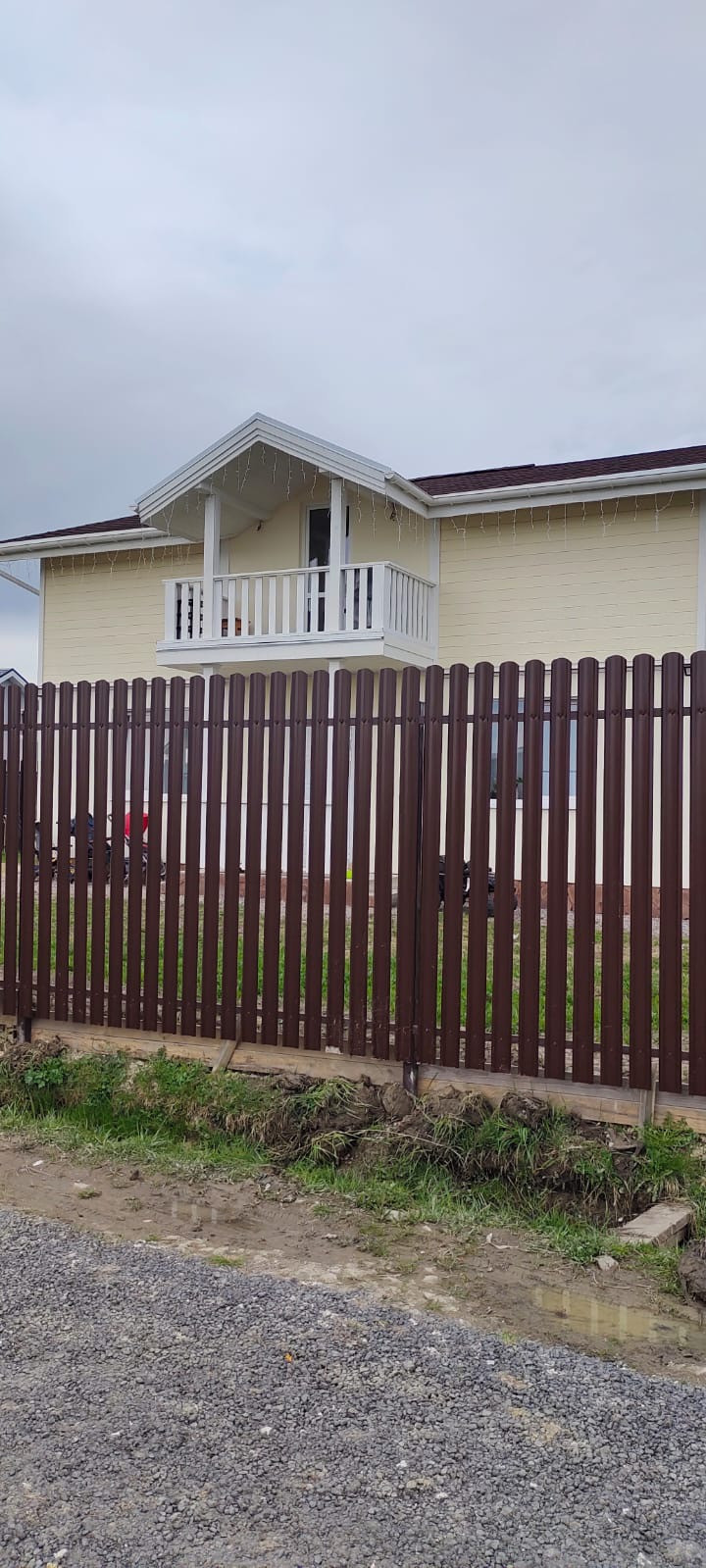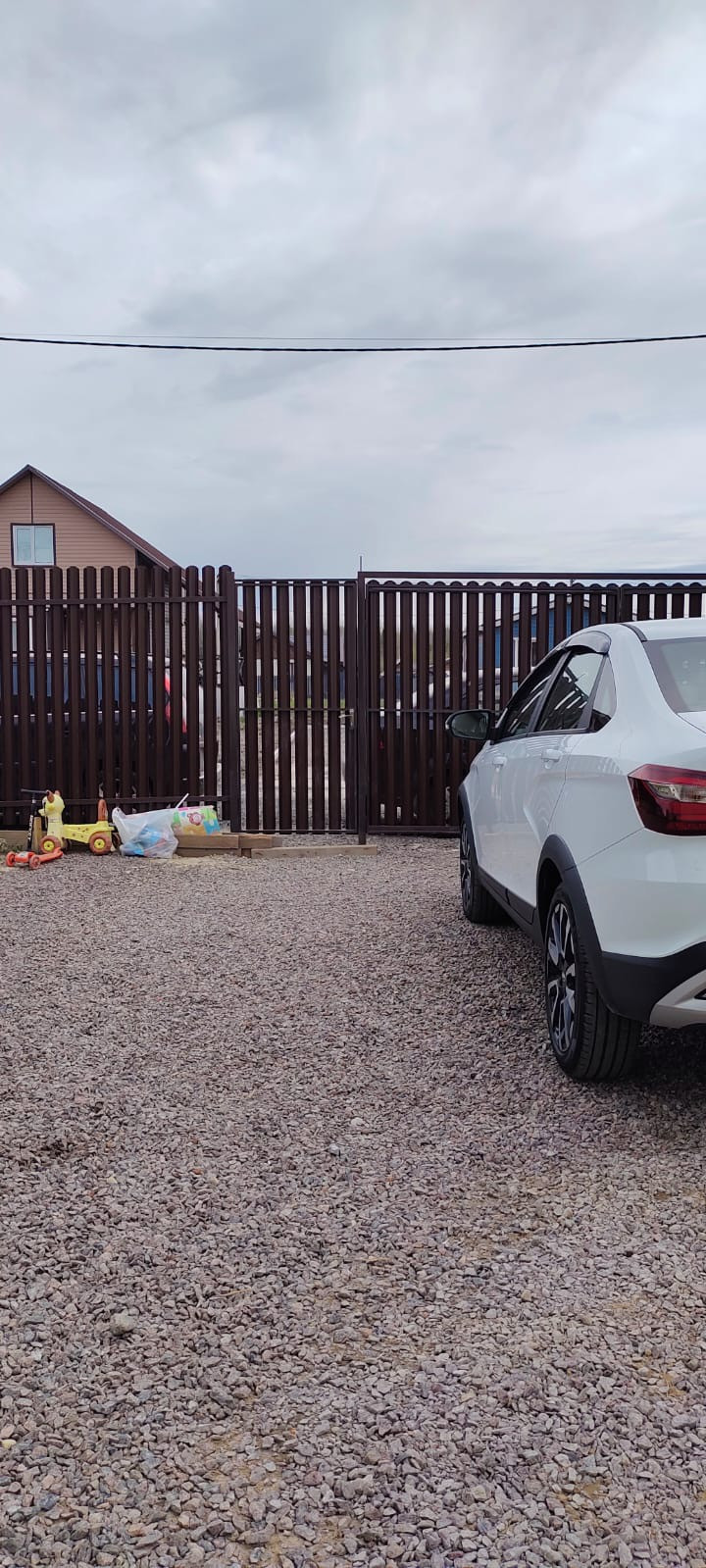Два парковочных места, отсыпаны щебнем. Забор с калиткой и распашными воротами.