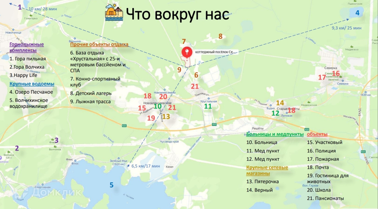 • КП Расположен в 40 минутах от центра и 30 км на запад от Екатеринбурга, рядом с селом Новоалексеевское и коттеджным поселком Хрустальный