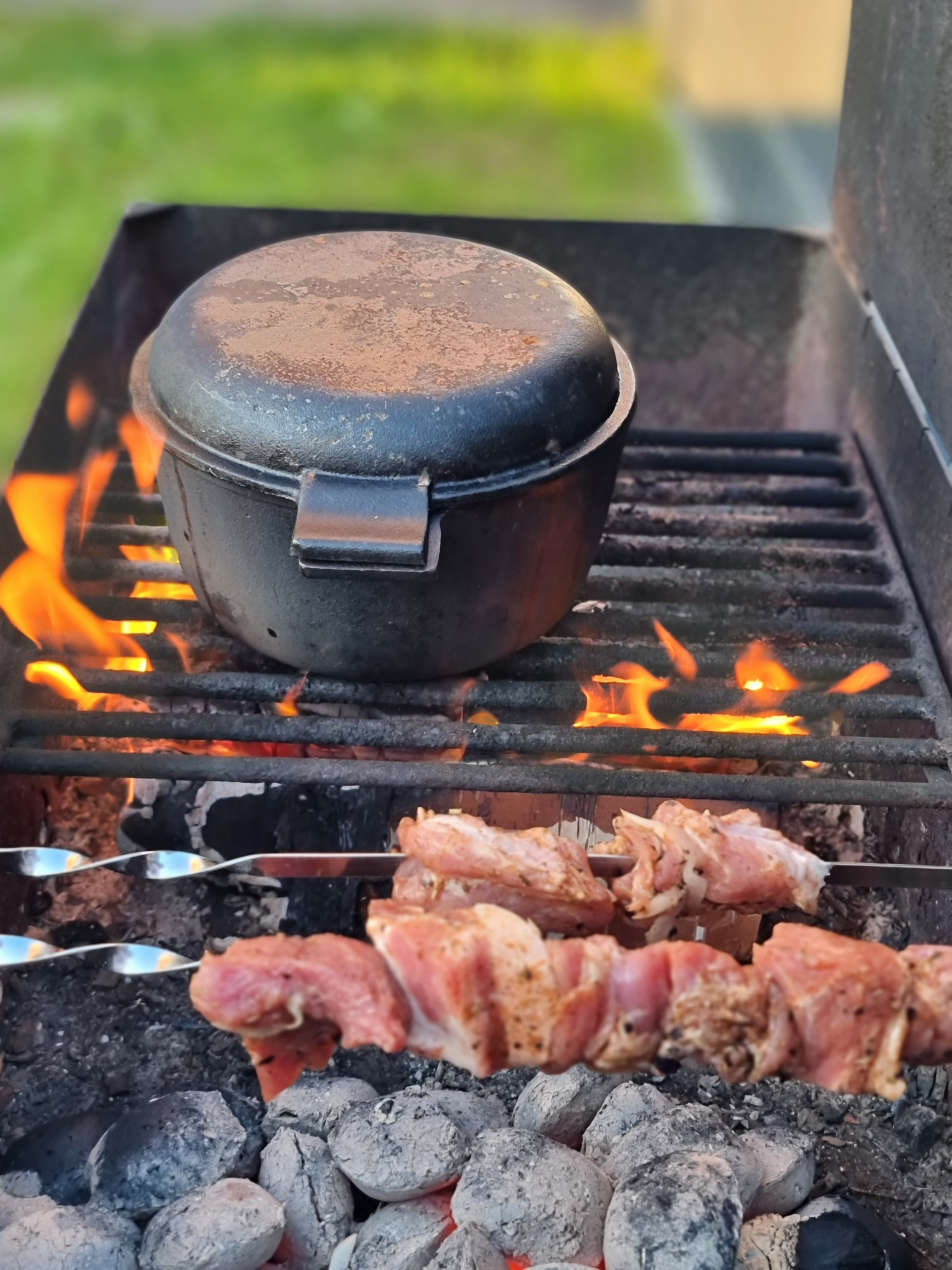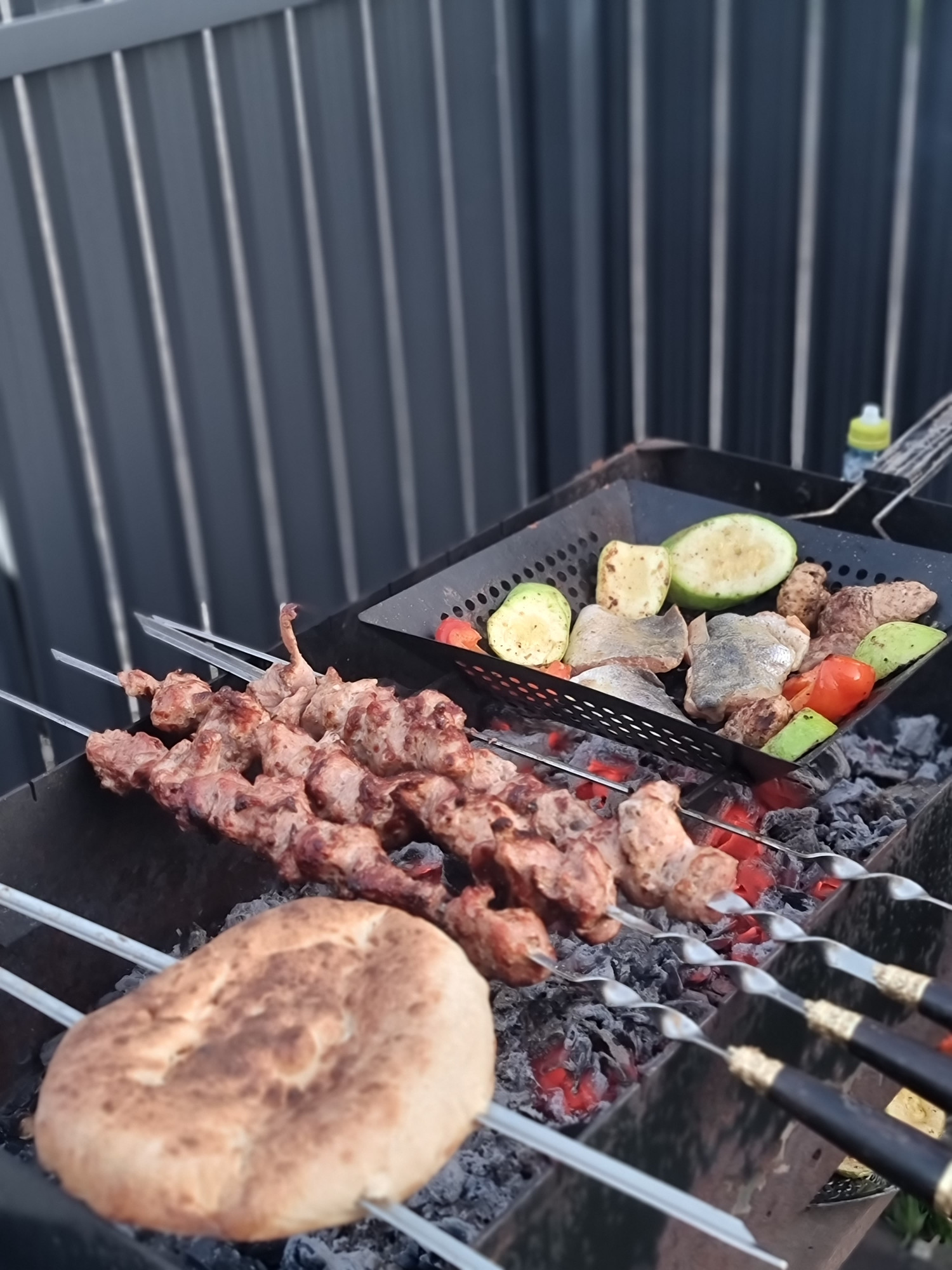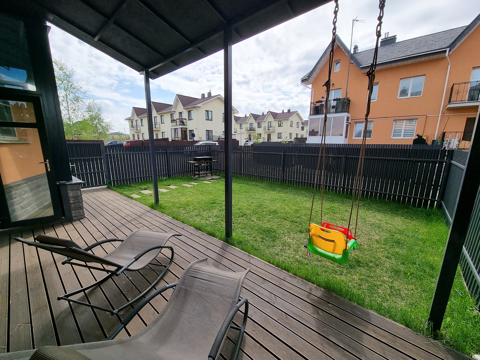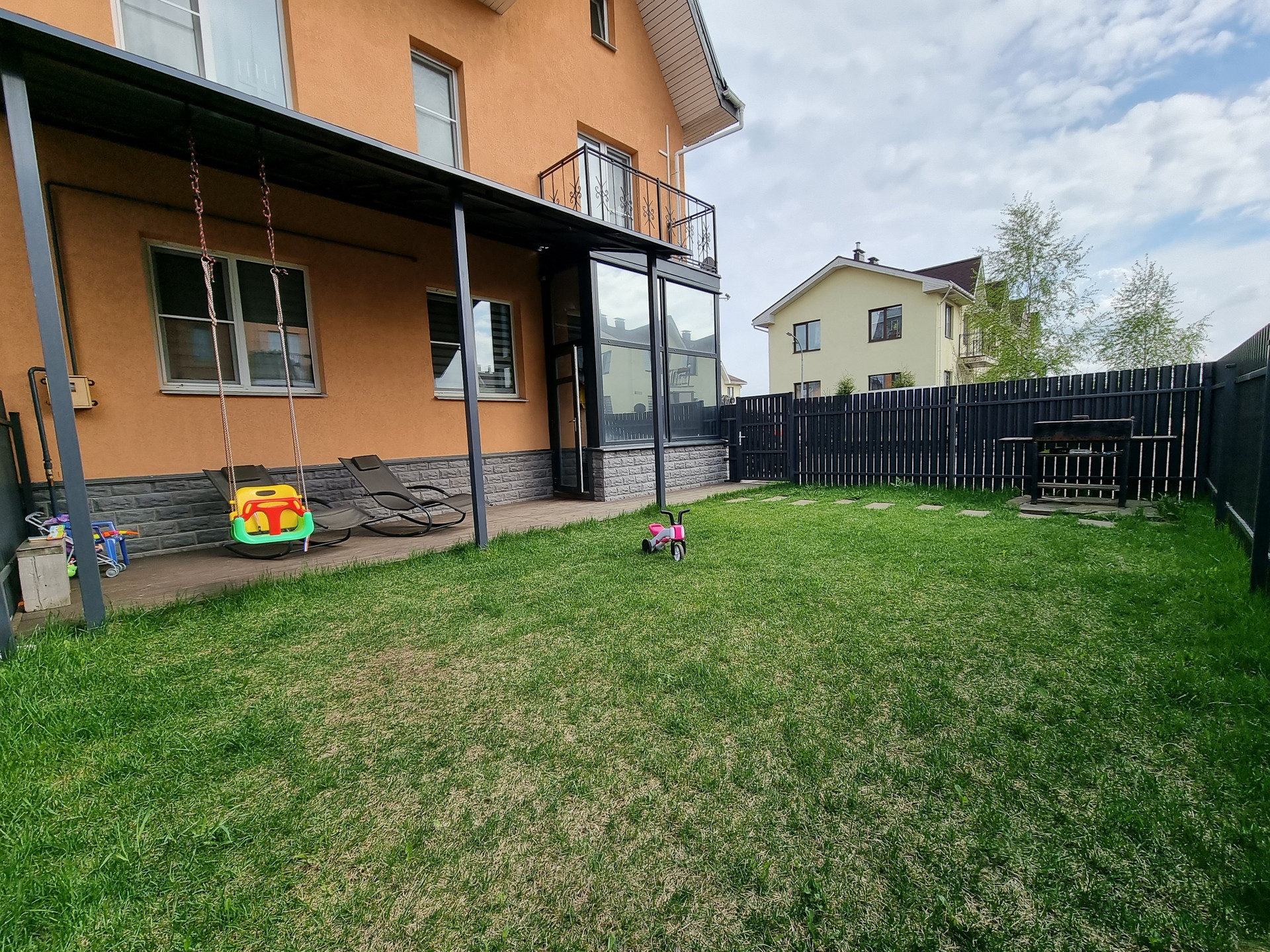 Огороженная забором земля, зона с мангалом для шашлыков/барбекю, терраса с навесом. Пристройка для хранения хоз. инвентаря, шин и т.д. в ней же спрятан шланг для полива газона.