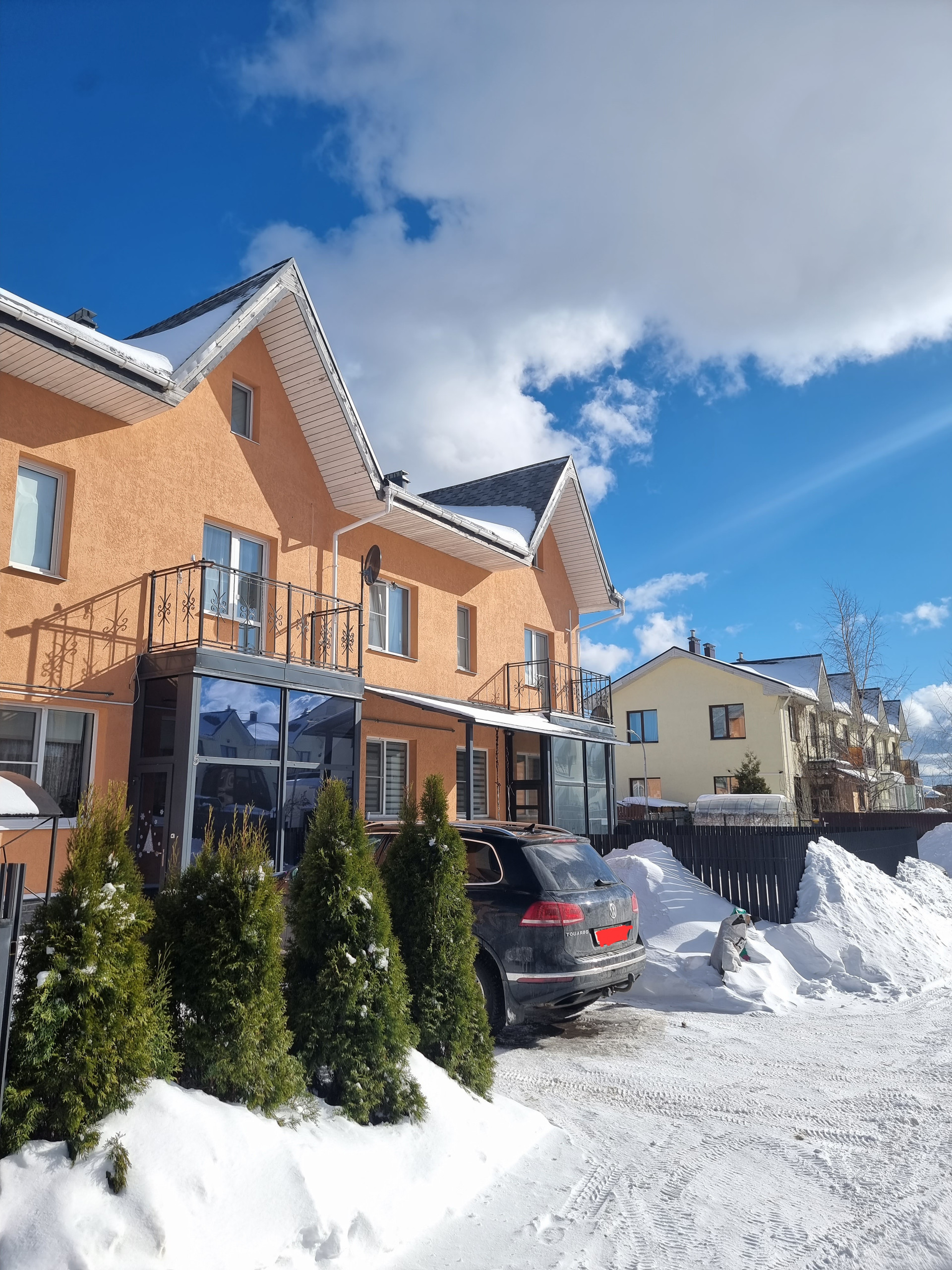 Всего в комплексе 34 таунхауса высотой в два этажа+мансарда. Фундамент выполнен из монолитной железобетонной плиты с высоким утепленным цоколем. Монолитное перекрытие между этажами.