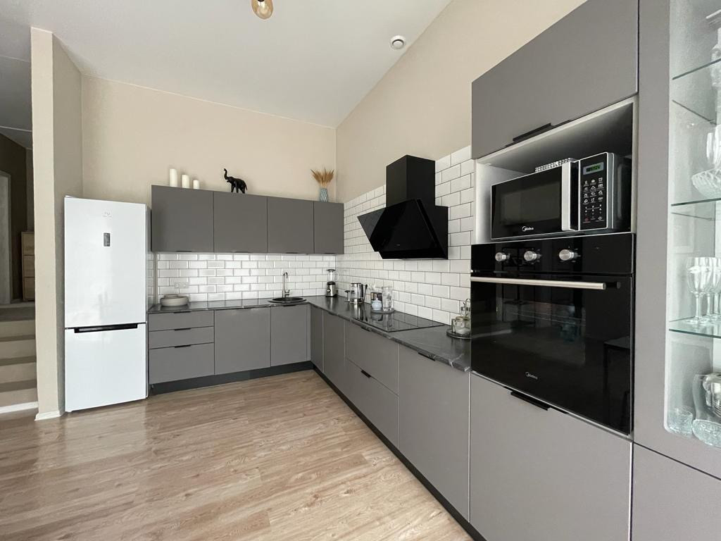 В доме останется мебель (кухонный гарнитур с техникой (духовой шкаф, варочная поверхность, ПММ), встроенные шкафы (коридор, комната), потолочное освещение во всем доме.
