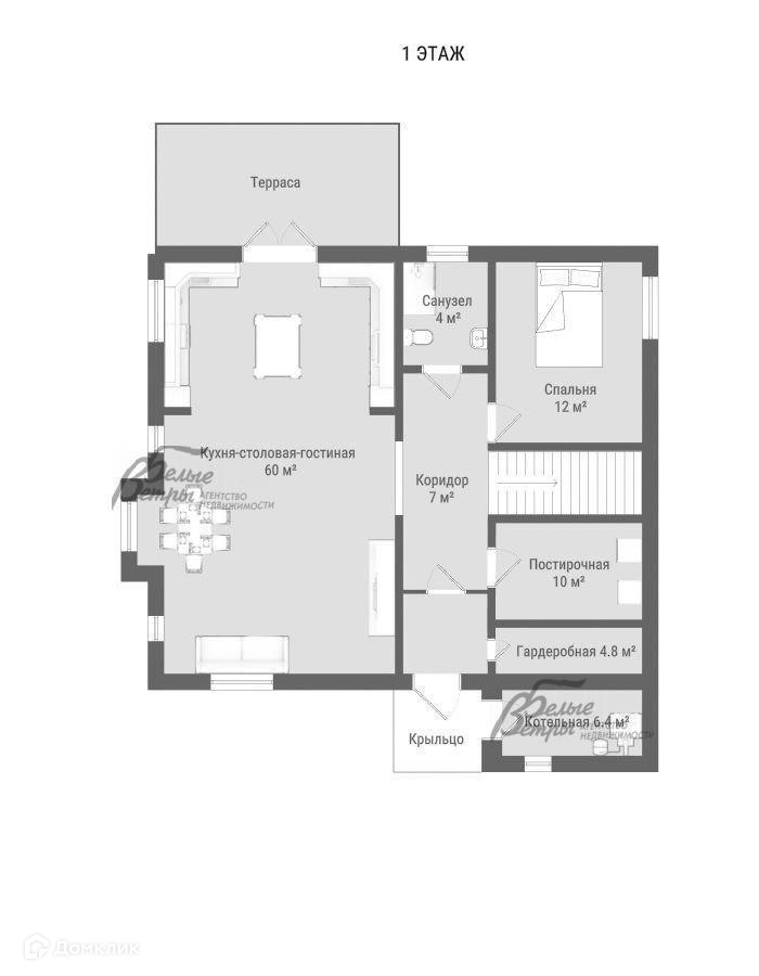1-ый этаж: крыльцо 4.7 кв.м, коридор 7 кв.м, холл 5 кв.м, постирочная 11 кв.м, санузел 4 кв.м, спальня 12 кв.м, кухня-столовая-гостиная 60 кв.м, гардеробная 5 кв.м, котельная 6.4 кв.м.