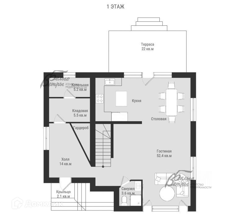 1-ый этаж: крытое крыльцо, прихожая-холл 14 кв.м, кладовая 5.6 кв.м, котельная 5 кв.м, кухня-столовая-гостиная 52.4 кв.м, санузел 3.6 кв.м (с душем), терраса 22 кв.м..