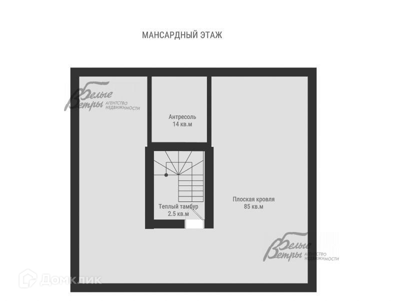 3-ий этаж: антресоль 14 кв.м для хранения, теплый тамбур 2,5 кв.м с выходом на эксплуатируемую кровлю 85 кв.м (с парапетом и ограждением, включает два пространства 45 и 33 кв.м). Не входит в указанную общую площадь дома..