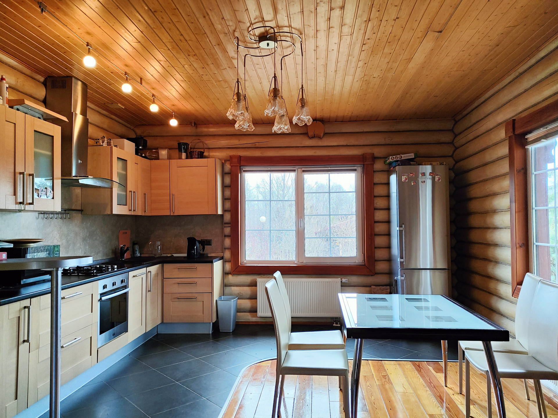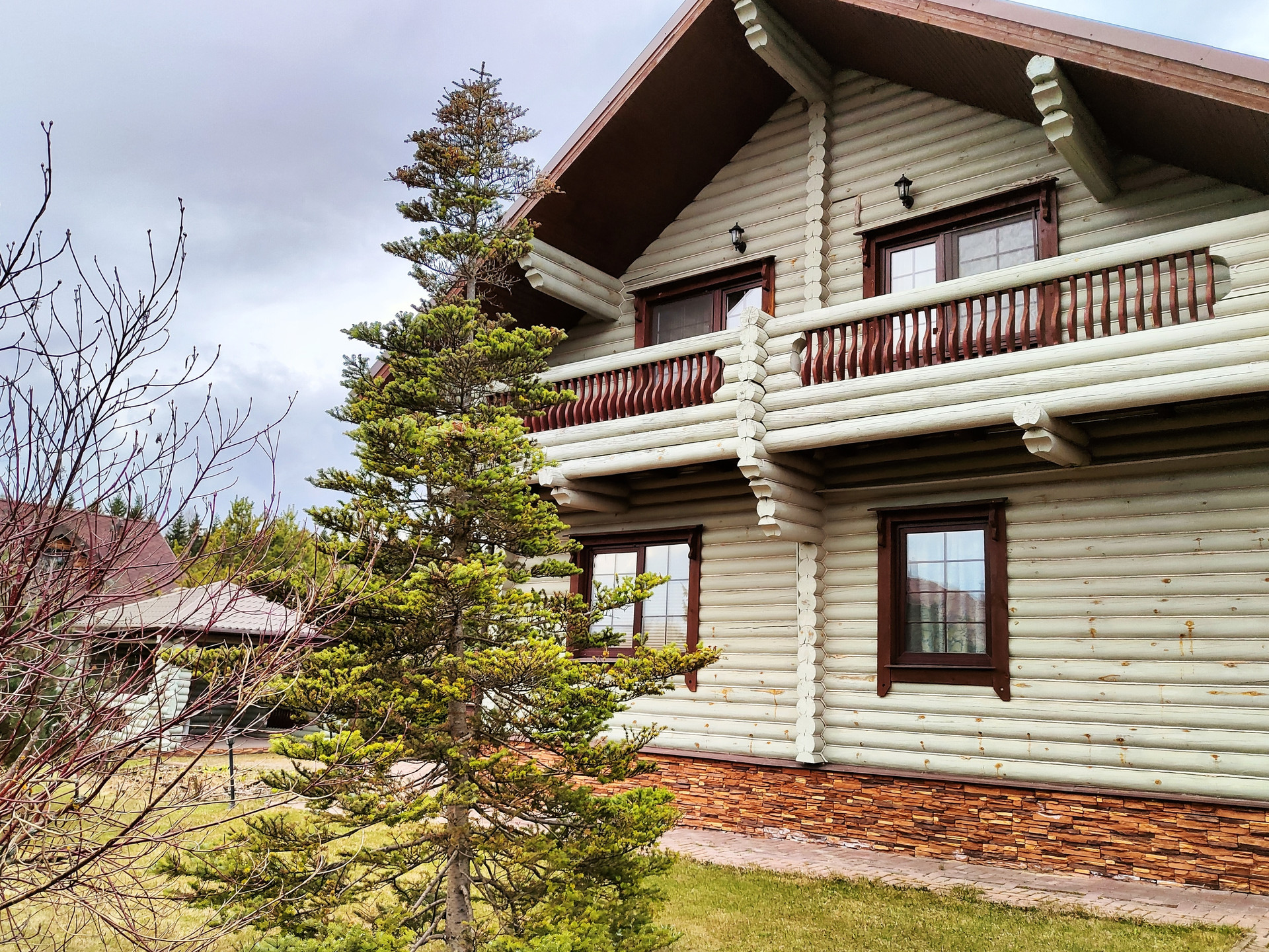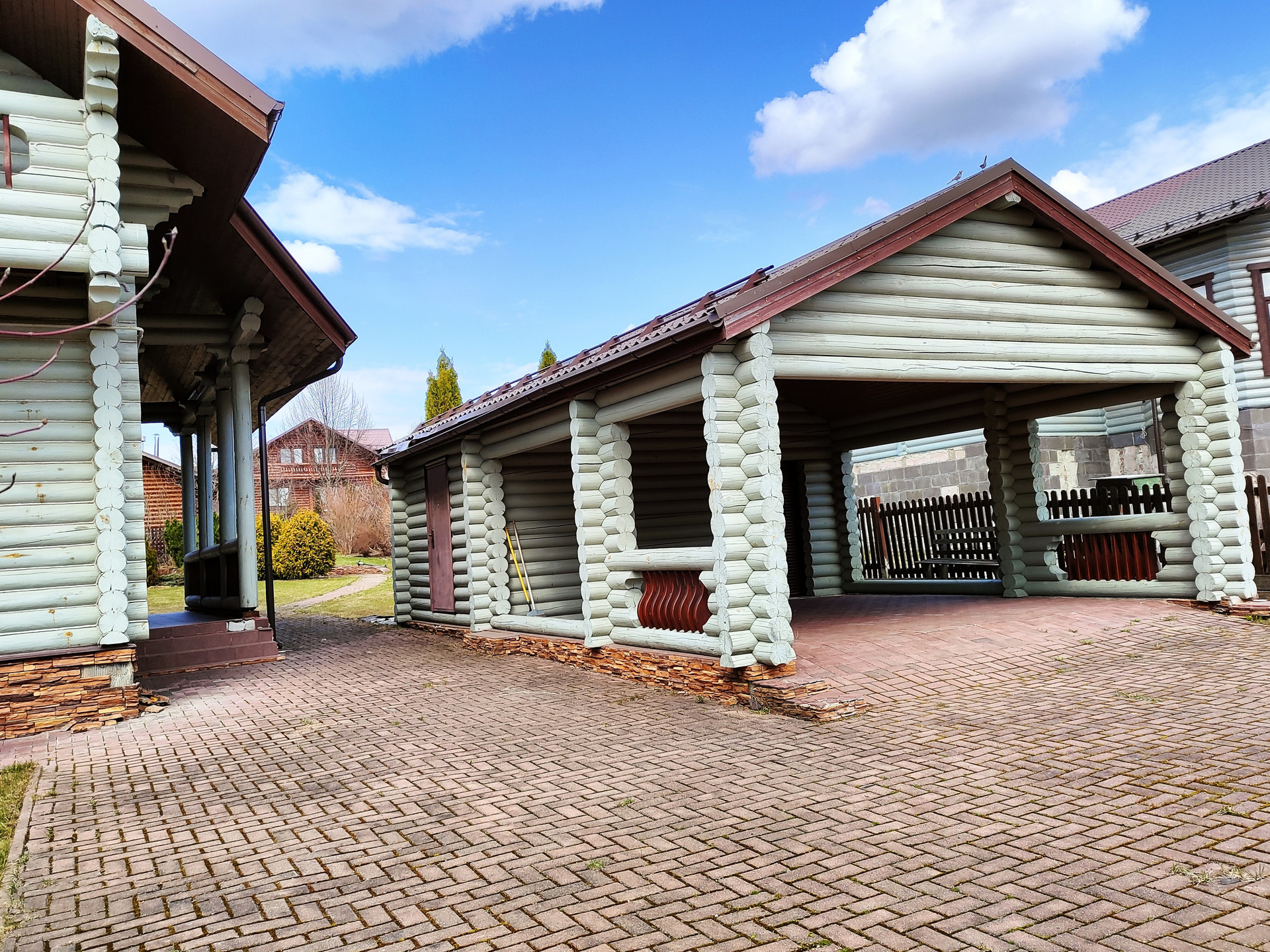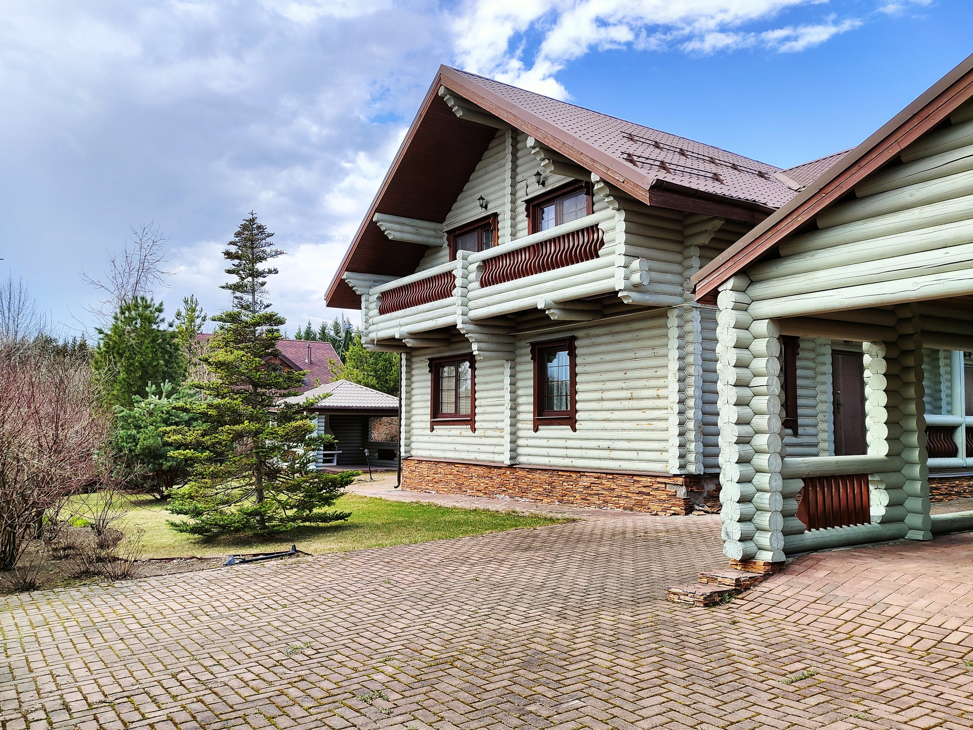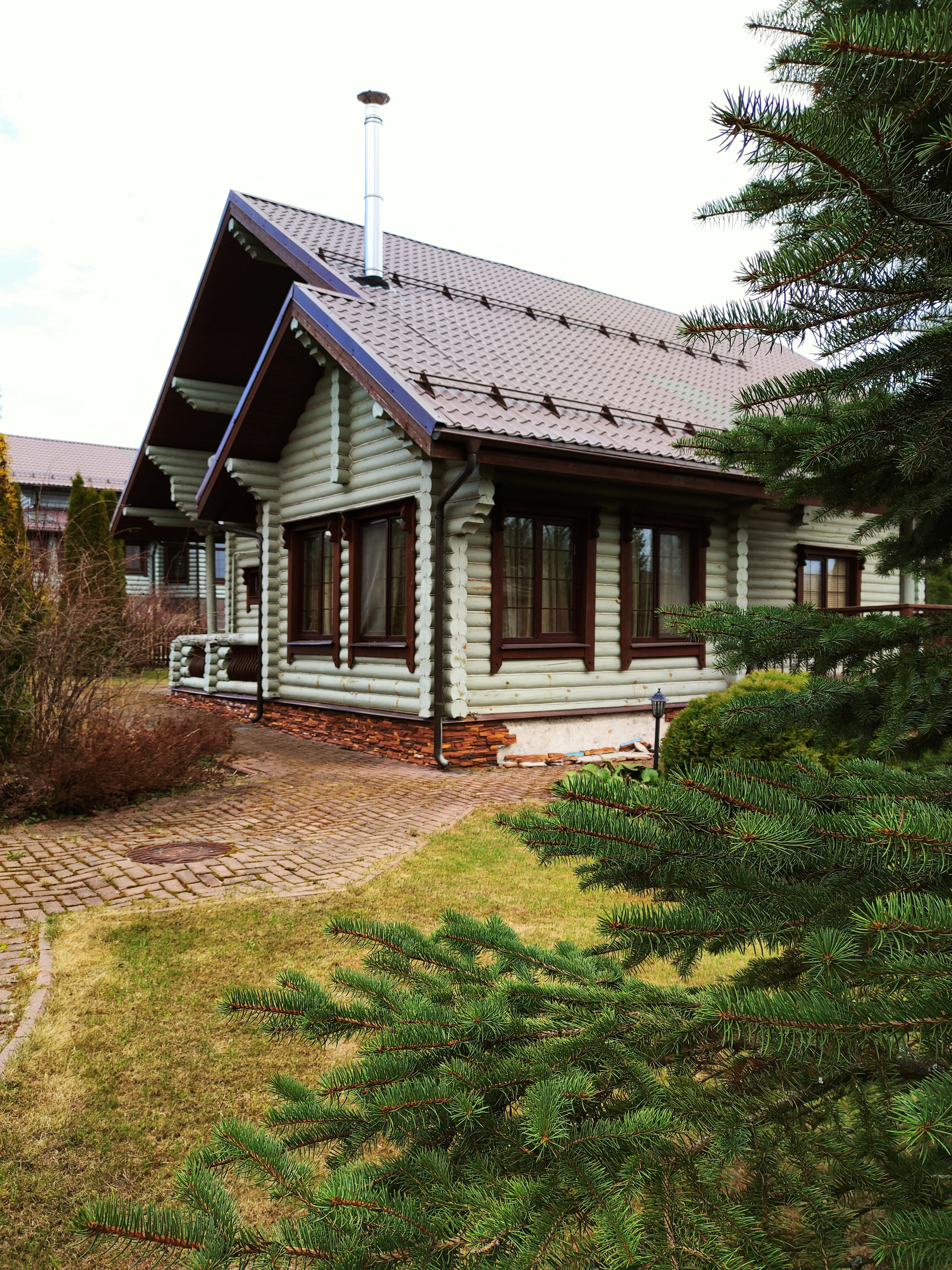 Дом подходит для круглогодичного проживания. Часть соседей живет в поселке постоянно. Дом построен из оцилиндрованного бревна, сухой и теплый. На крыше уложена металлочерепица, окна установлены пластиковые с деревянными наличниками.   Канализация и вода центральные, газ магистральный, котел отопления установлен газовый.
