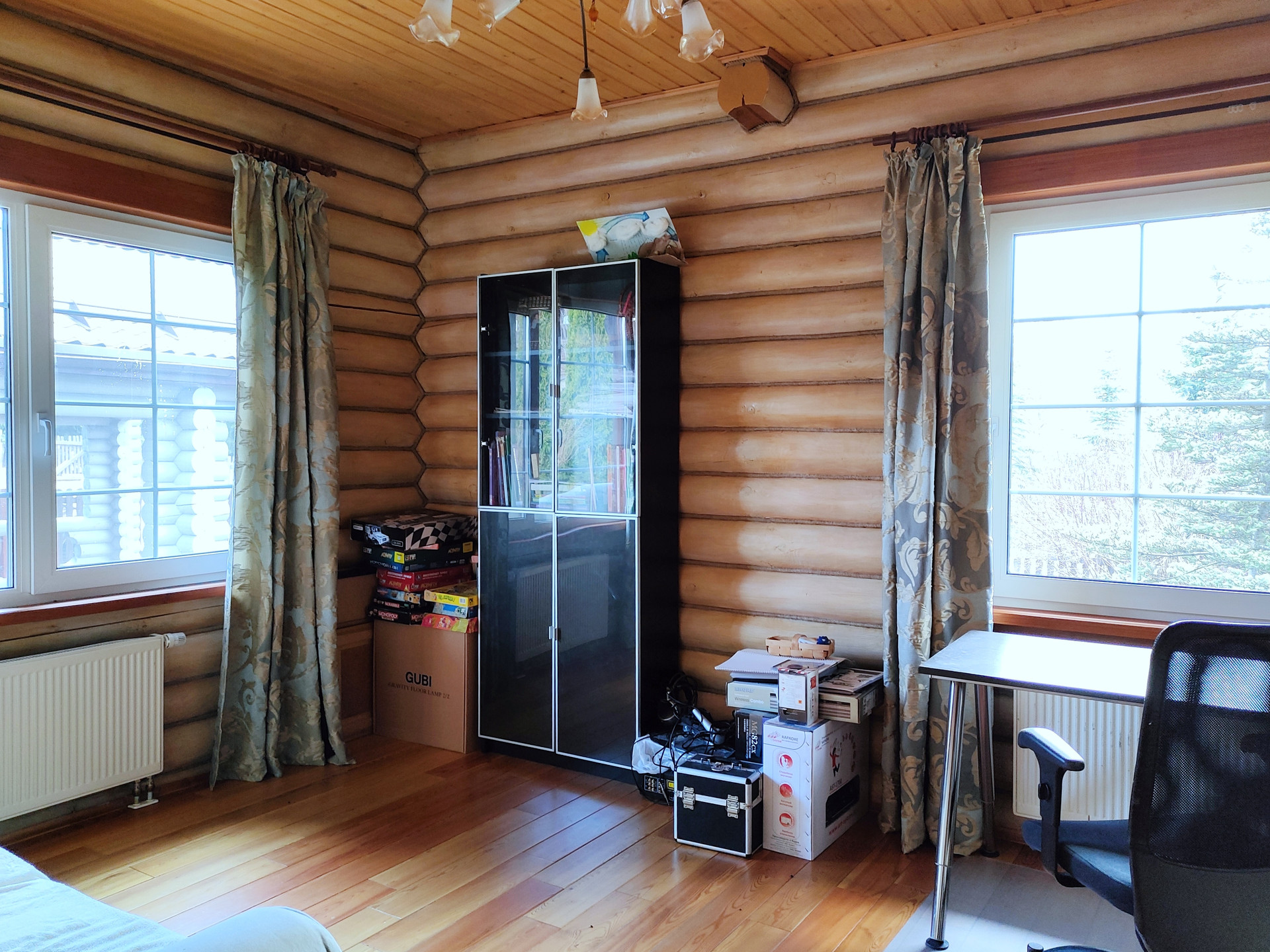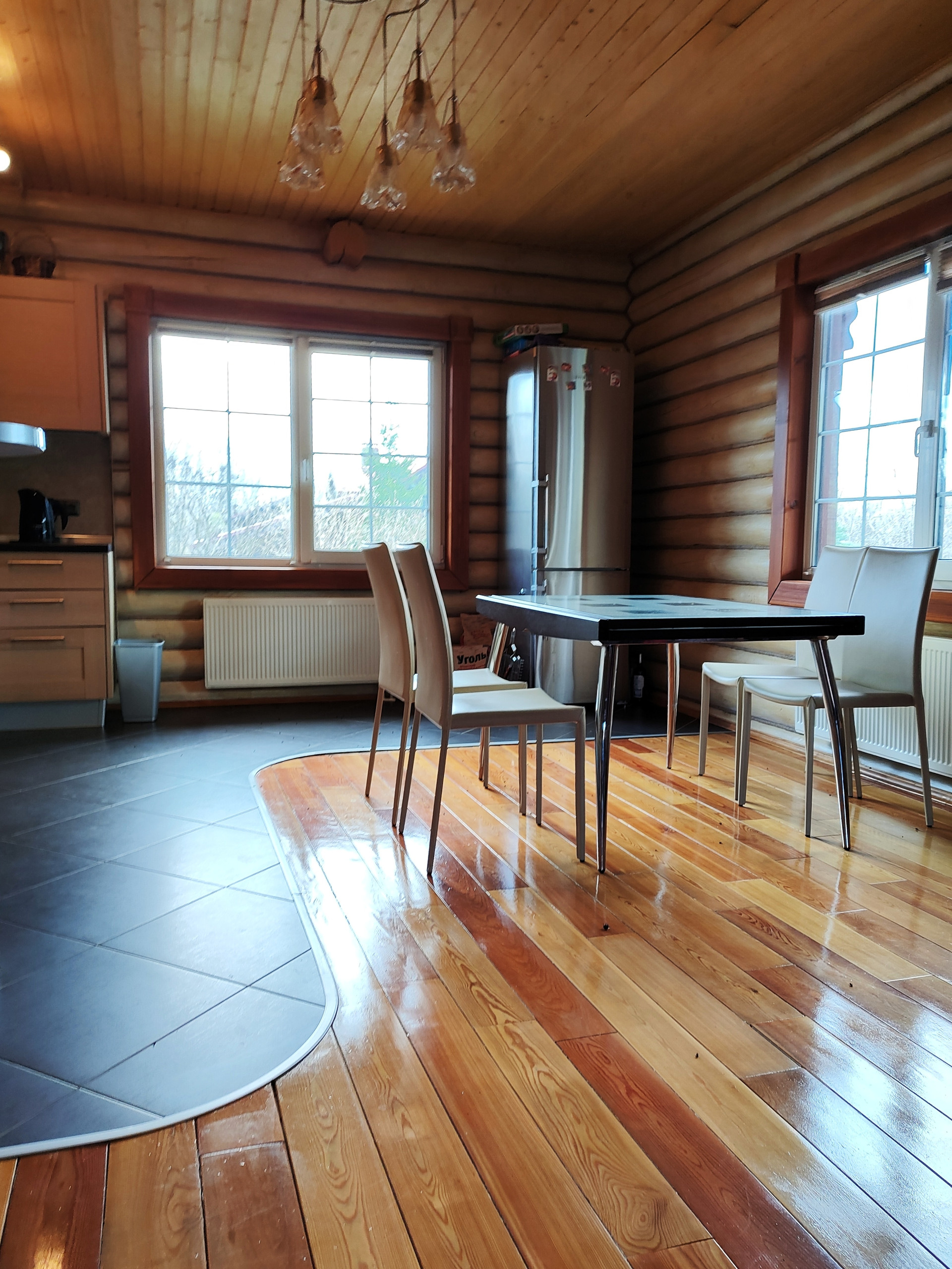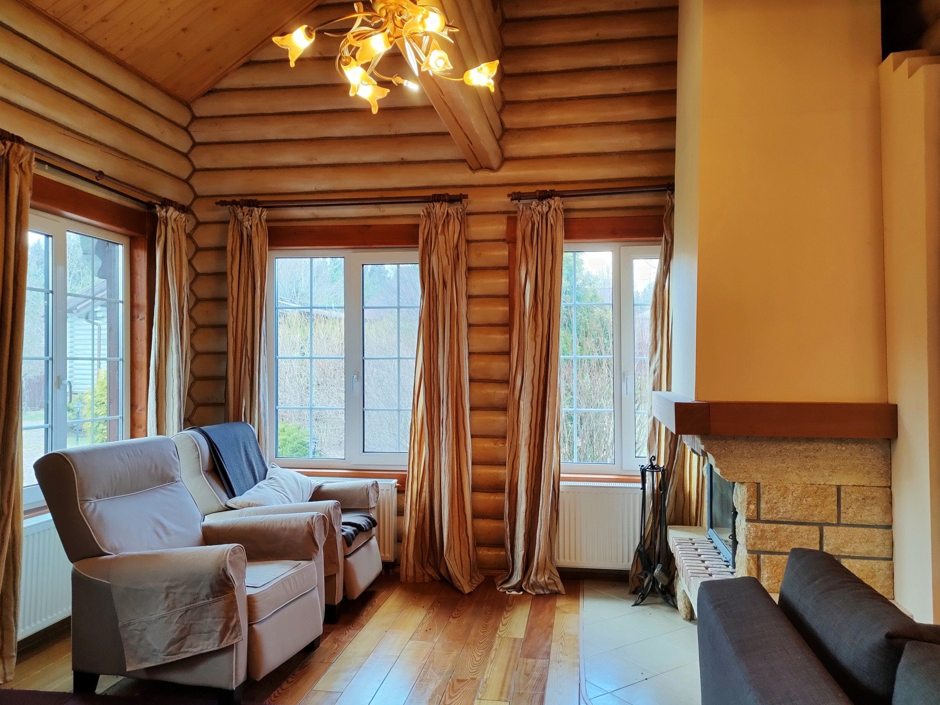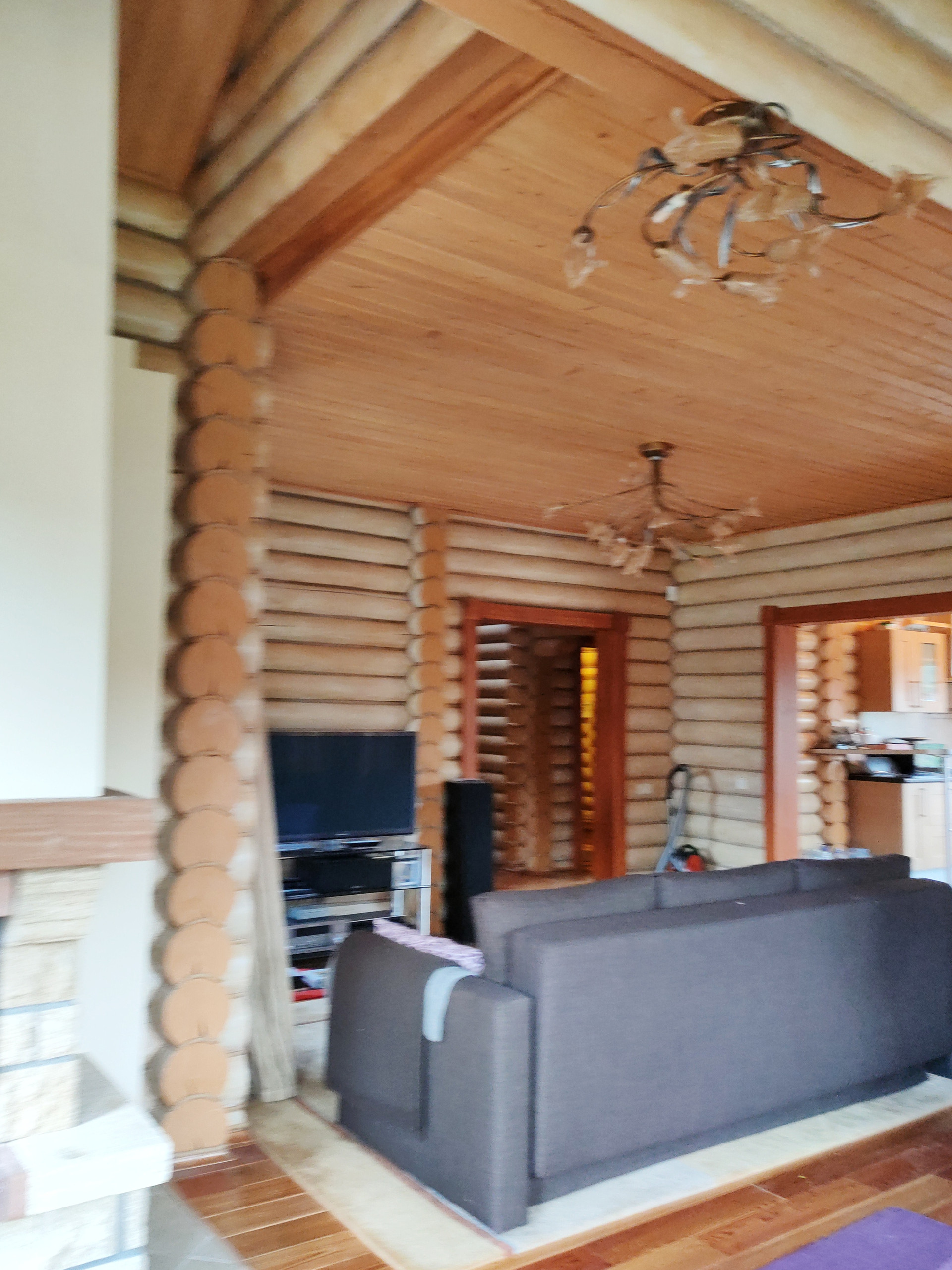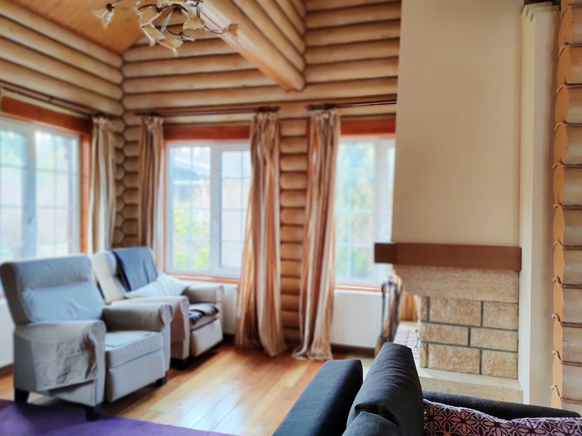 Дом подходит для круглогодичного проживания. Часть соседей живет в поселке постоянно. Дом построен из оцилиндрованного бревна, сухой и теплый. На крыше уложена металлочерепица, окна установлены пластиковые с деревянными наличниками.   Канализация и вода центральные, газ магистральный, котел отопления установлен газовый.