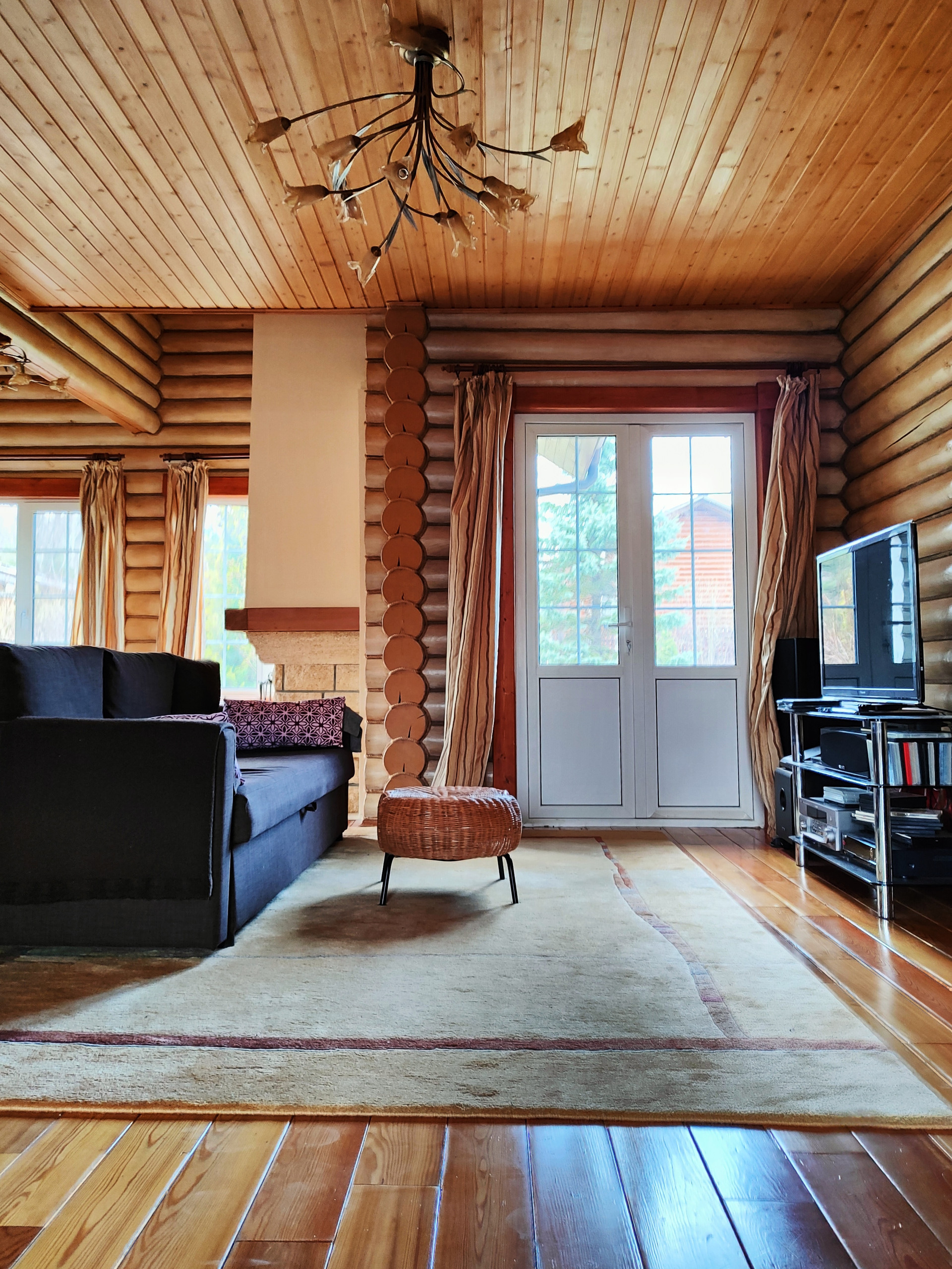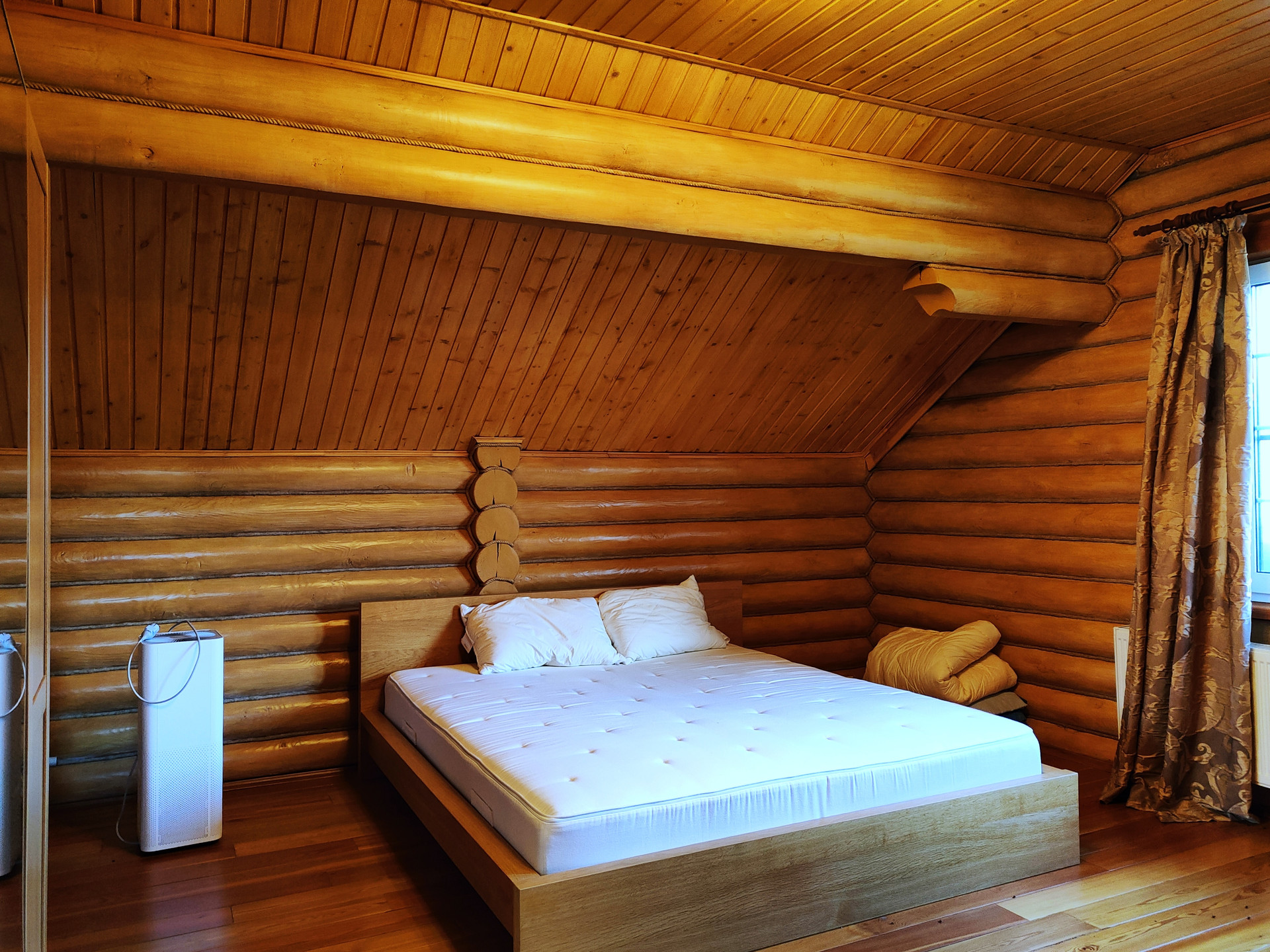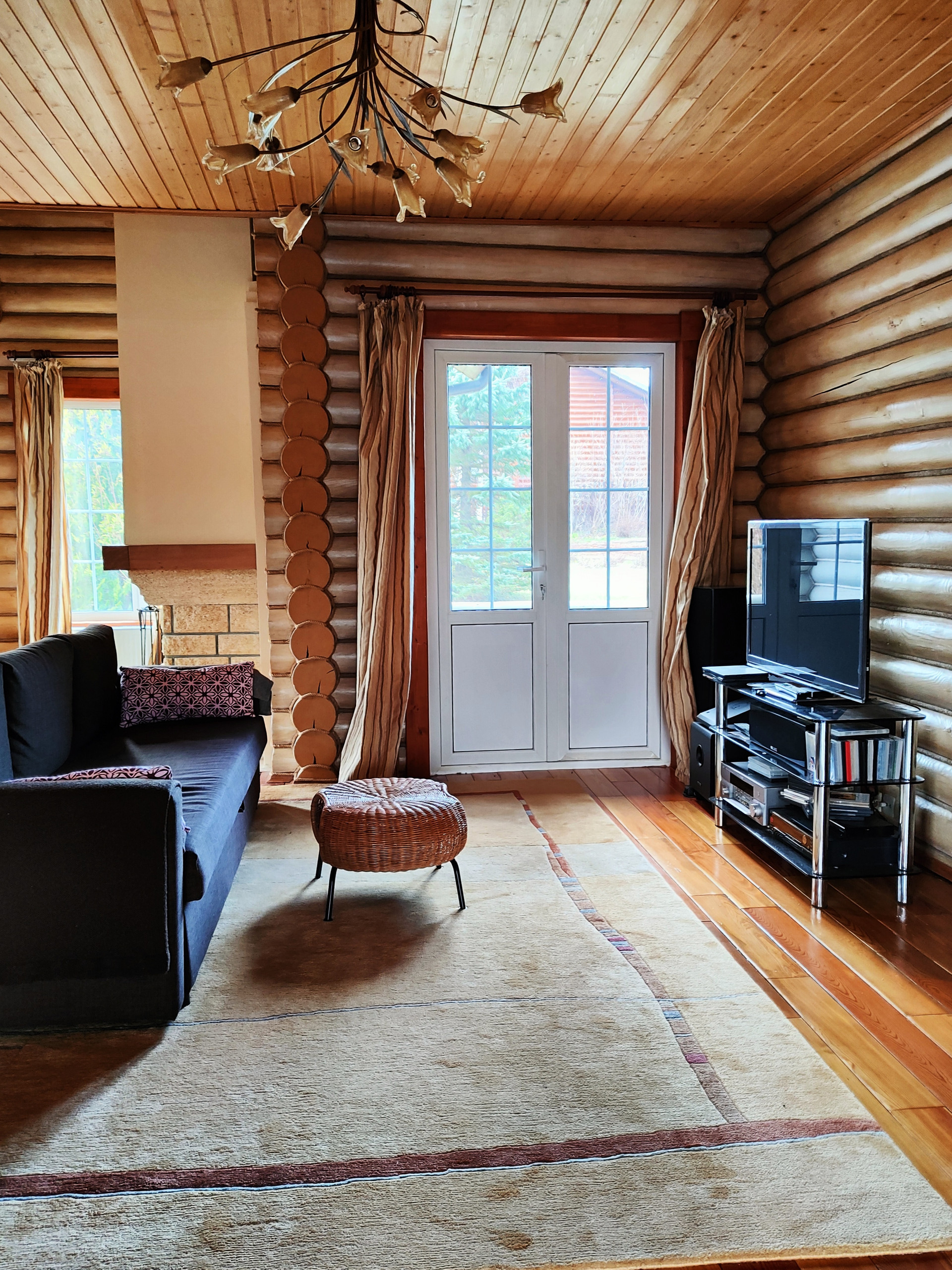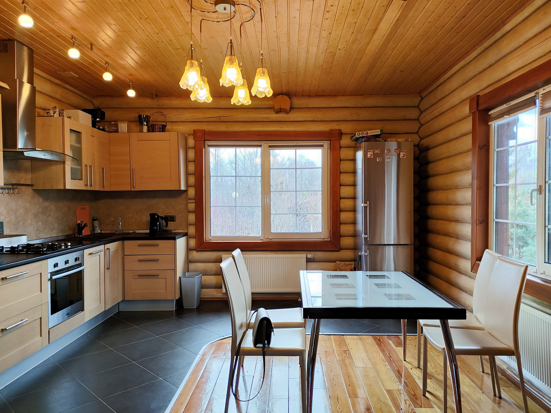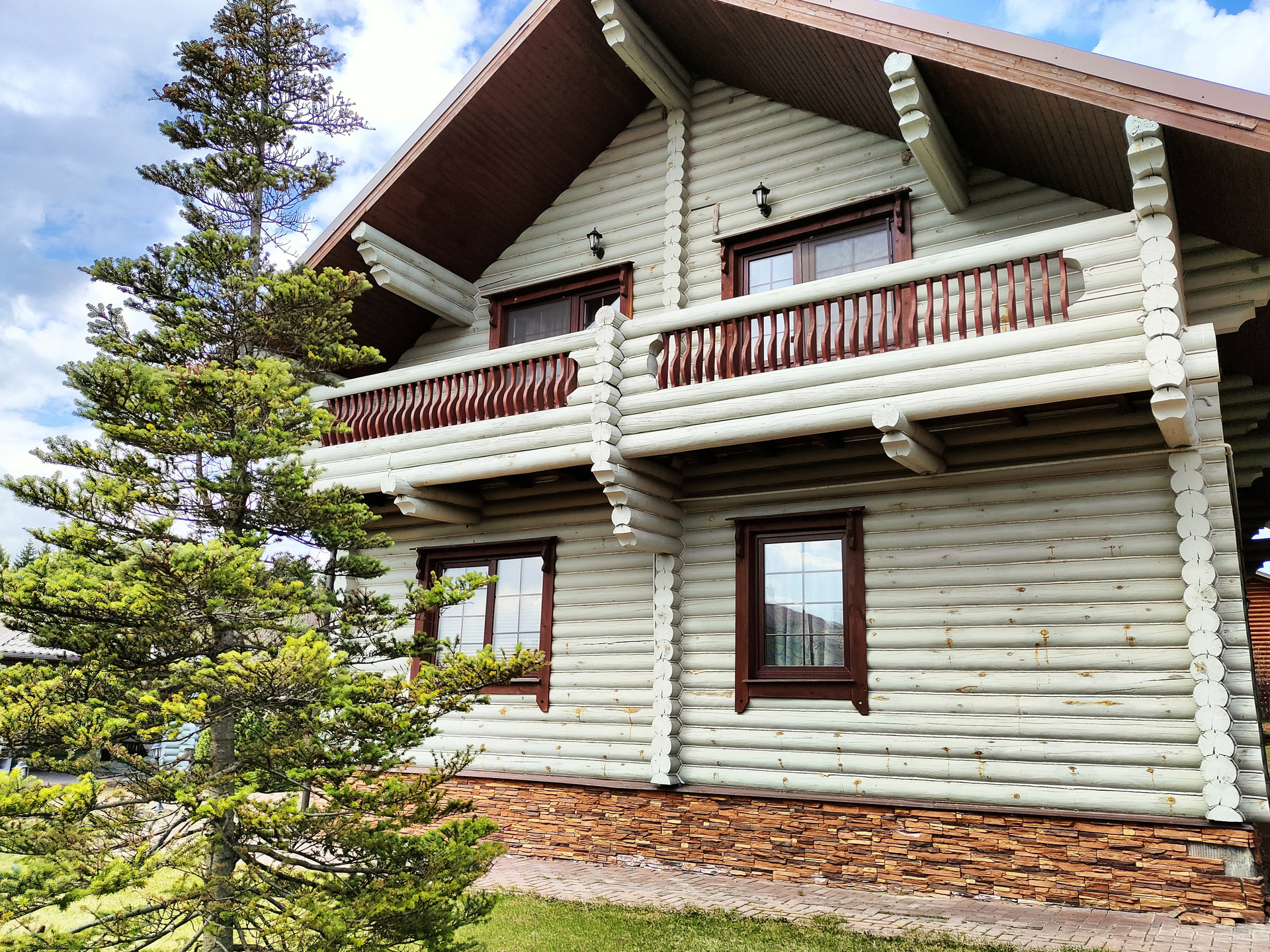 Дом подходит для круглогодичного проживания. Часть соседей живет в поселке постоянно. Дом построен из оцилиндрованного бревна, сухой и теплый. На крыше уложена металлочерепица, окна установлены пластиковые с деревянными наличниками.   Канализация и вода центральные, газ магистральный, котел отопления установлен газовый.
