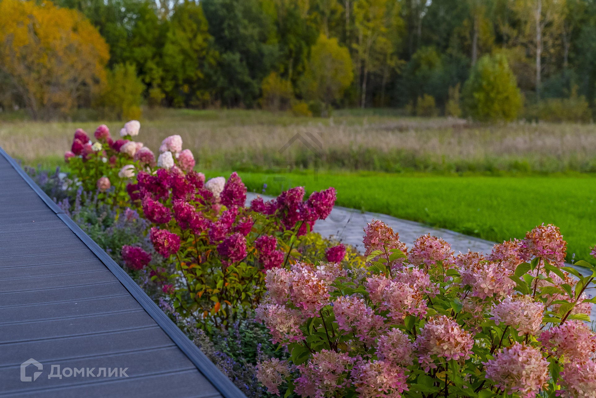 Участок озеленен газоном, цветами и декоративными растениями.