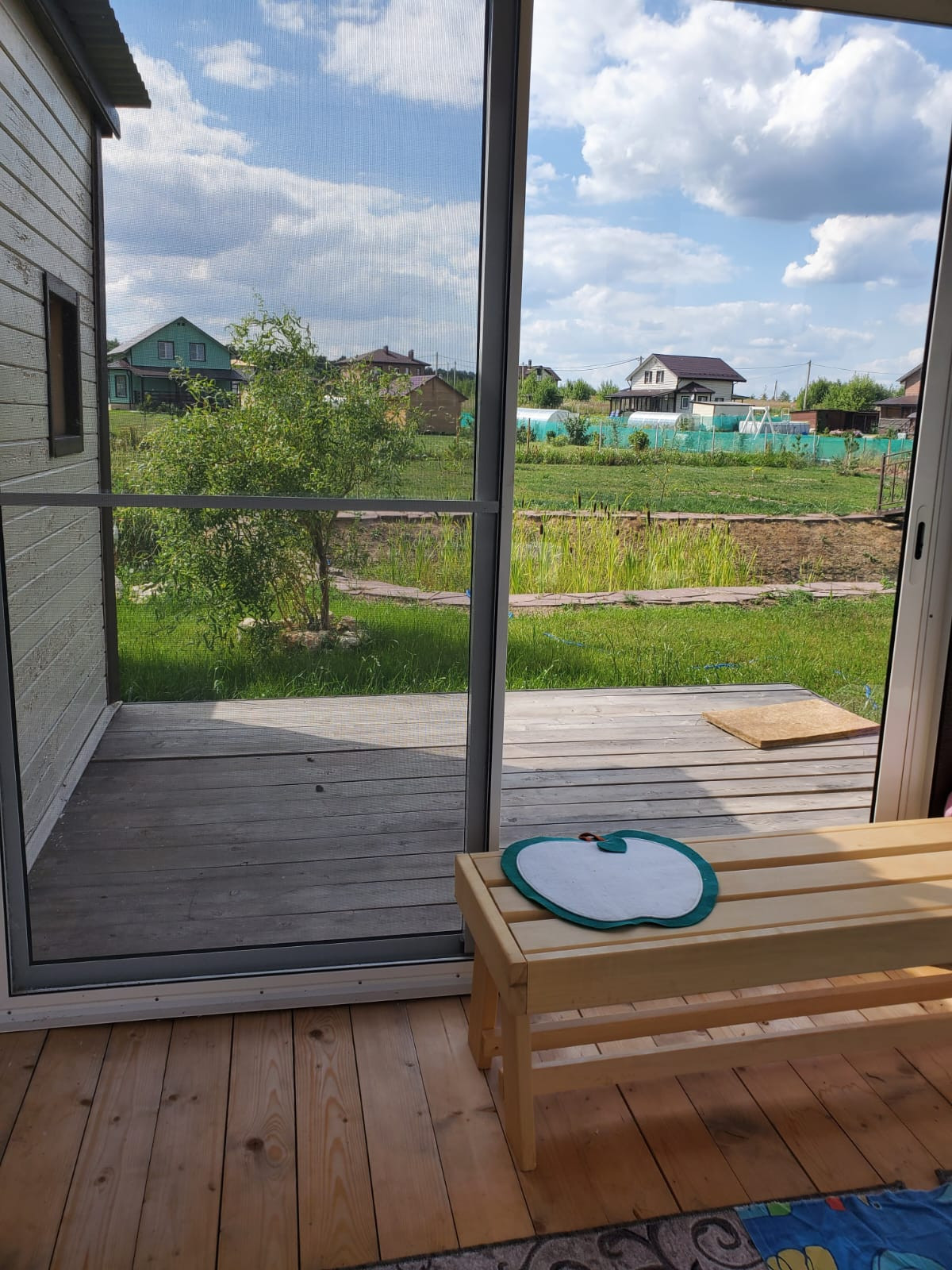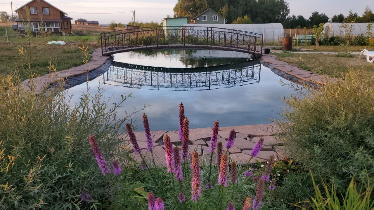 Вишенка на торте: искусственный пруд, выстелен винилитом, по периметру облагорожен камнем (размером 5 на 15 метров), который можно использовать как бассейн, с 7-ми метровым мостом через него, из металопрофиля.