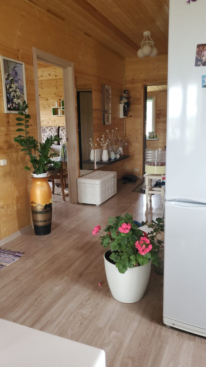 Планировка: 1 этаж - прихожая, котельная, совмещенный санузел с душевой кабиной, гостевая спальня, кухня - гостиная, с эркерным окном и выходом на остекленную панорамным методом террасу, с видом на красивый сад и пруд. Деревянная лестница.