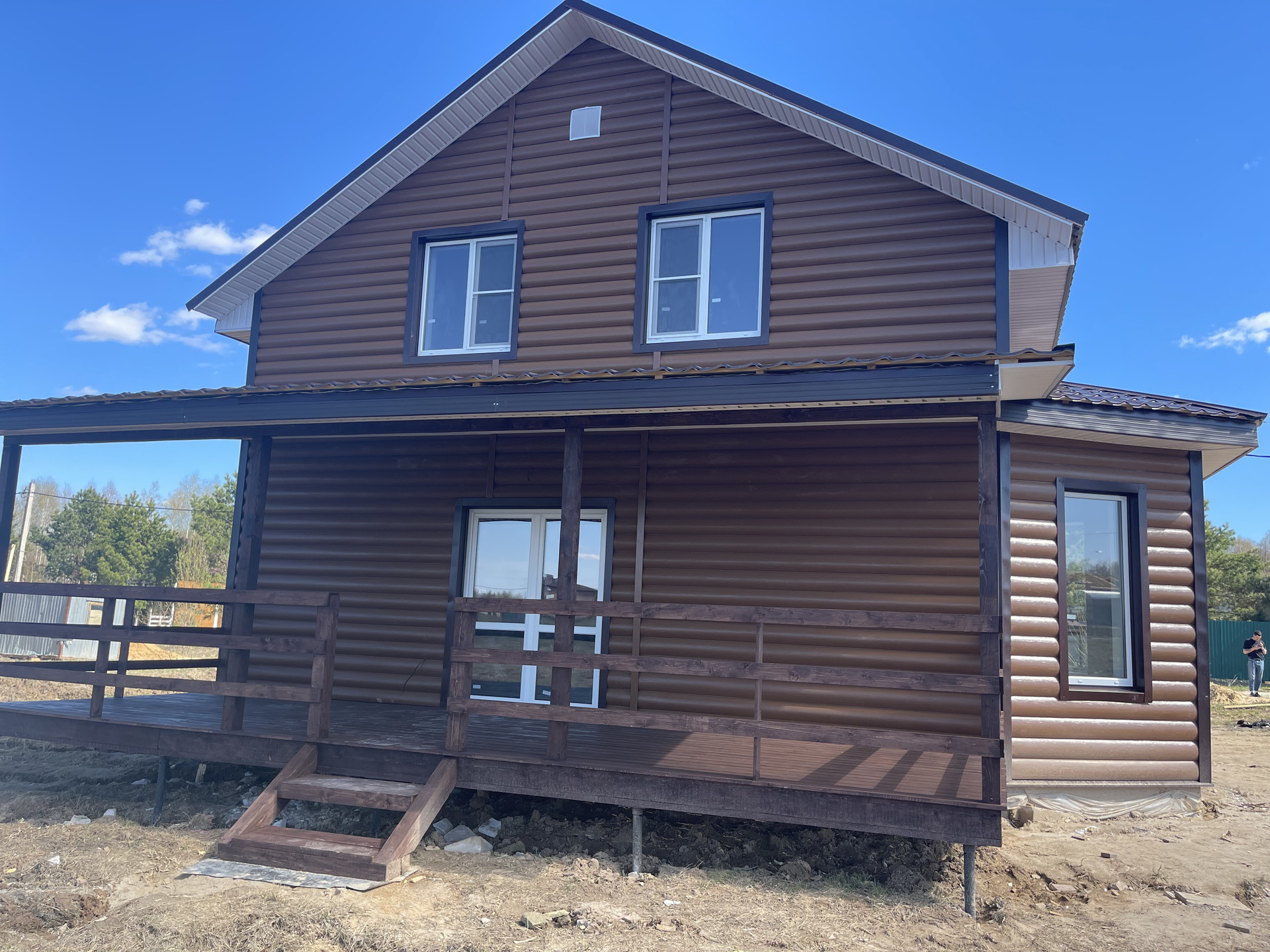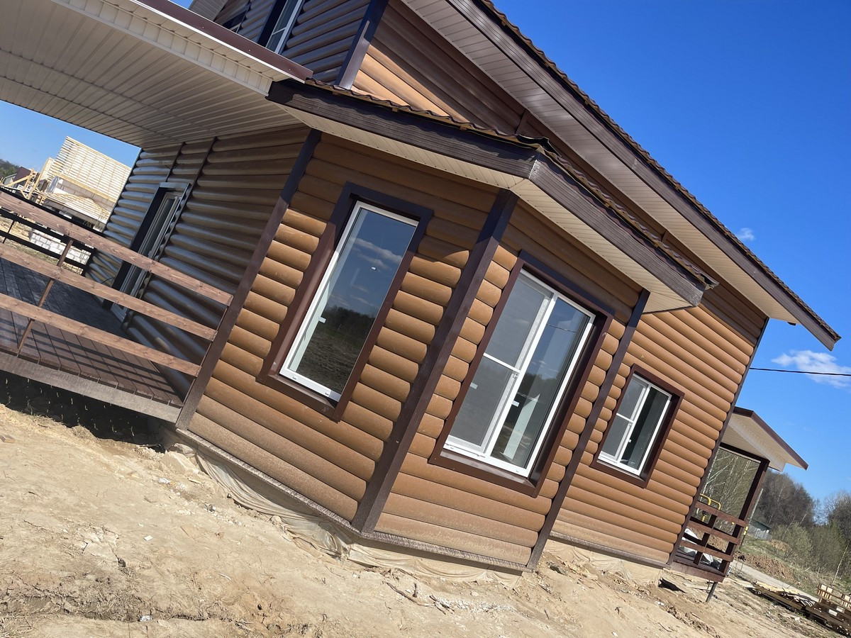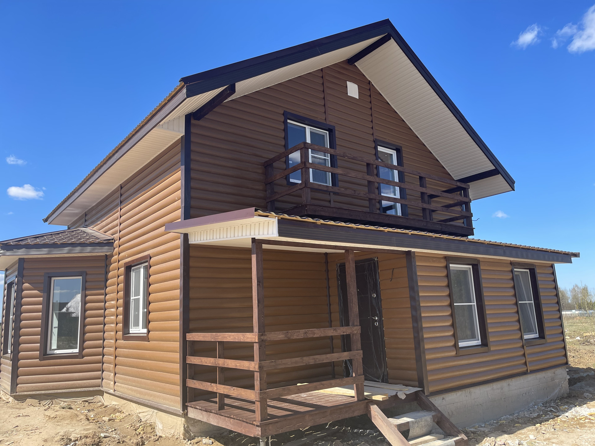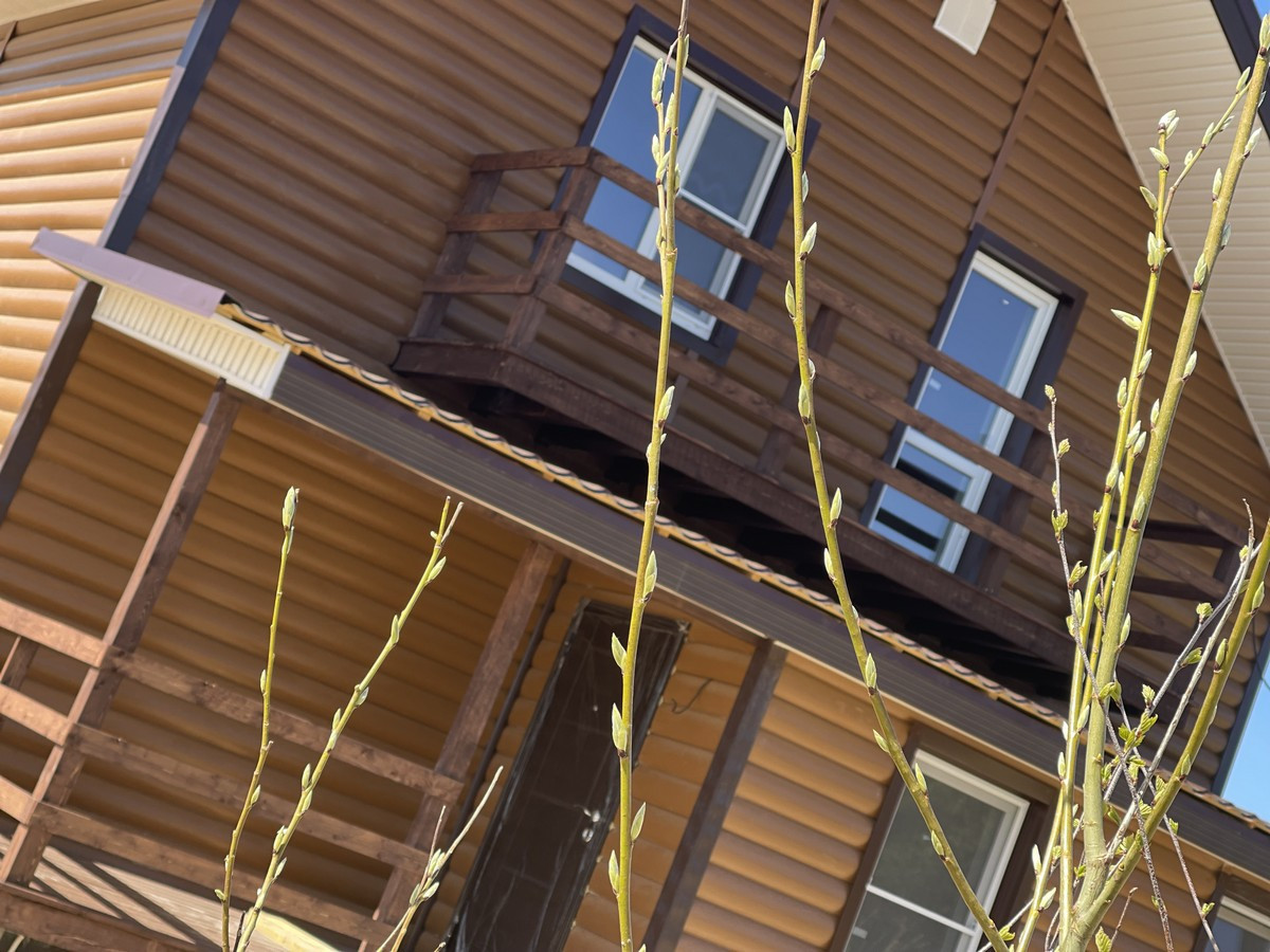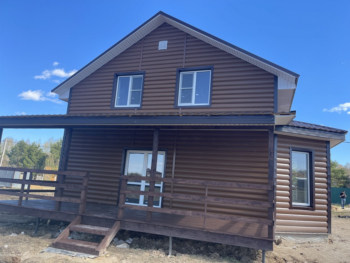 Большой дом в охраняемом посёлке. Планировка: на 1-ом этаже: крыльцо, бойлерная, коридор, санузел с сантехникой, кухня-гостиная с выходом на большую террасу, спальня. На 2-м этаже: холл, 3 спальни, санузел ( сантехника установлена) и большой балкон.