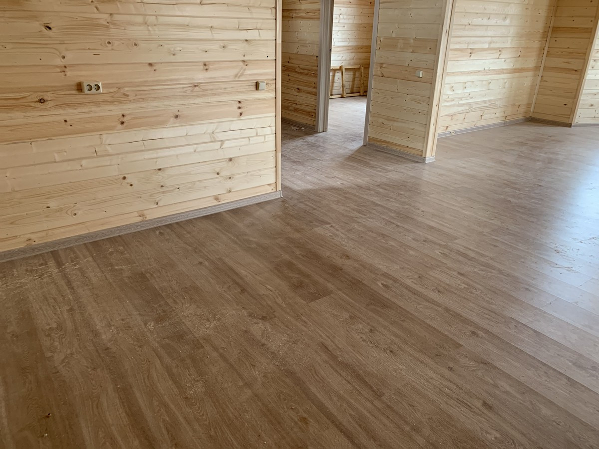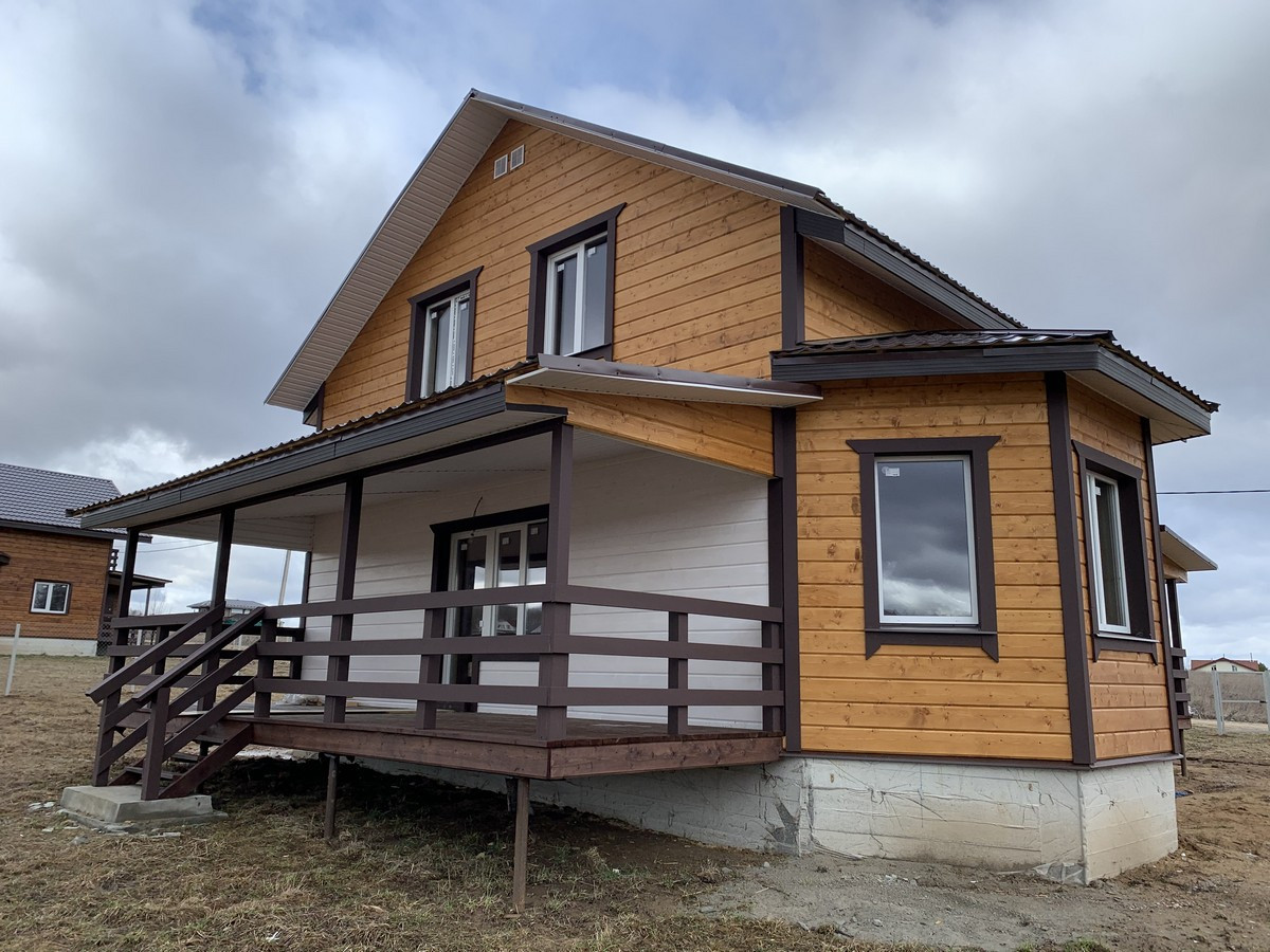 Дом с террасой 165 мкв из бруса 150 мм оба этажа , утеплен 10 см в два слоя, внутри обшит имитацией бруса, монолитный фундамент (плита) , кровля - металл черепица, пластиковые стеклопакеты поворотно откидные (3 стекла) , полы – ламинат/плитка.