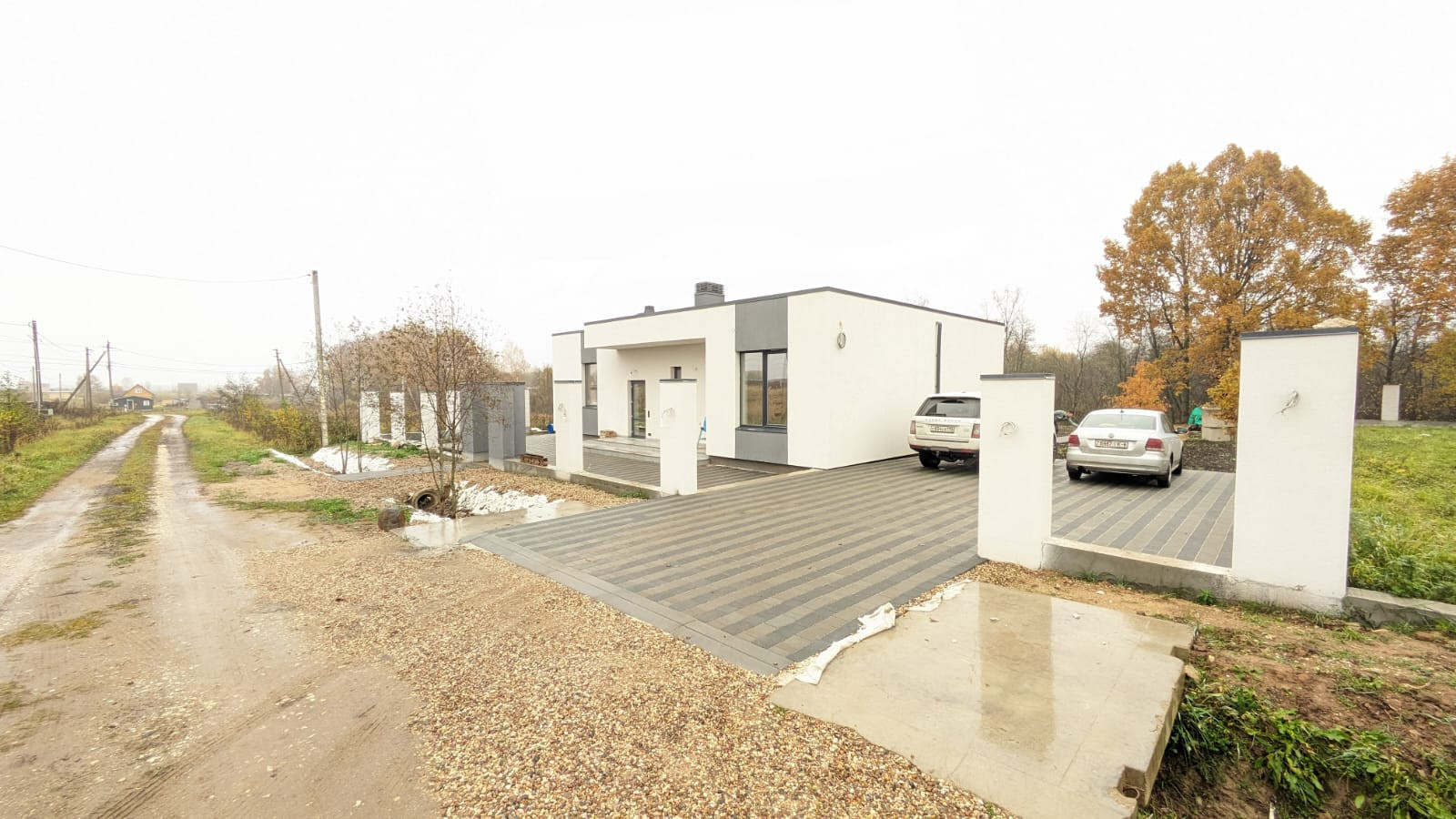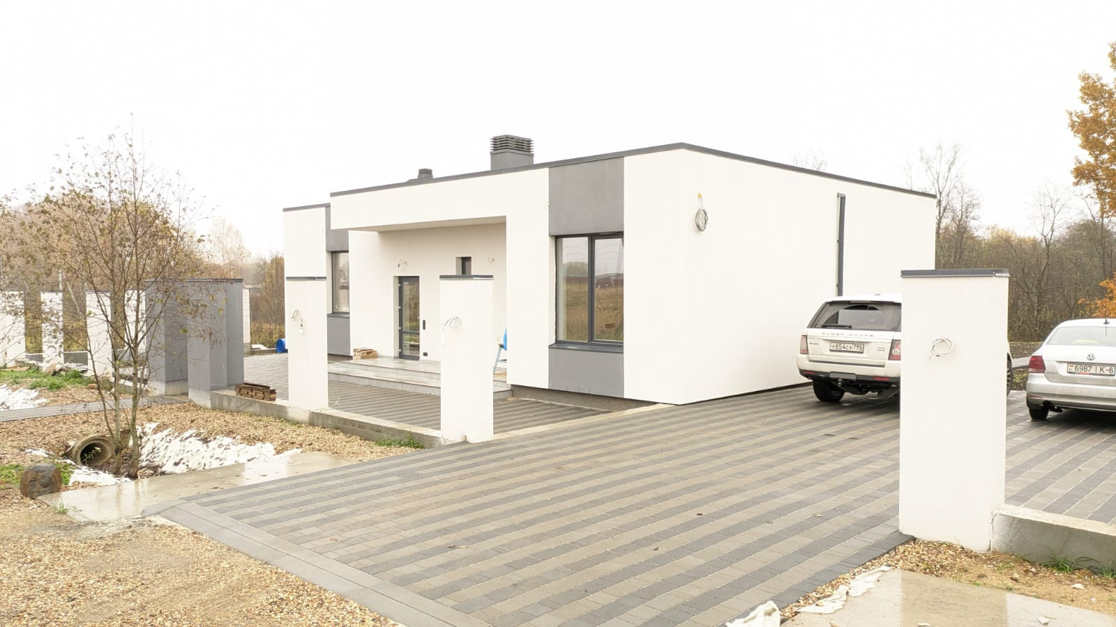 На участке предусмотрено: терраса, открытый навес для стоянки двух машин, а также помещение для хозяйственных нужд.