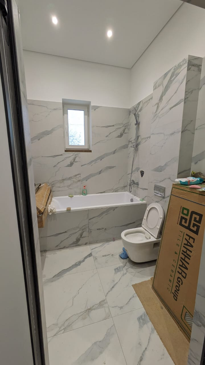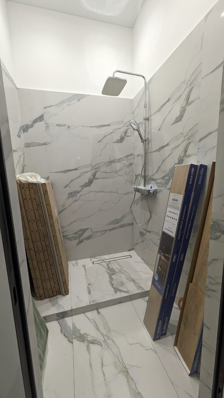 Качественная плитка и сантехника, пол - керамогранит (пол с подогревом, трубы - нержавейка). 2-х камерные стеклопакеты REHAU.