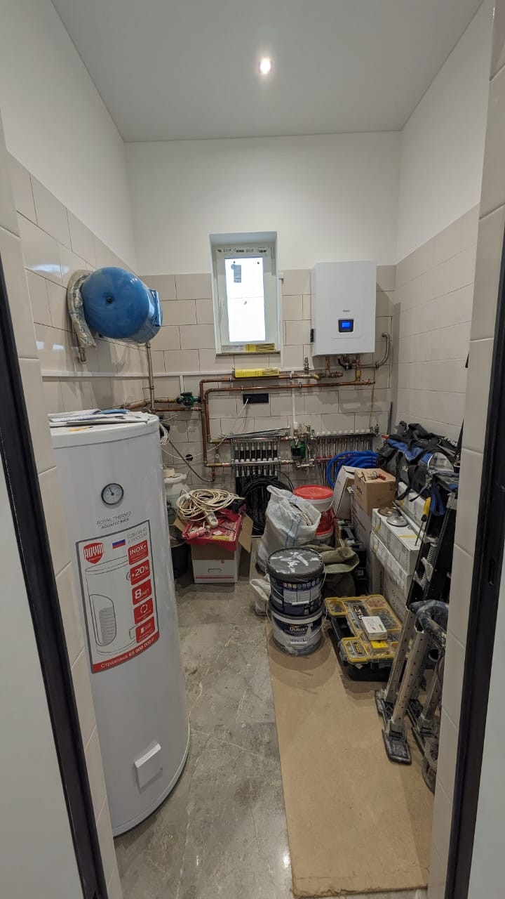 Отопление - газовое (установлен газовый котёл Baxi, Италия). Котельная, вентиляция выполнены строго по нормам. Газификация планируется в 2024г., работы по подведению уже ведутся.