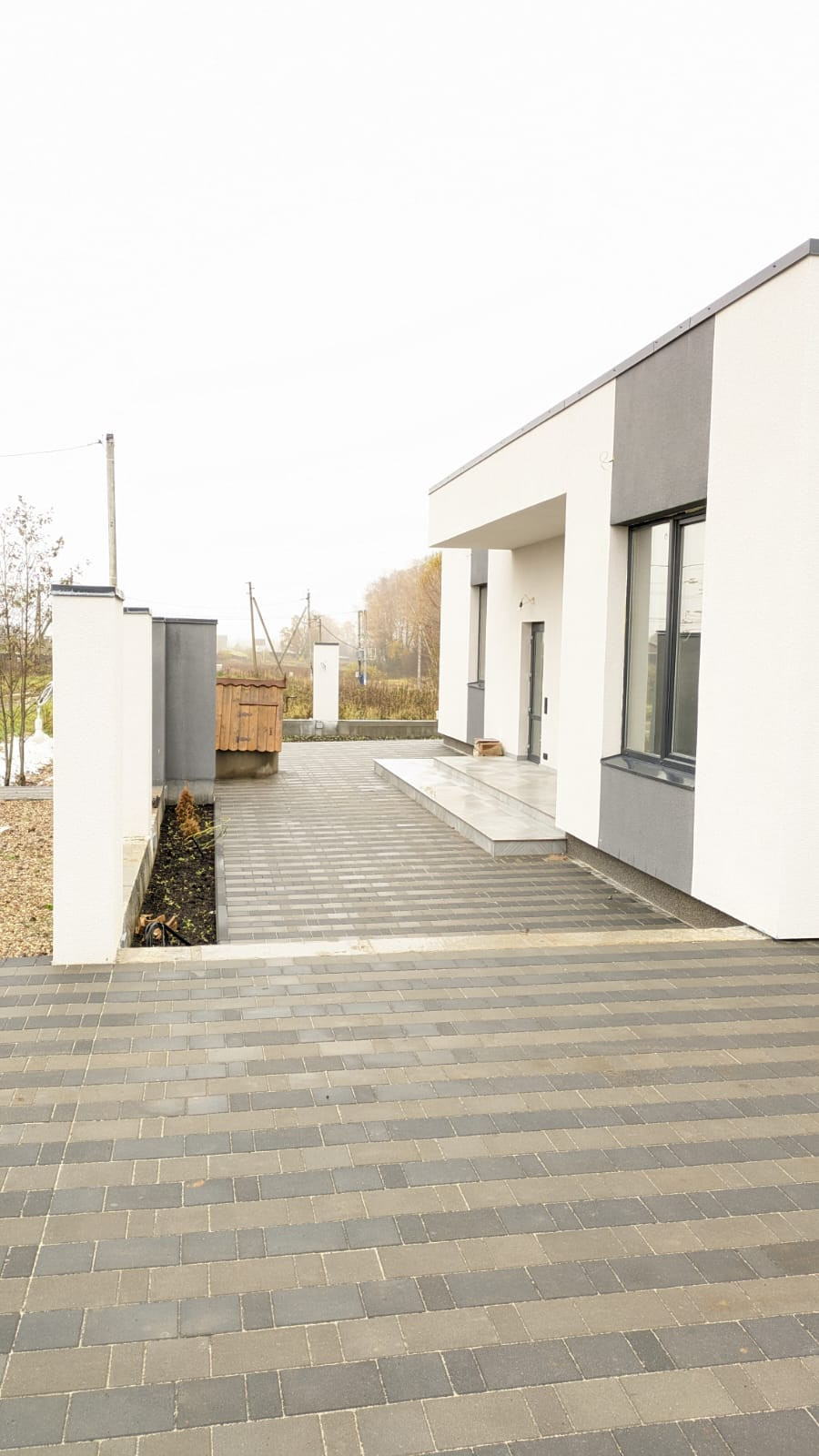 Дорожки выложены бетонной вибропрессованной брусчаткой, есть уличное освещение, подсветка фасада.