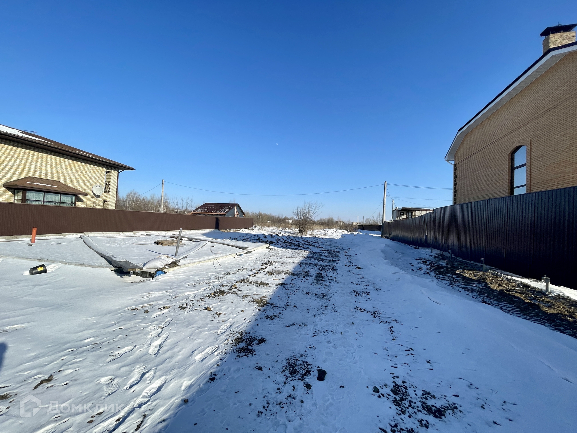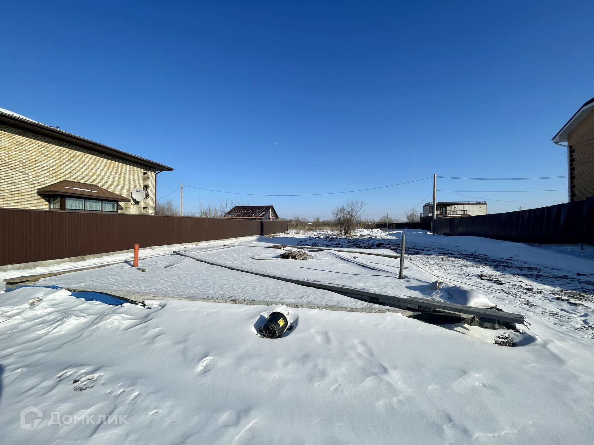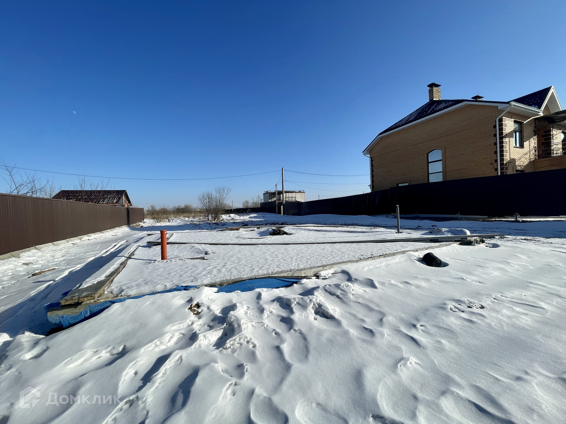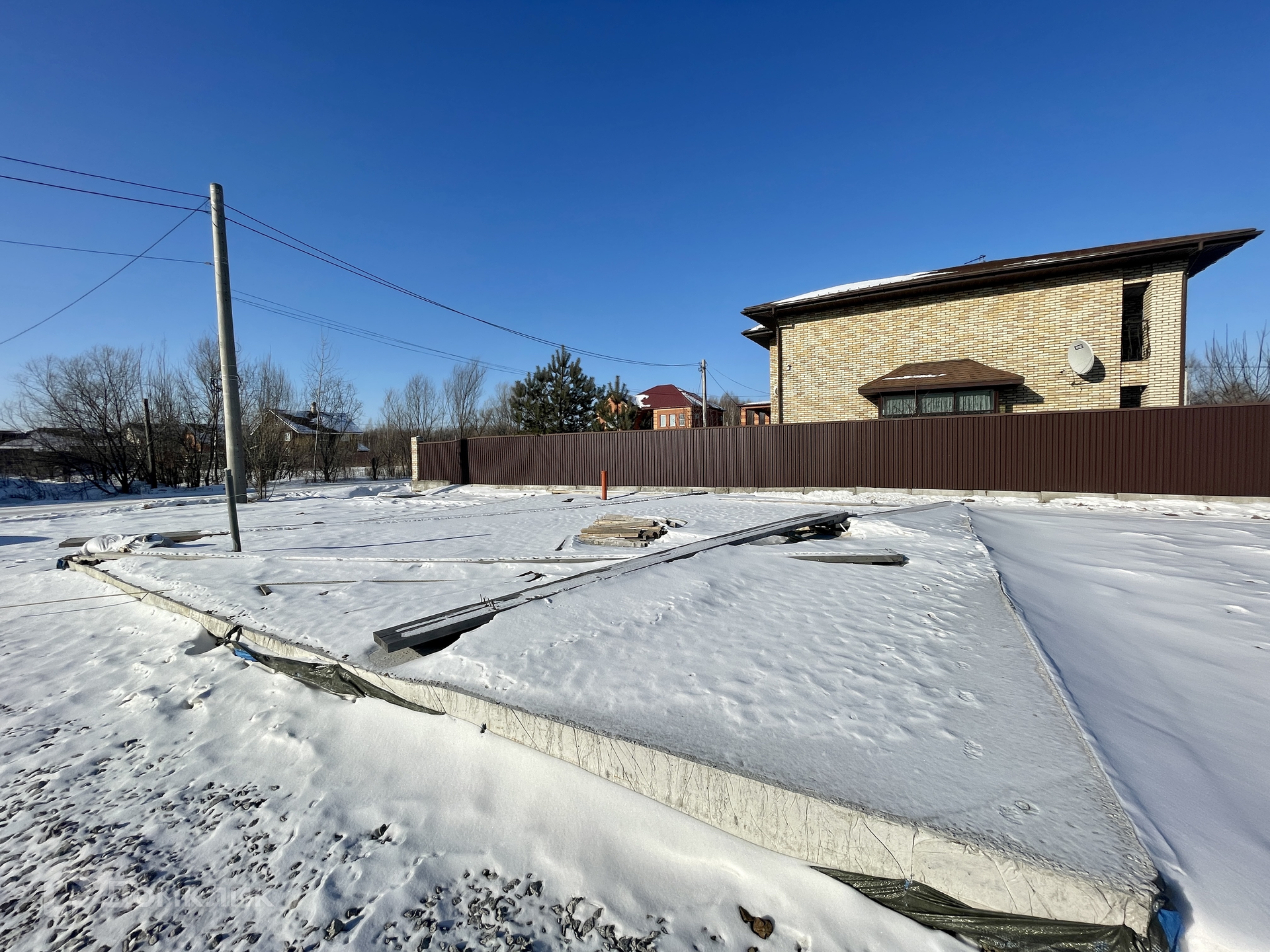 Участок отсыпан и выравнен, есть дренажная система, закопано шамбо 10 куб.м., установлена монолитная плита 9х9 м., подведено электричество.