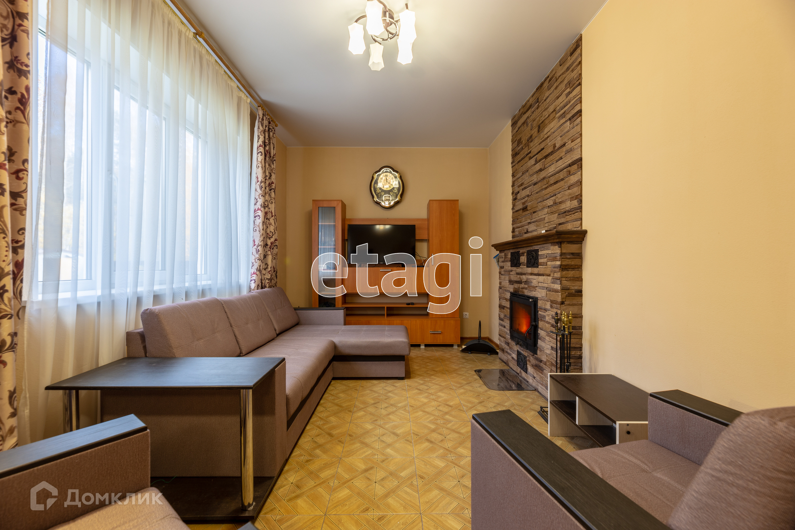 Вы заходите в просторную кухню-гостиную и сразу влюбляетесь в нее: здесь можно полюбоваться игрой огня у камина, посмотреть телевизор, посидеть с чашечкой кофе на веранде, примыкающей к кухне.