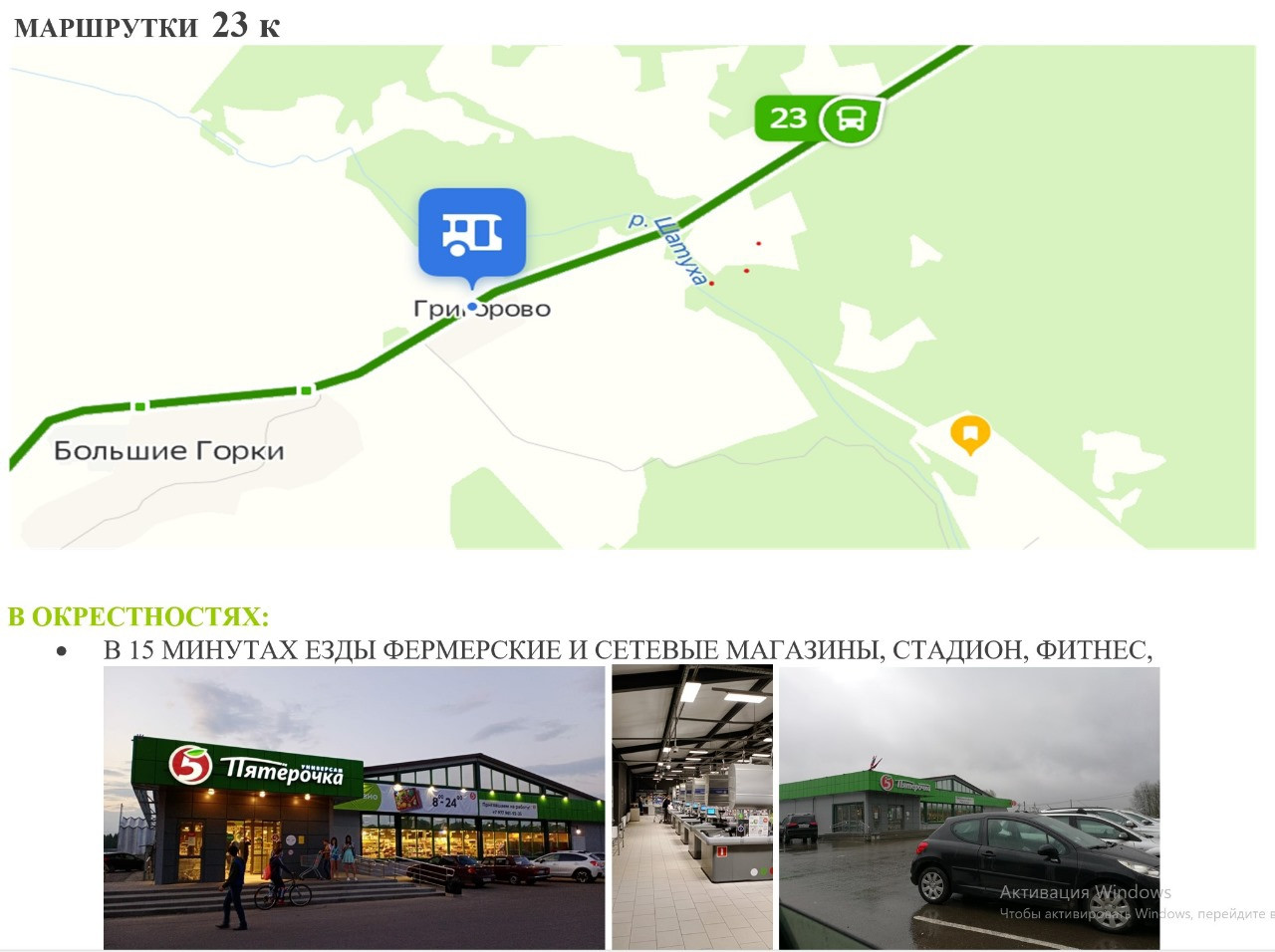 Участок расположе в поселке Сосновая роща..  Электричество на территории поселка полученных техусловия на газ. По границе с трех сторон окружен  в основном хвойным лесом, . По южной границе протекает интересная по ландшафту лесная река Шатуха, на берегу которой будет расположена территория отдыха с прудом, пляжем, спортивной и детской площадкой. Всего за час с небольшим можно доехать на автомобиле от МКАДа ( 77 км по Киевскому или 79 Минскому шоссе) .В районе много сетевых магазинов Лента, Дикси, Пятерочка, фермерские продукты, стройматериалы, современный бассейн, стадион, рестораны, др.Приятные соседи поселка физического института академии наук;