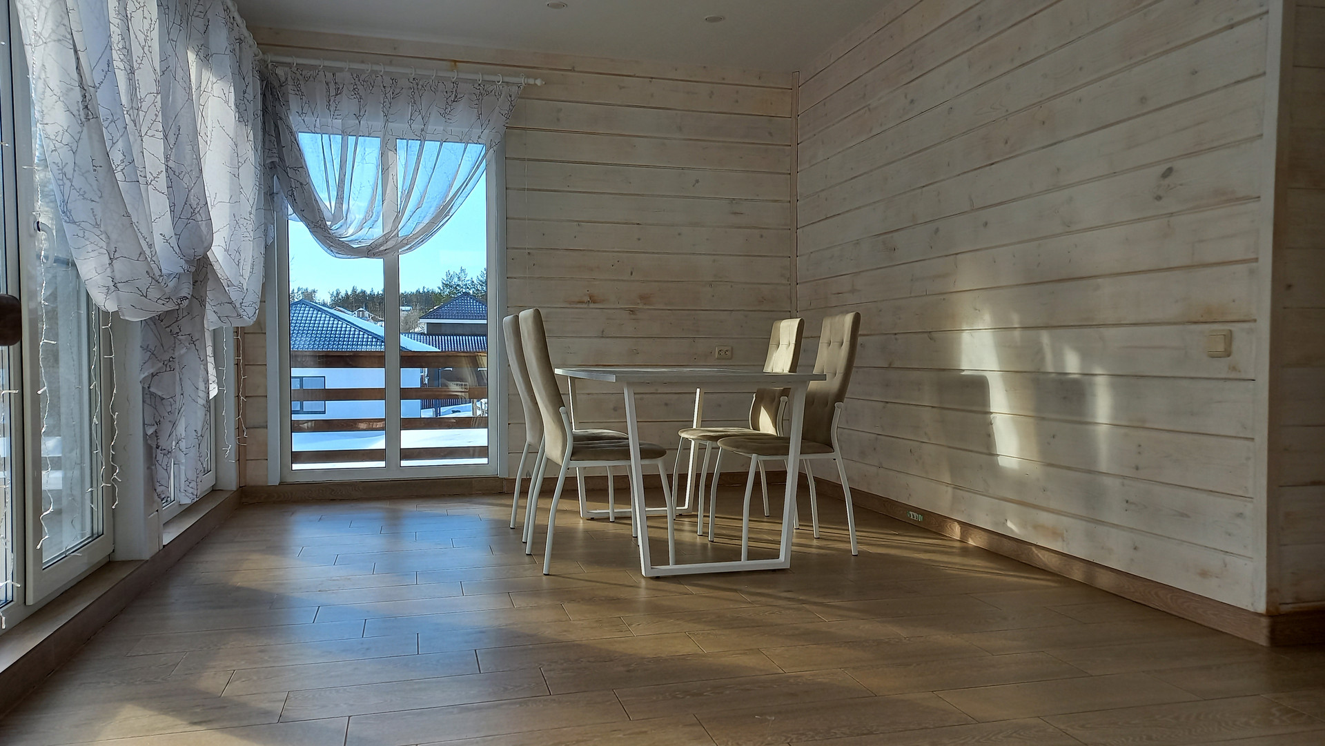 Внутренняя отделка стен выполнена имитацией бруса, полы на 1 этаже – керамическая плитка, полы на 2 этаже – ламинат. На 1 этаже - натяжной потолок, на 2 этаже потолок обшит имитацией бруса по стропилам. Окна - Металлопластик Rehau (профиль 70)