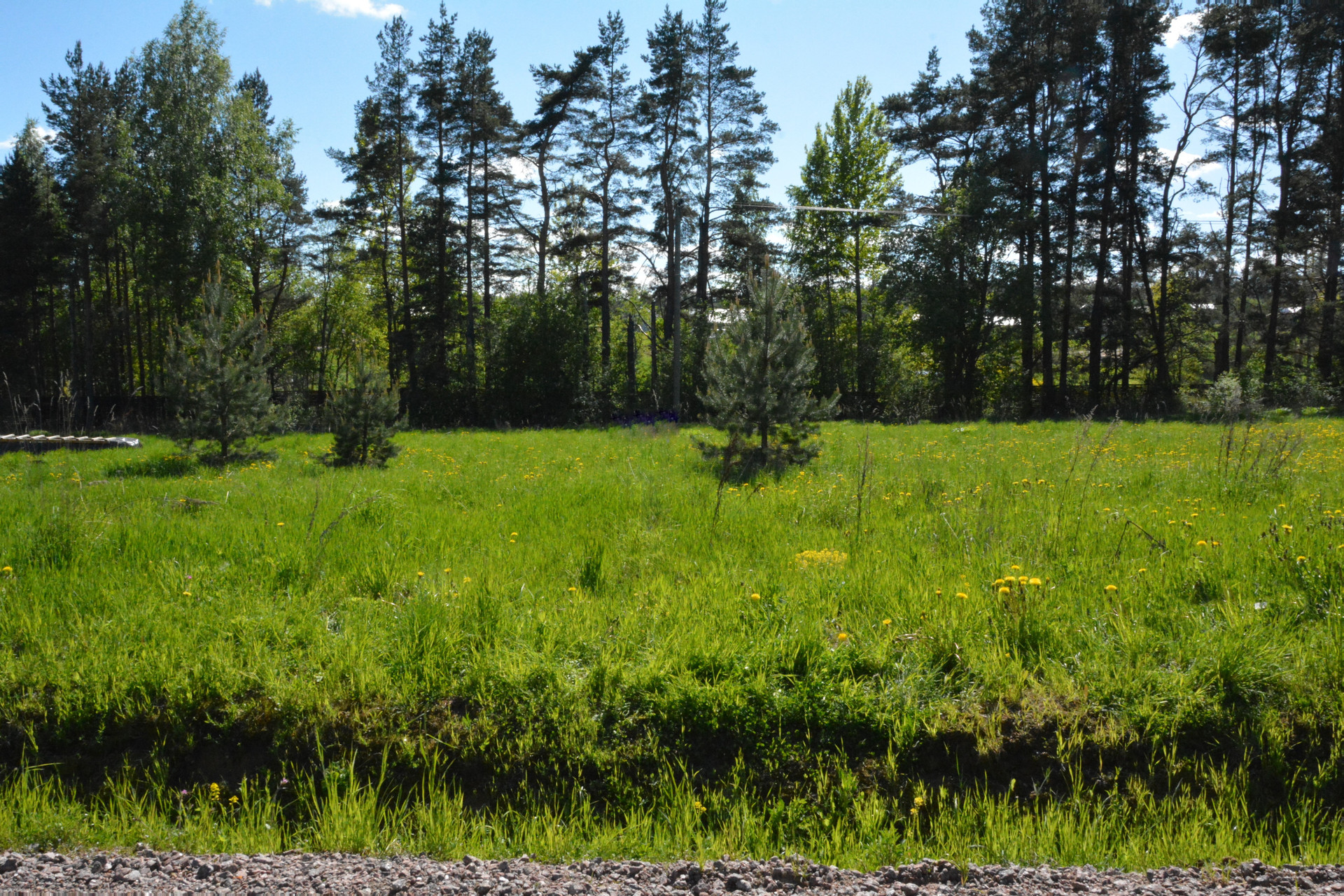 Участок прямоугольной формы, сухой, ровный. Весной не затапливает, после дождя луж нет. Со стороны подъезда глубокая ливневая канава. В дальней части участка лесополоса, отделяющая участок от проселочной дороги. На участке три пышные молодые сосны.