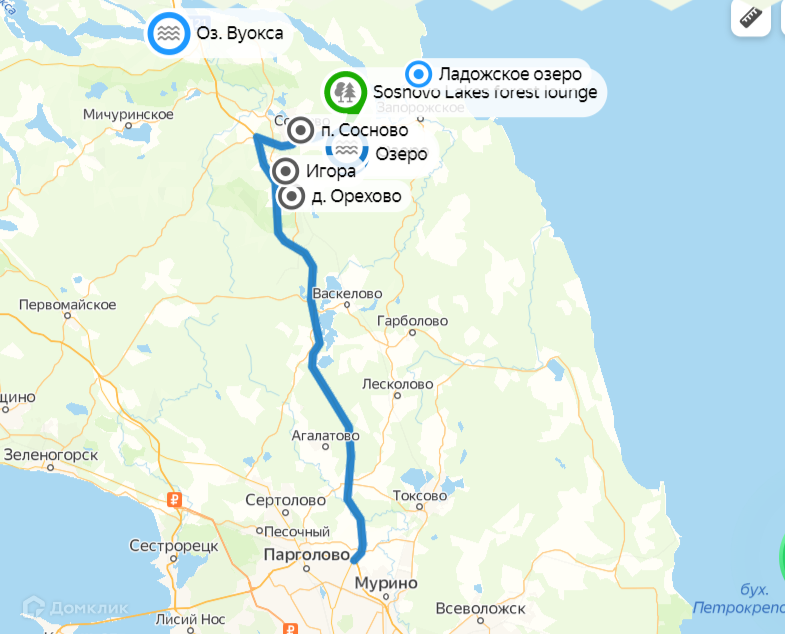 ОКРУЖЕНИЕ: Коттеджный поселок располагается рядом с Сосново, развитая инфраструктура, магазины, банки, аптеки и доставки еды прямо в поселок. До жд станции 15 минут. Электрички ходят постоянно.  До ближайшего магазина в поселке 4 минуты езды, до аптечного пункта 6 минут. Рядом горнолыжный курорт Игора, множество озёр и трасса Формула-1.