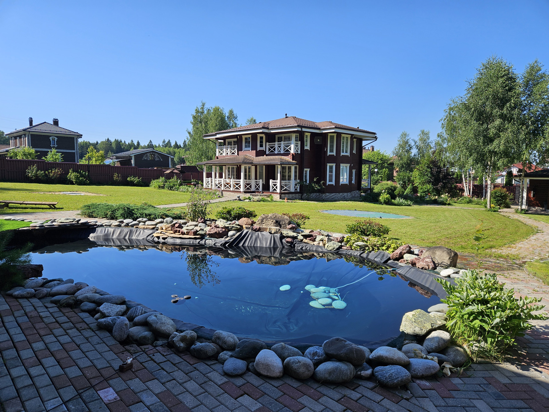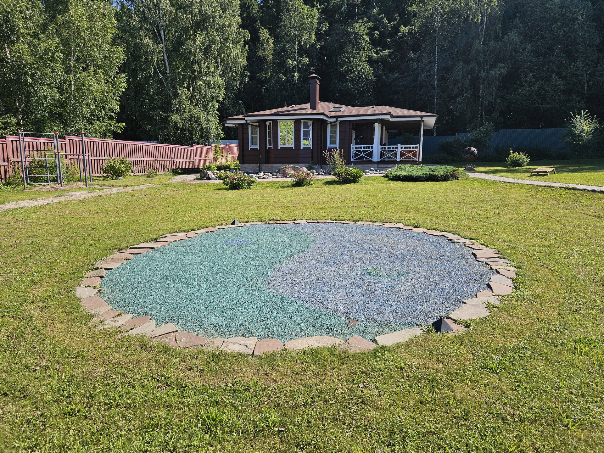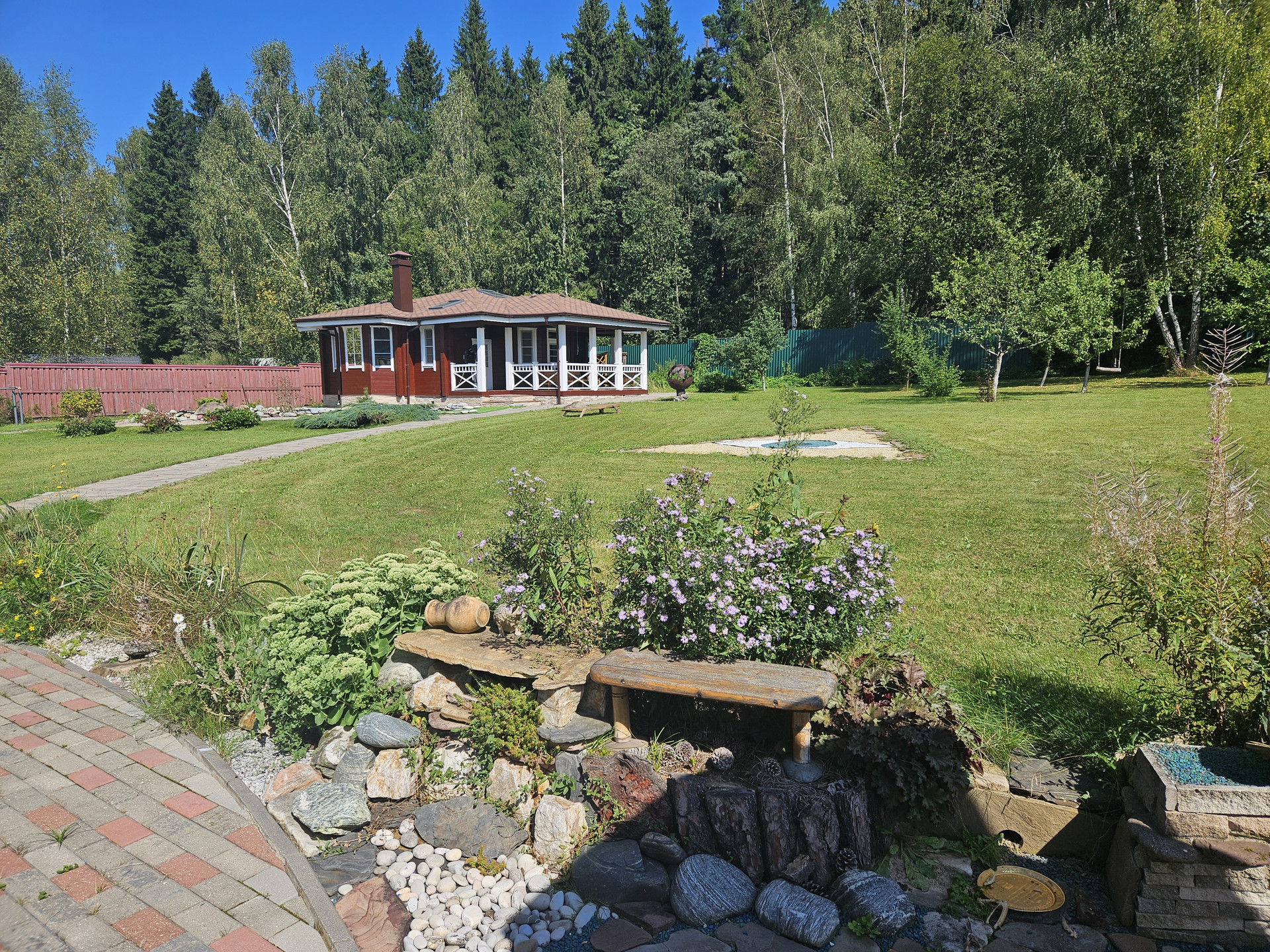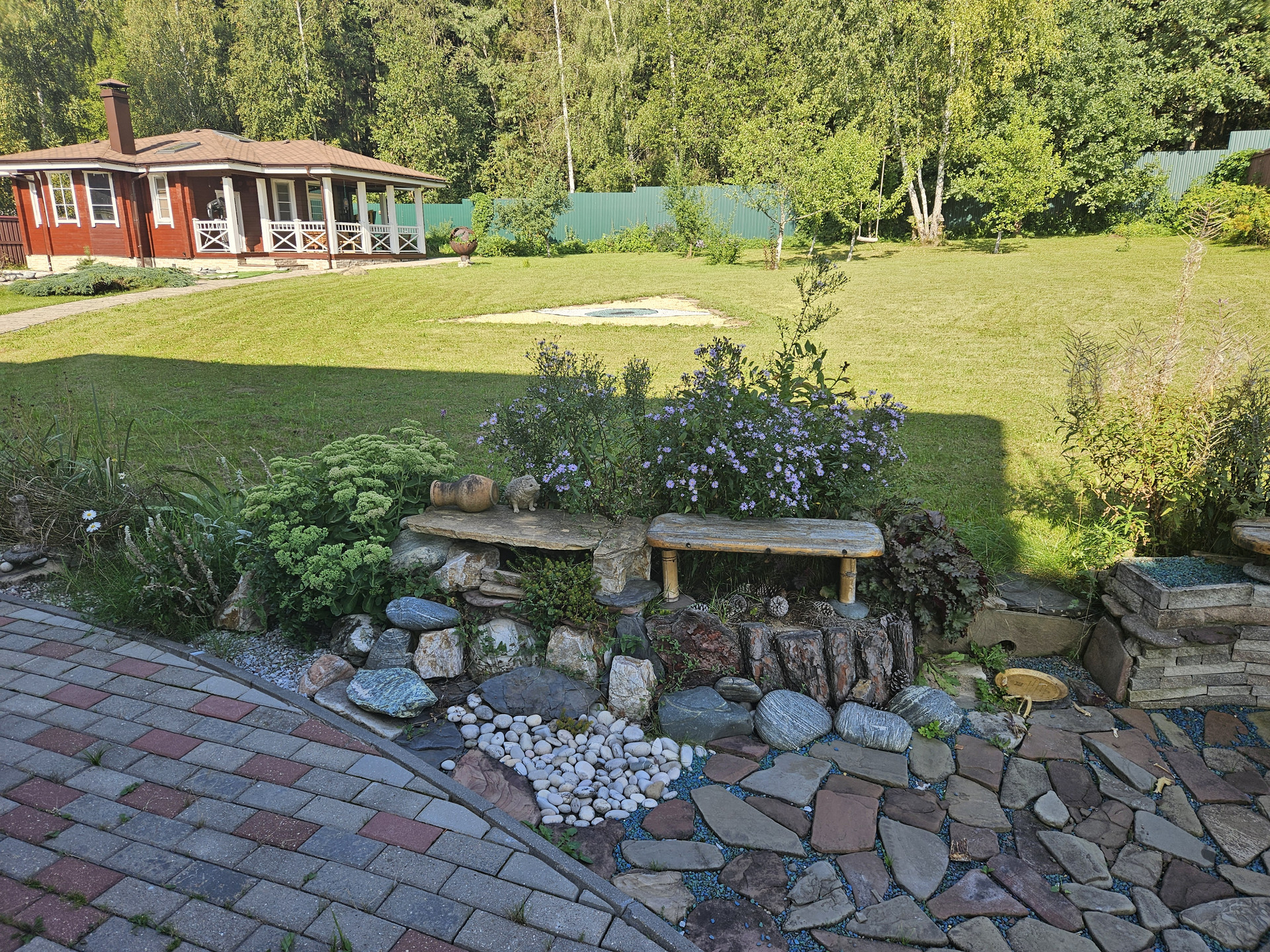 Зона барбекю, пруд, зона отдыха, садовые качели в окружении зелени, костровая сфера для созерцания огня, выложенная натуральным камнем для пожарной безопасности. Сарай для хранения вещей окрашен в общем стиле строений и установлен в малоземетной зоне. Содержит полки с шкафы для хранения авторезины, варенья, сезонных вещей, детских игрушек и др.