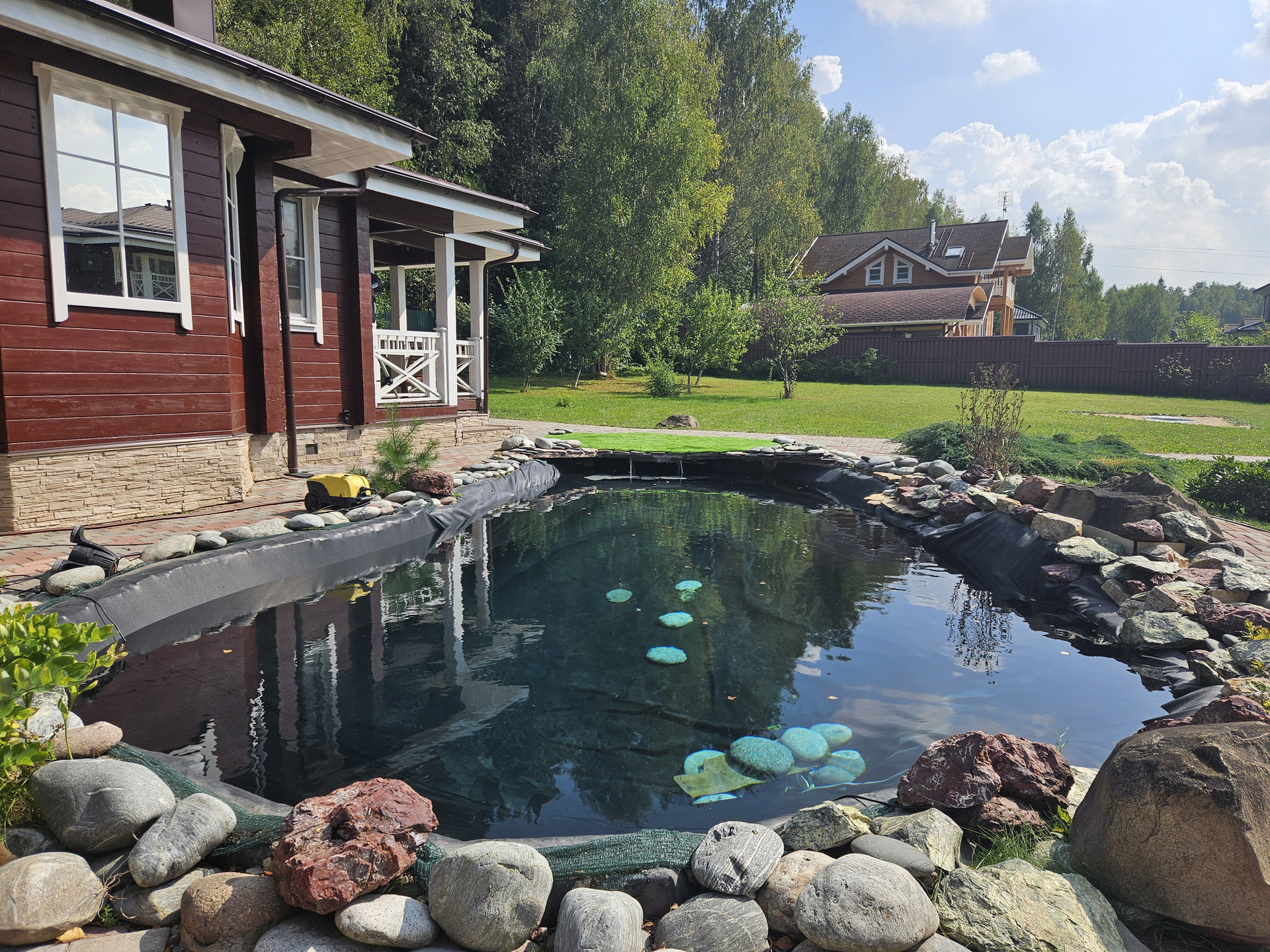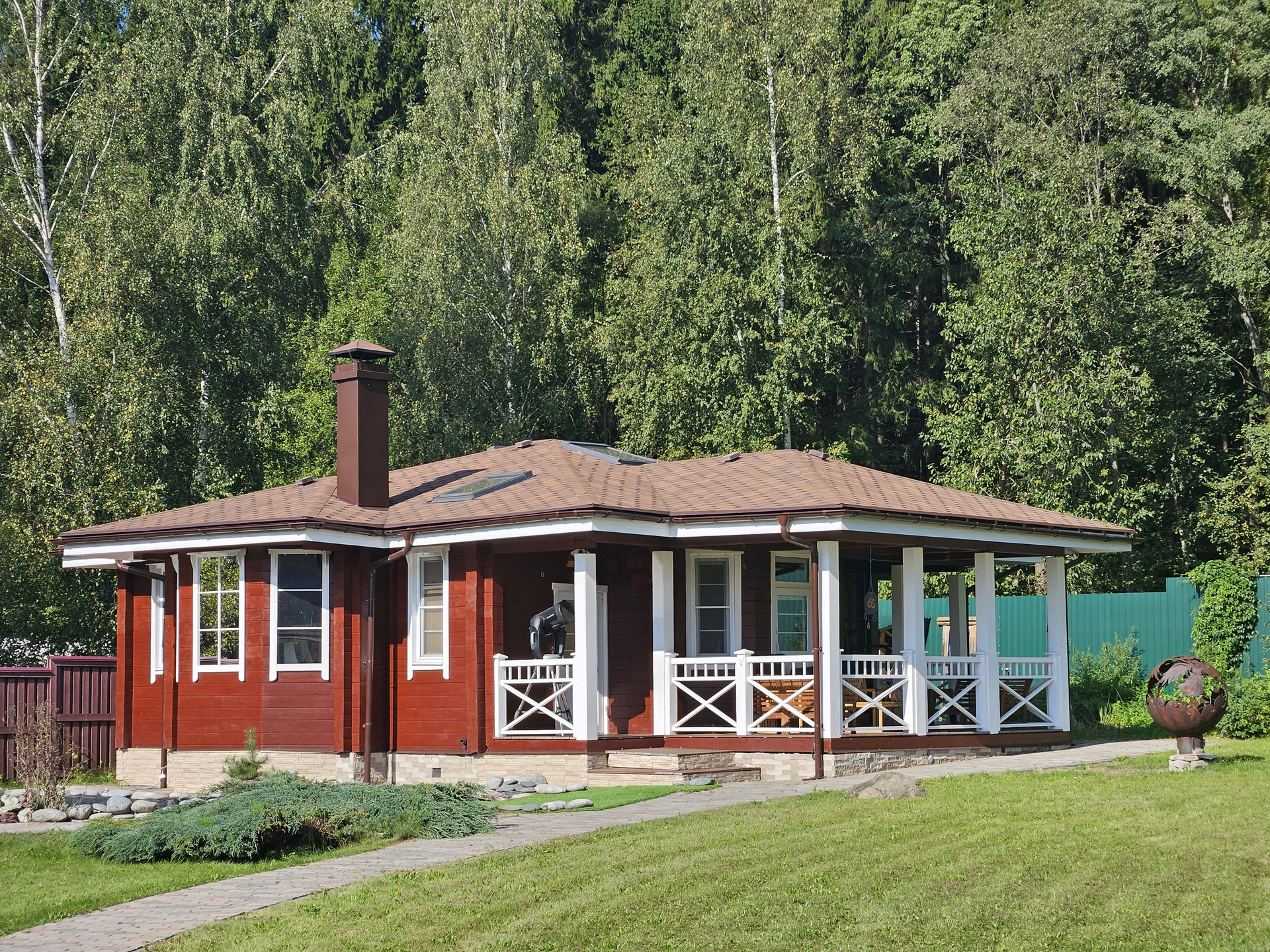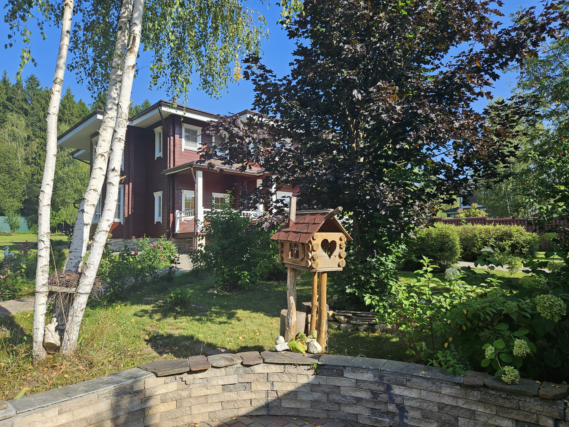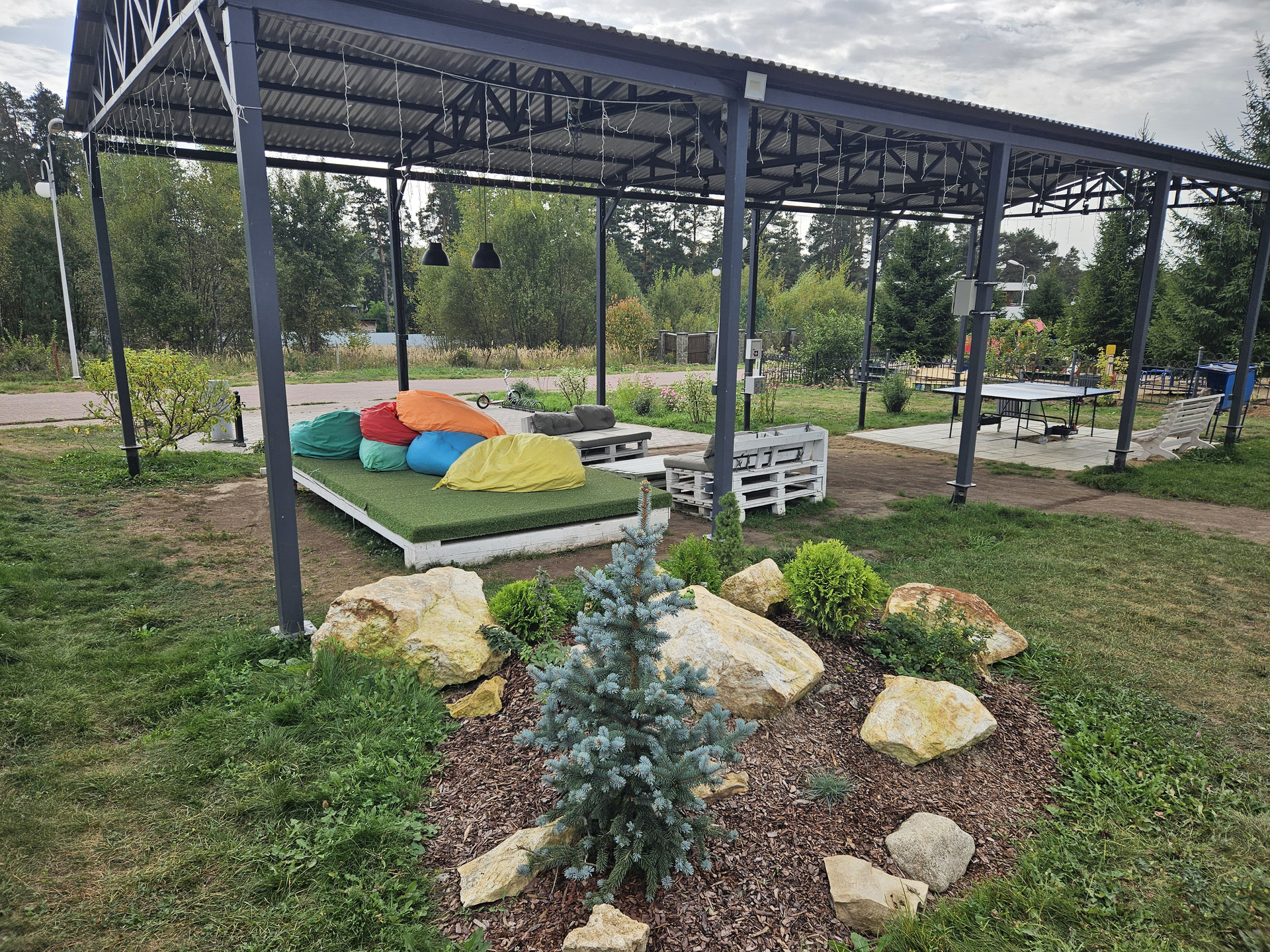 Зона барбекю, пруд, зона отдыха, садовые качели в окружении зелени, костровая сфера для созерцания огня, выложенная натуральным камнем для пожарной безопасности. Сарай для хранения вещей окрашен в общем стиле строений и установлен в малоземетной зоне. Содержит полки с шкафы для хранения авторезины, варенья, сезонных вещей, детских игрушек и др.