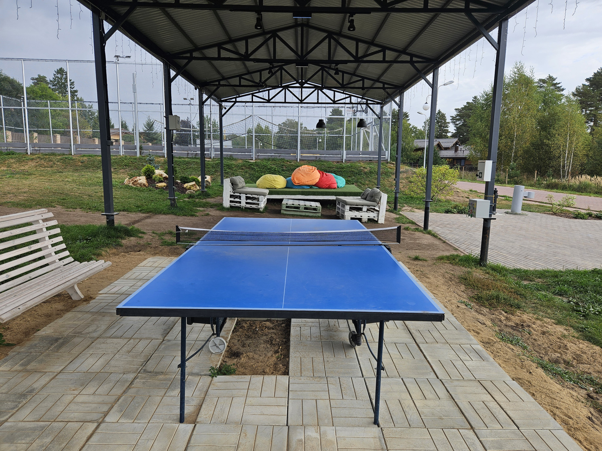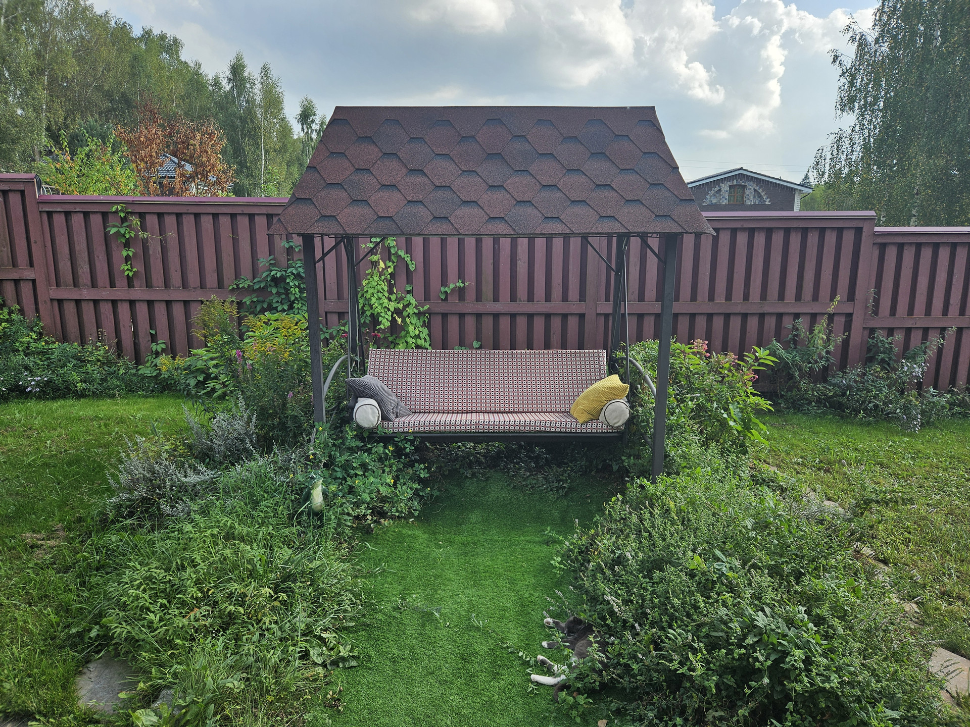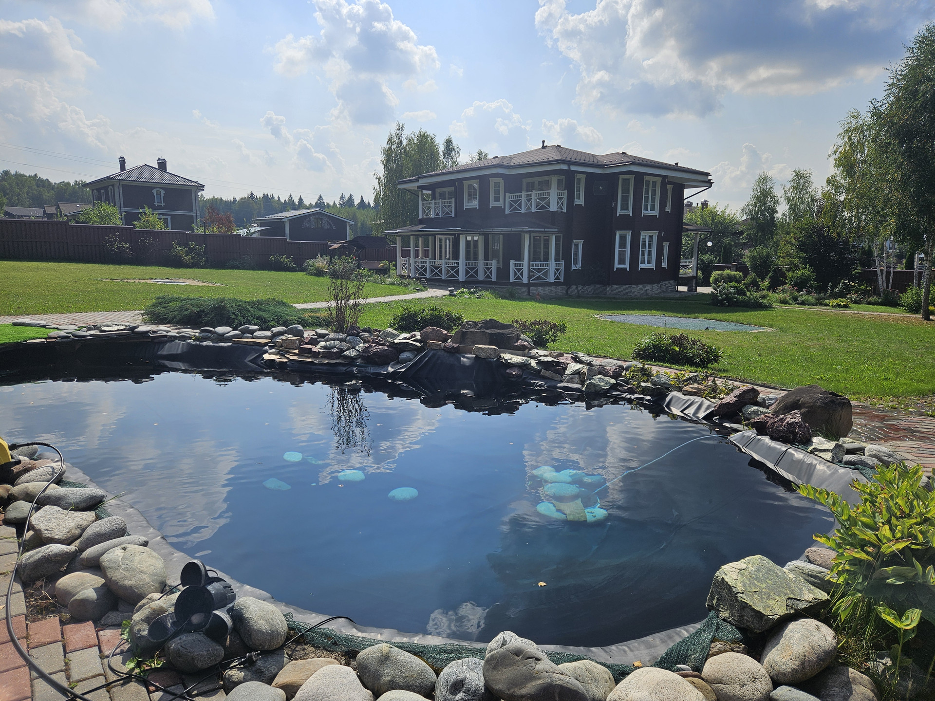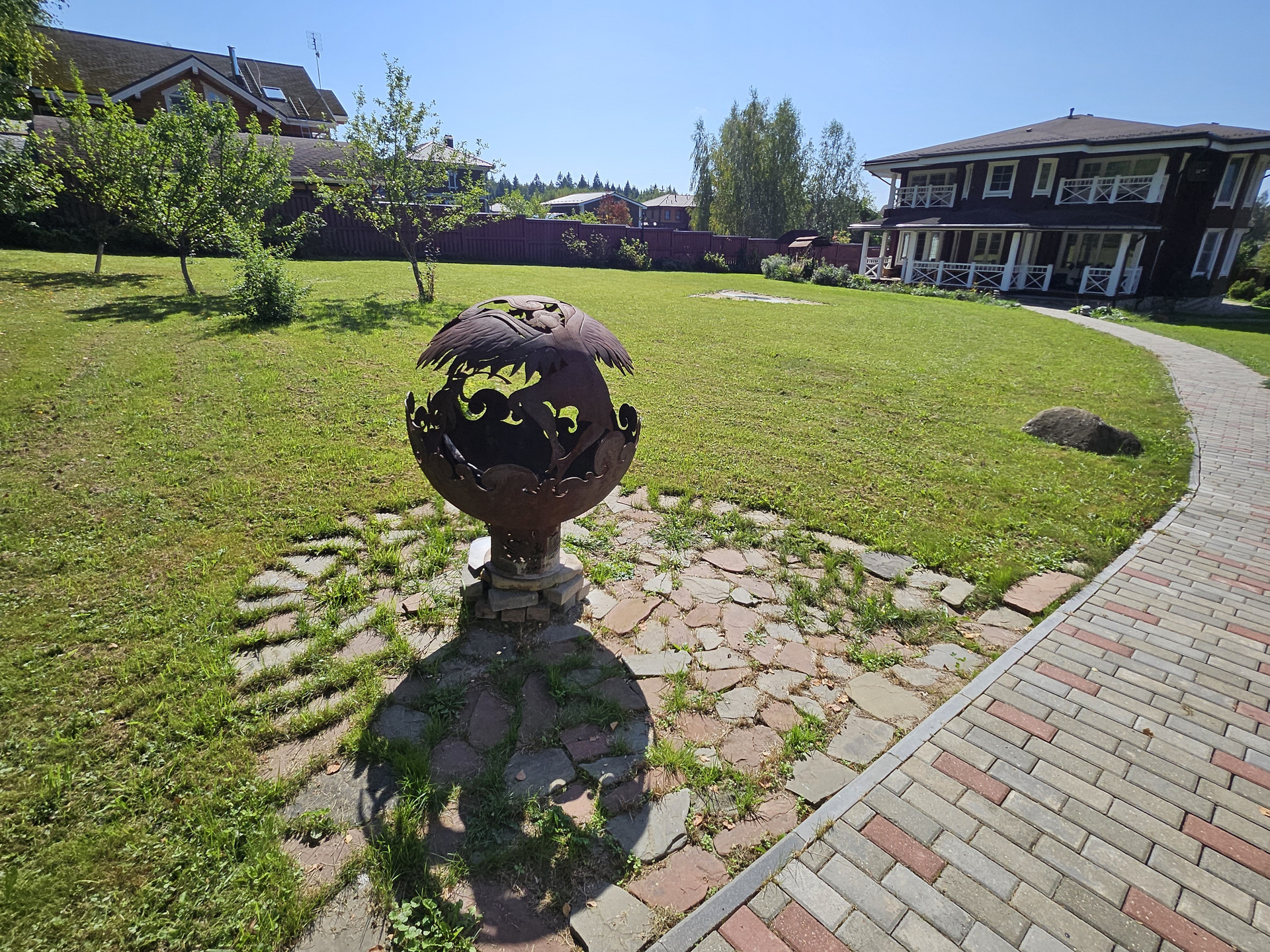 Зона барбекю, пруд, зона отдыха, садовые качели в окружении зелени, костровая сфера для созерцания огня, выложенная натуральным камнем для пожарной безопасности. Сарай для хранения вещей окрашен в общем стиле строений и установлен в малоземетной зоне. Содержит полки с шкафы для хранения авторезины, варенья, сезонных вещей, детских игрушек и др.