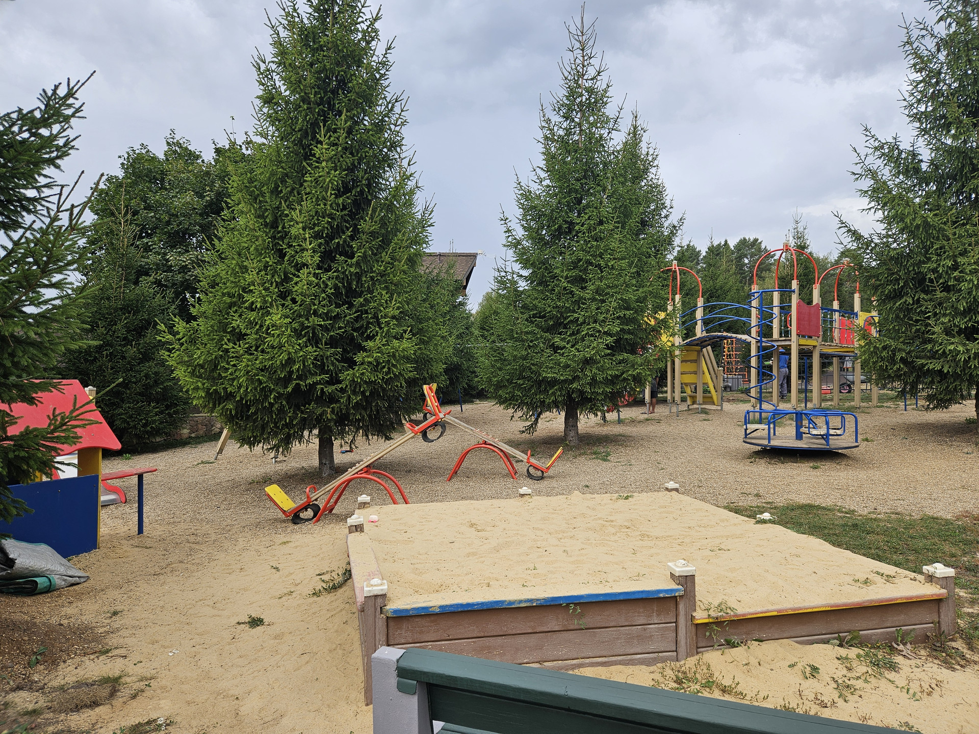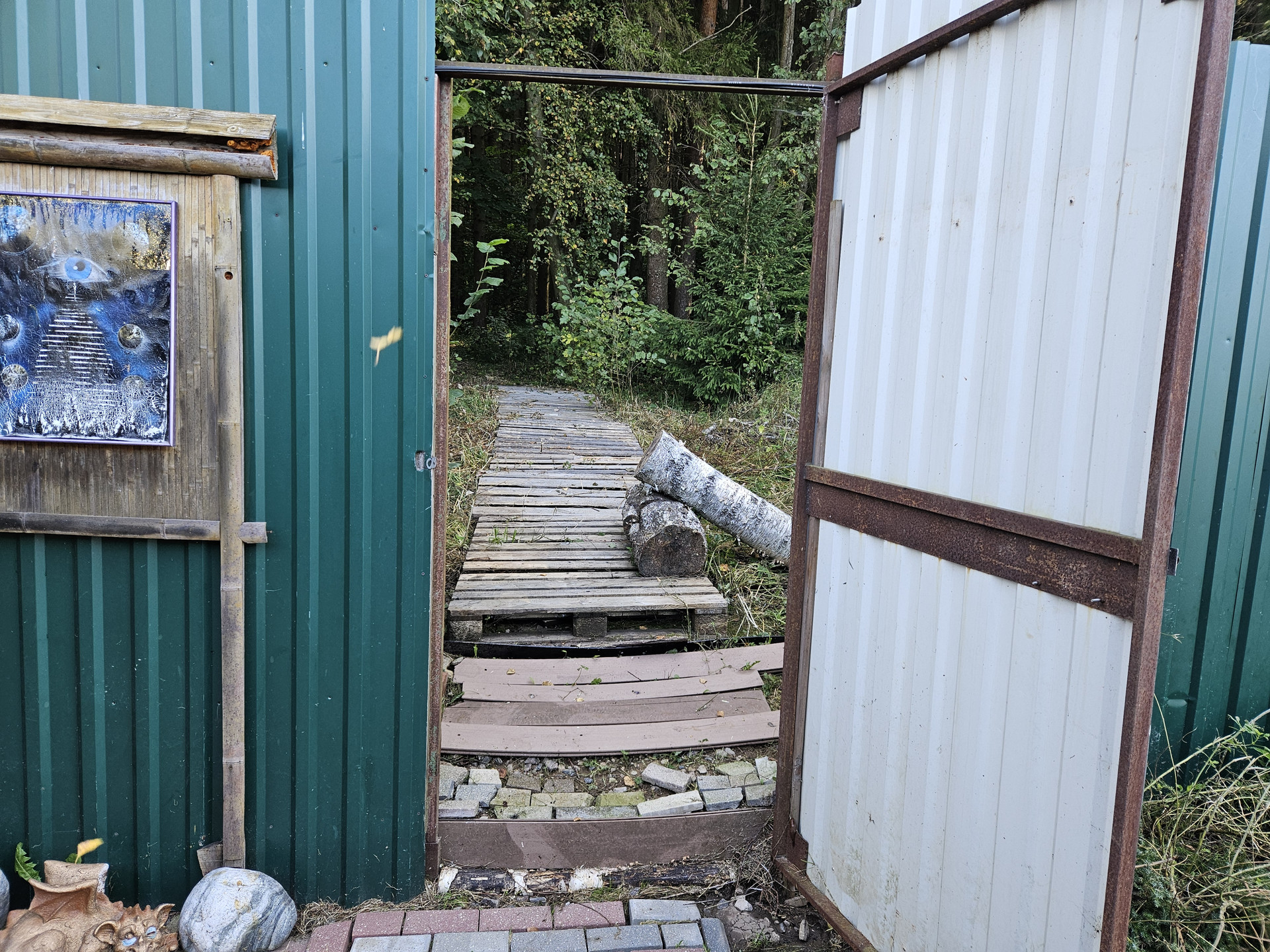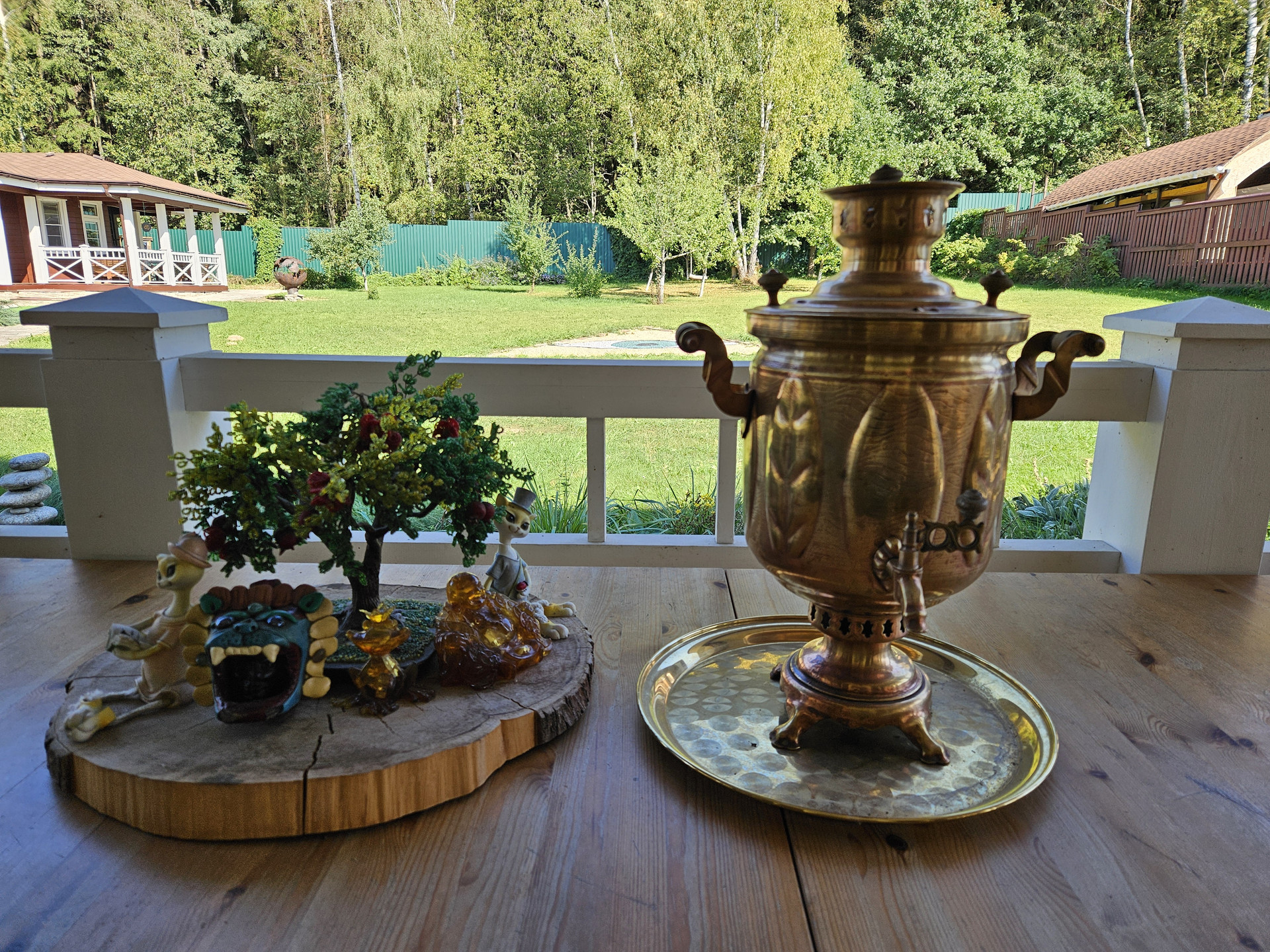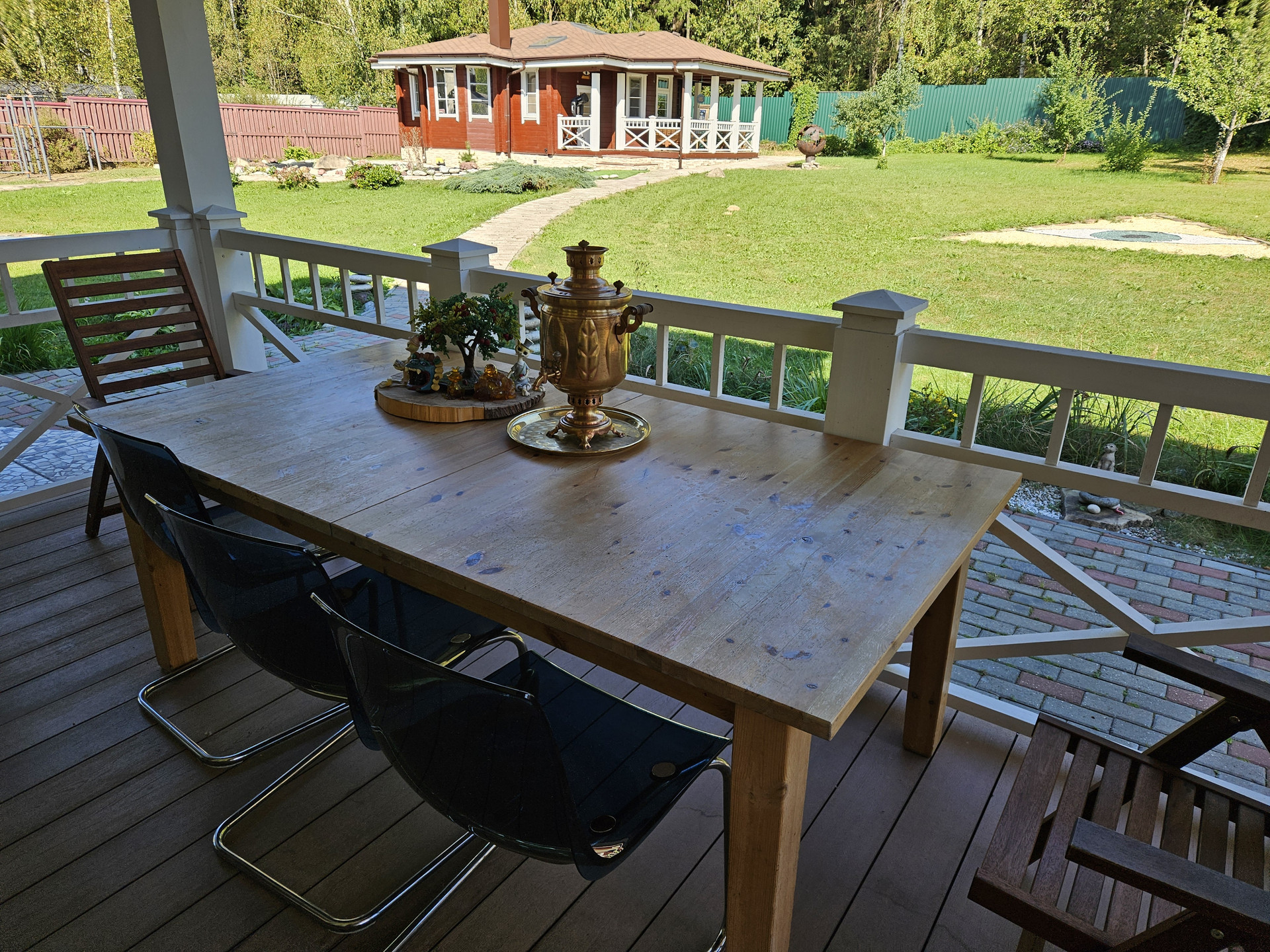Зона барбекю, пруд, зона отдыха, садовые качели в окружении зелени, костровая сфера для созерцания огня, выложенная натуральным камнем для пожарной безопасности. Сарай для хранения вещей окрашен в общем стиле строений и установлен в малоземетной зоне. Содержит полки с шкафы для хранения авторезины, варенья, сезонных вещей, детских игрушек и др.