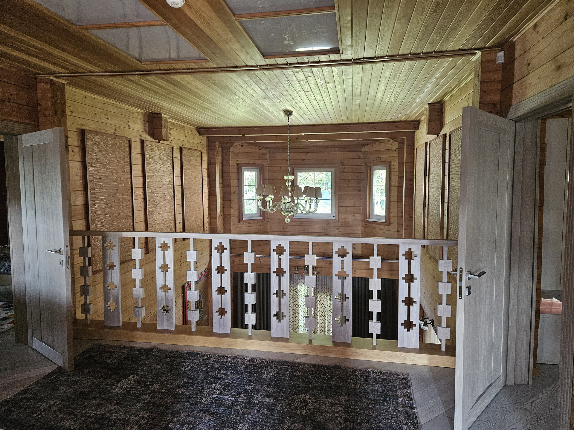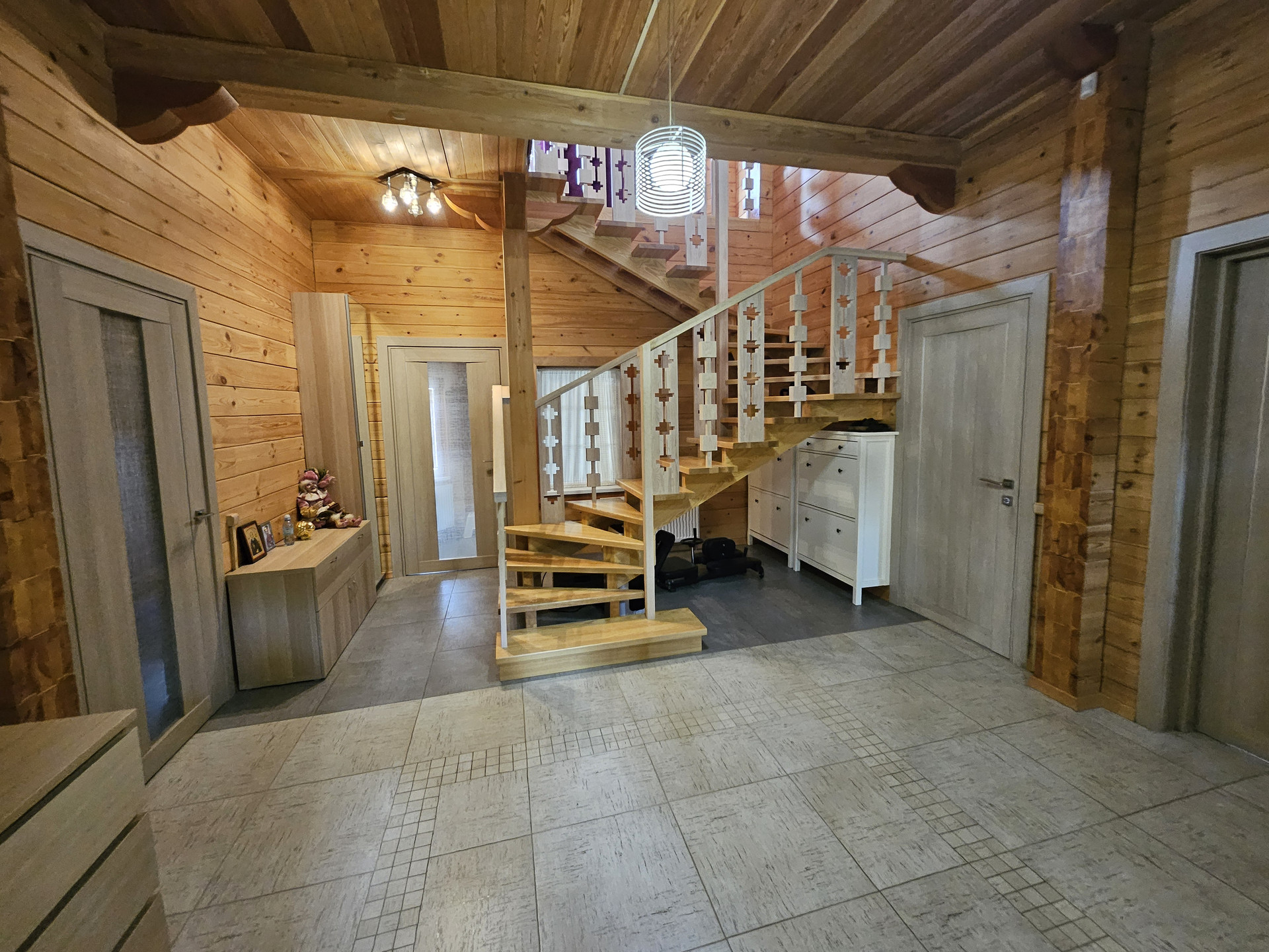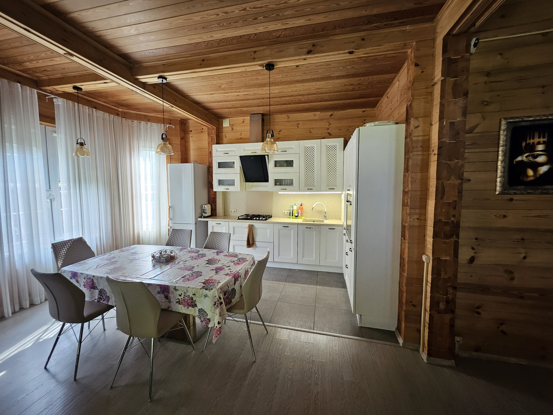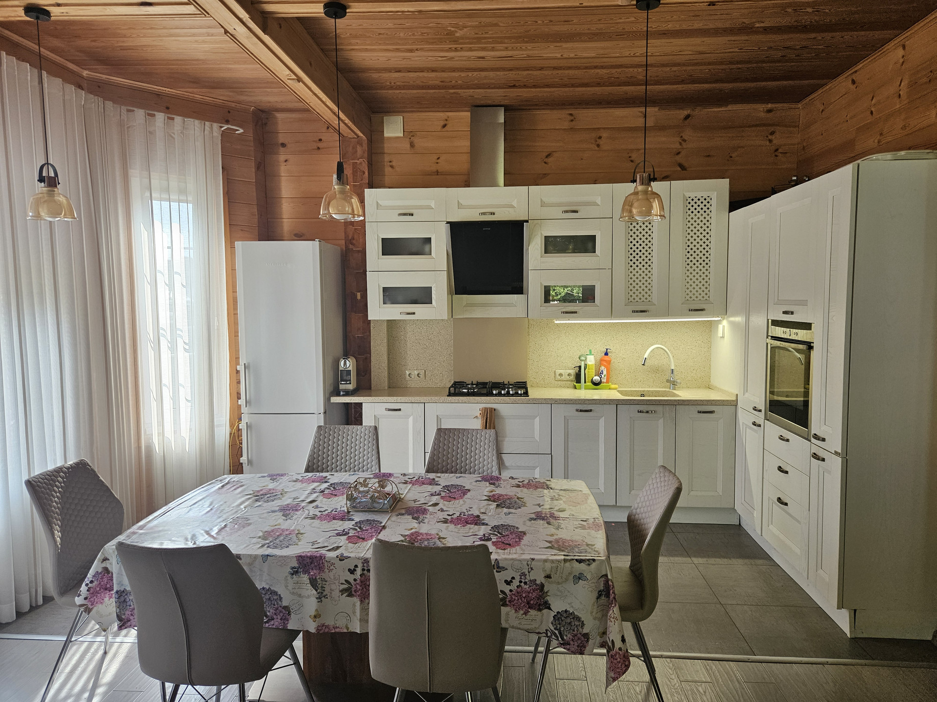 Потолки 3м, большие окна на первом этаже обеспечивают хорошее освещение. Кухонный гарнитур со встроенной техникой: варочная индукционная панель, духовой шкаф, посудомоечная машина, санитарный измельчитель, подсветка. Удобная лестница из листвинницы.