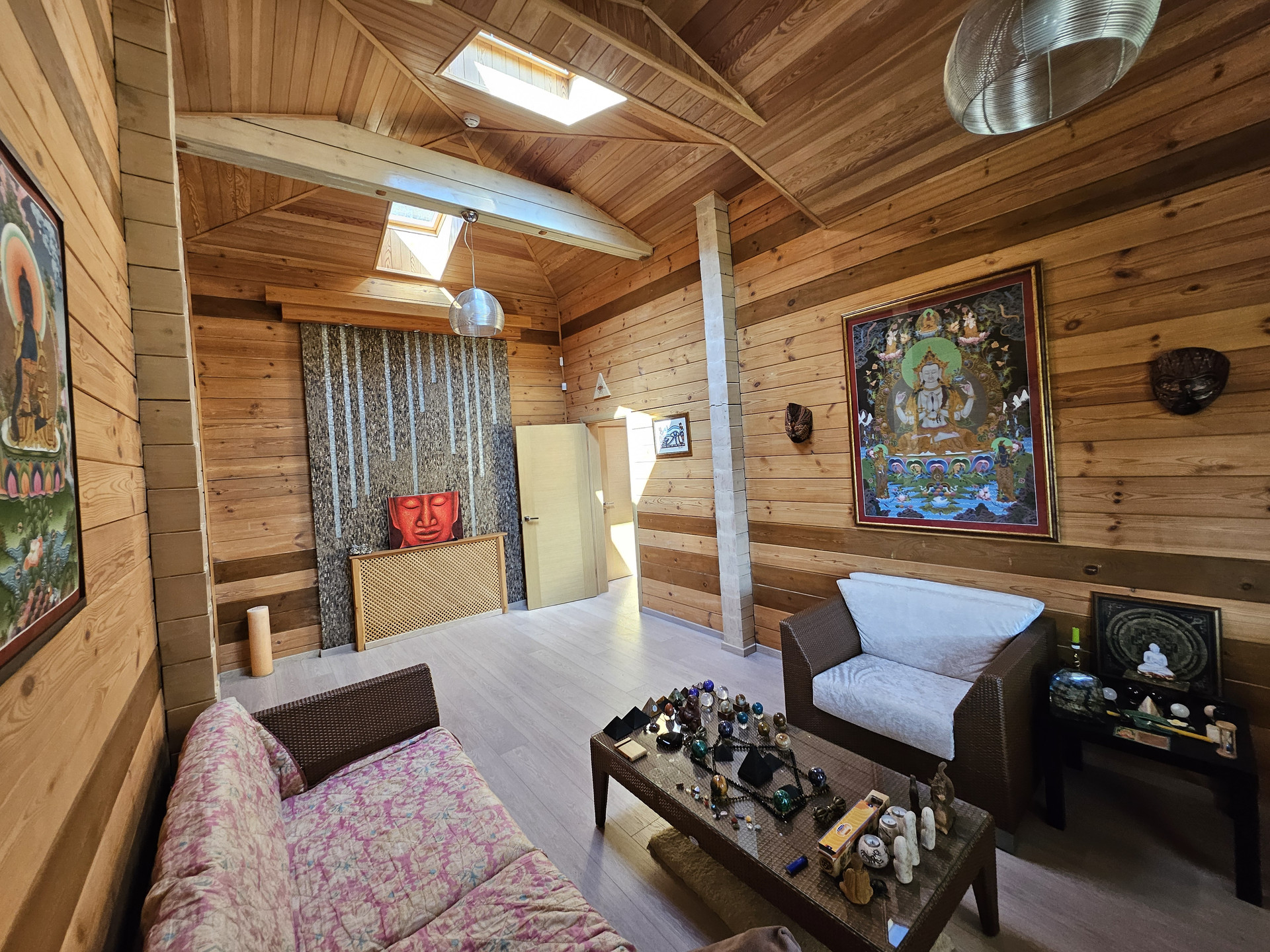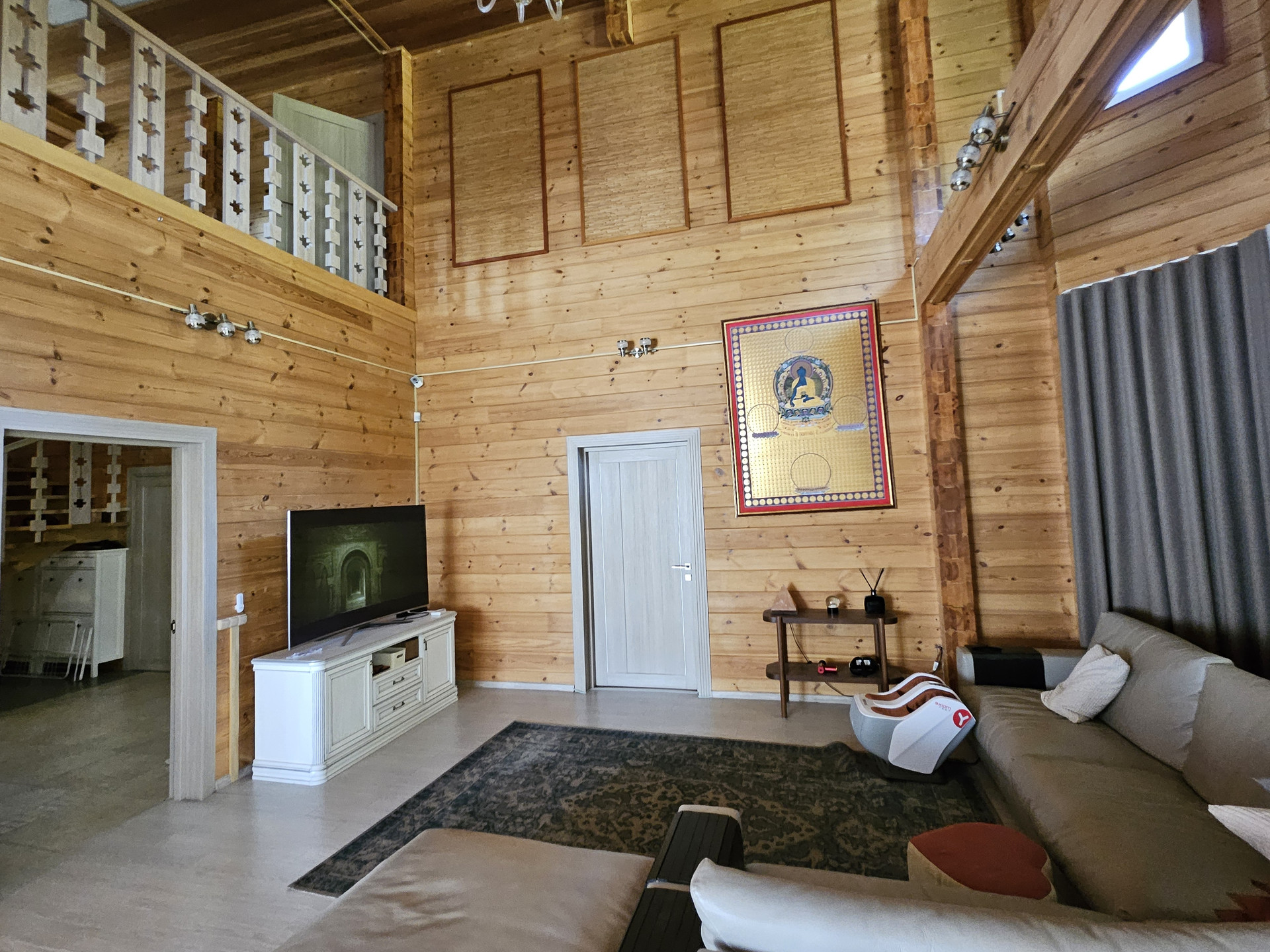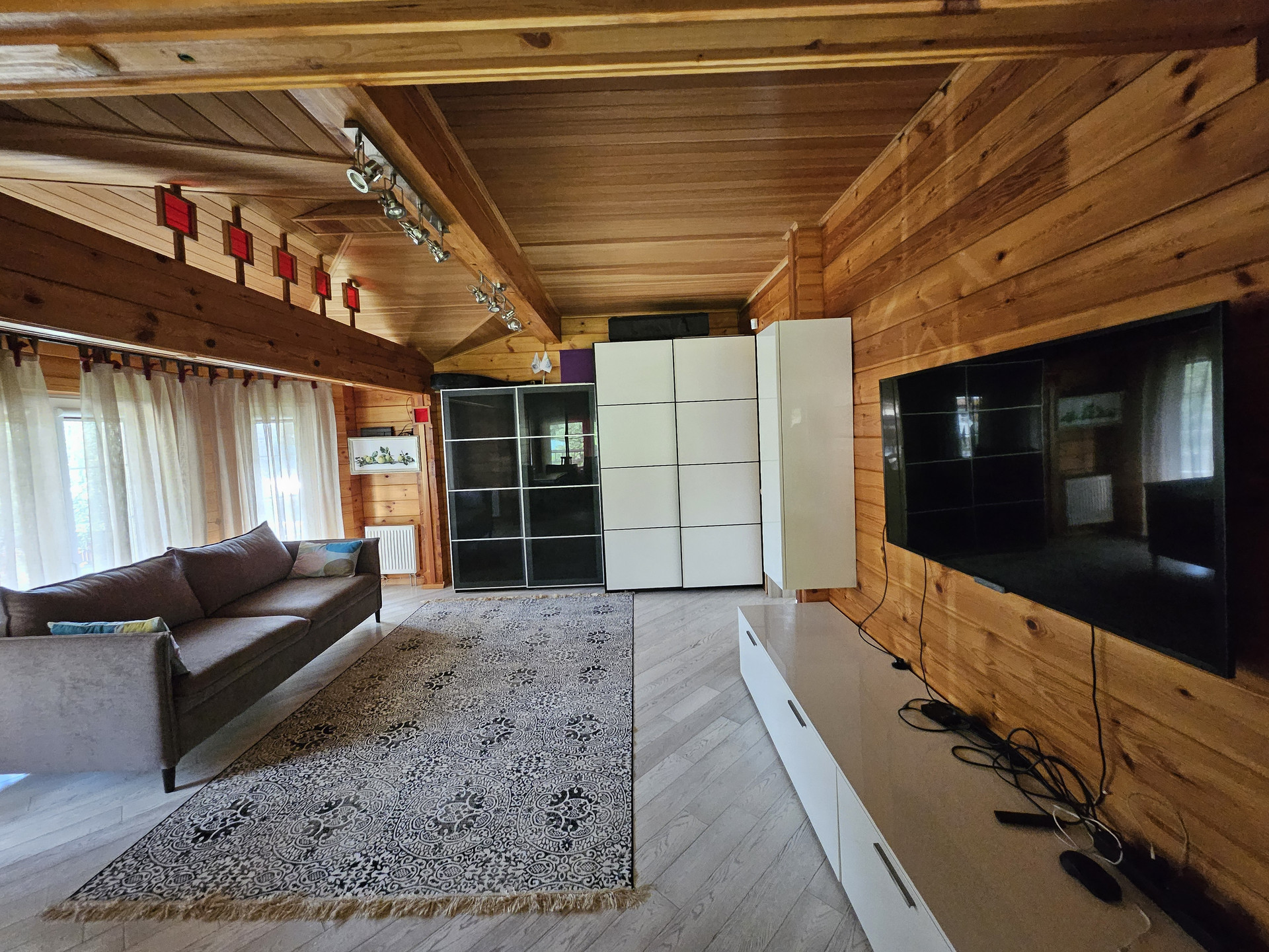 1й ЭТАЖ: просторная кухня-гостиная со вторым светом (8 метров потолки), две спальни, санузел с душевой кабиной, оборудованная комната для хранения вещей, котельная, постирочная, гардеробная.