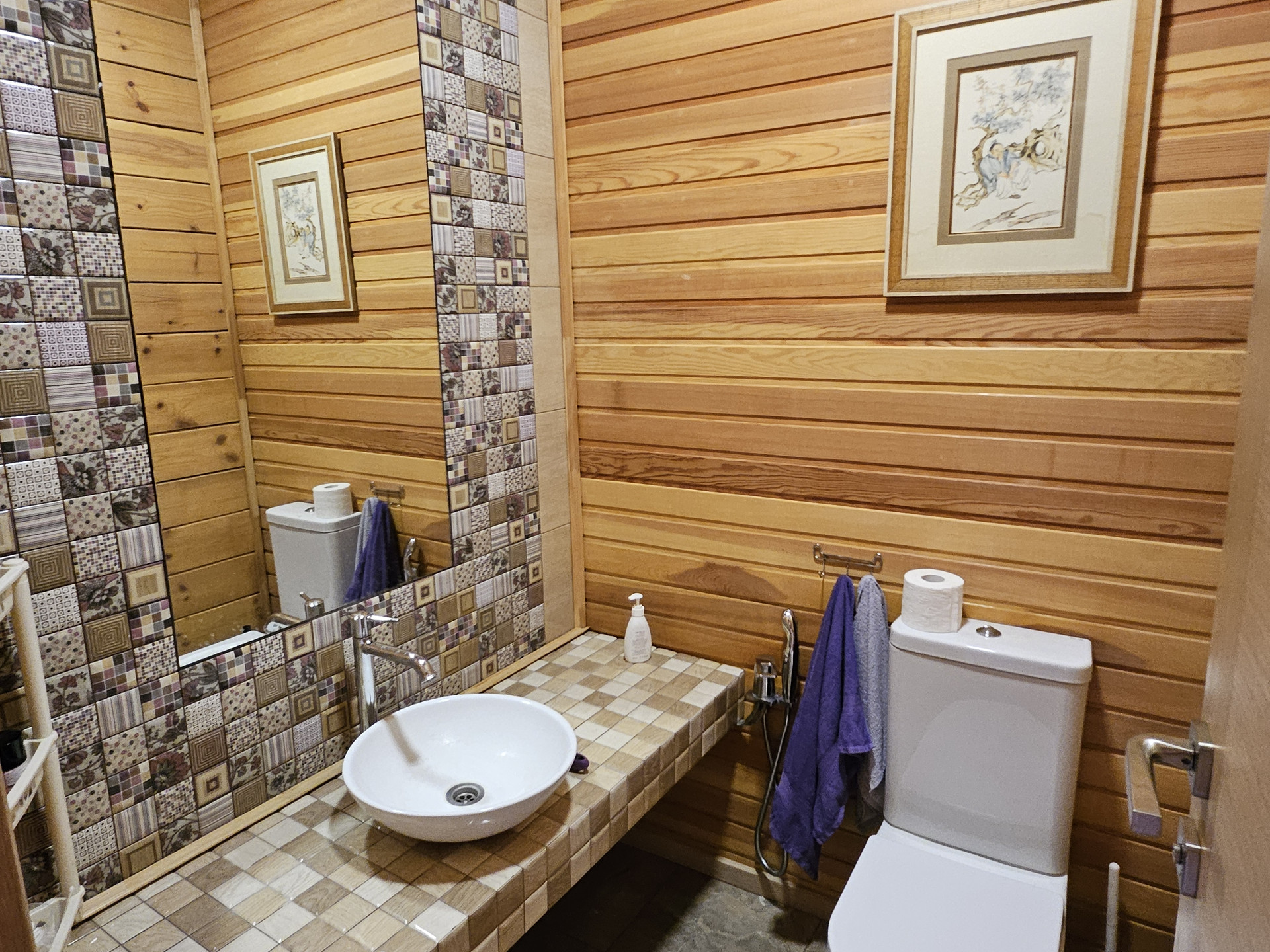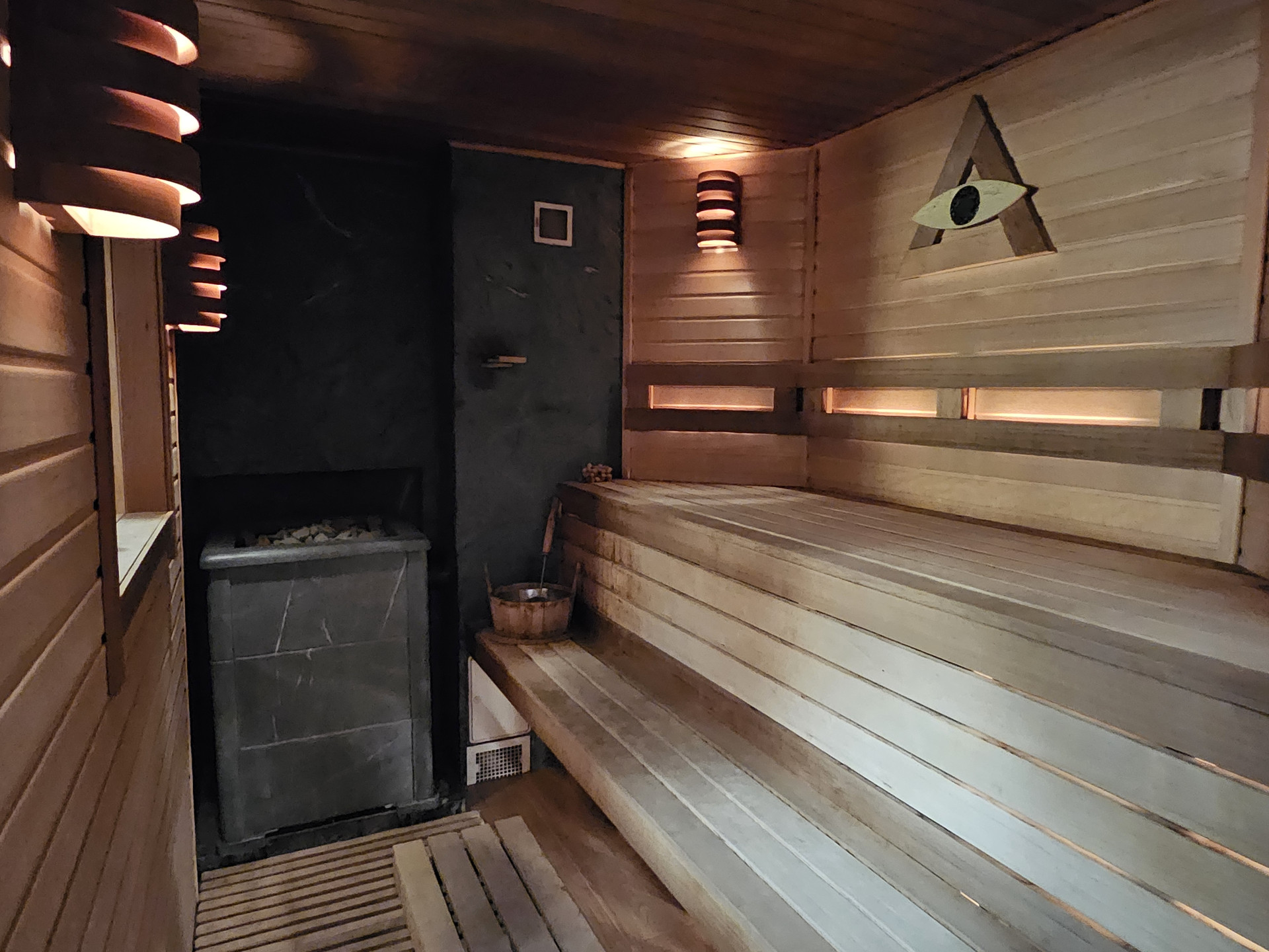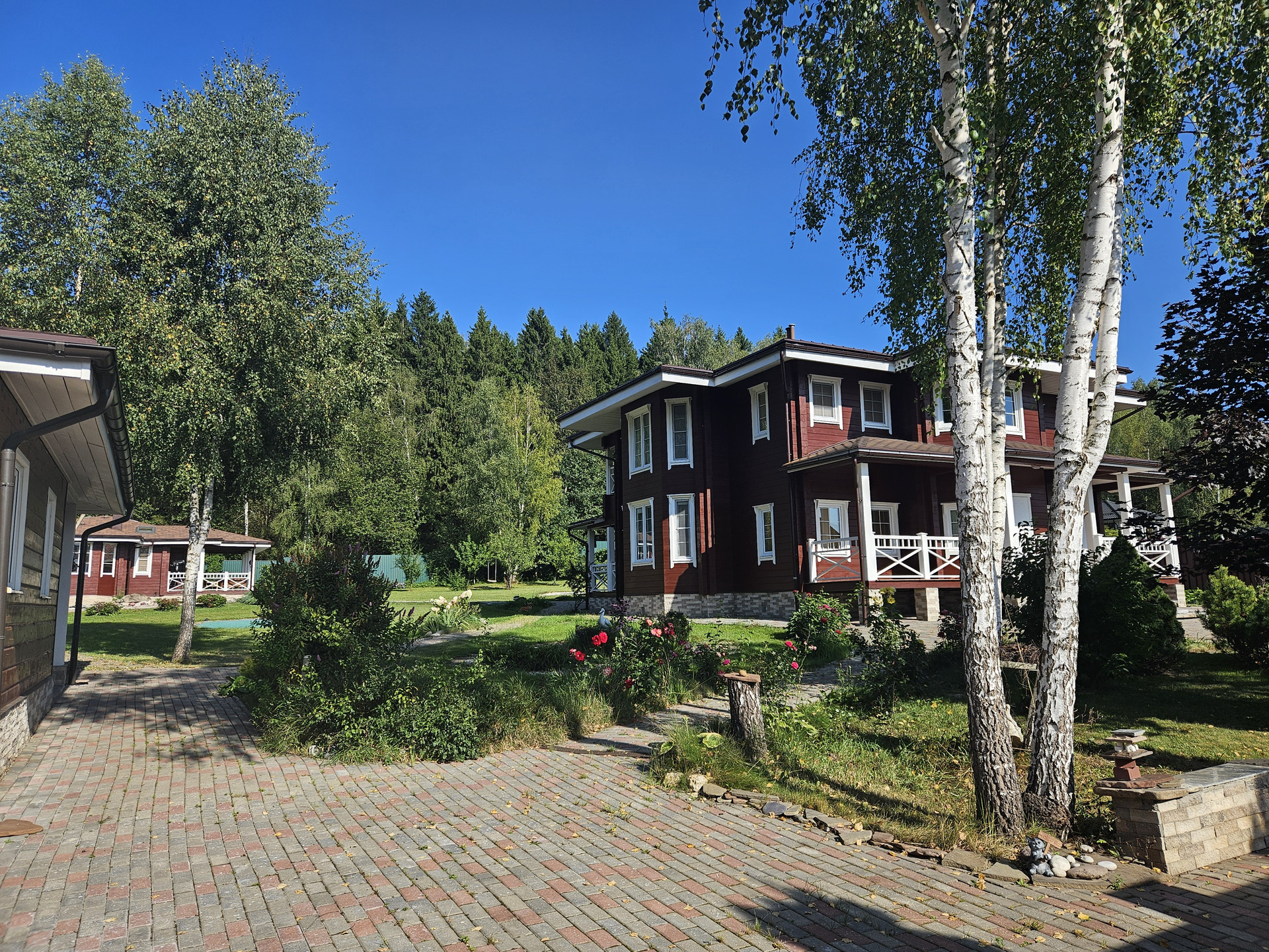 Баня. Просторная комната отдыха, спальня, кухня, три санузла, парилка, дровница, помывочная с большой купелью. 7 мансардных окон. Большая открытая терасса с мебелью и тремя входами. Рядом с баней - уличный бассейн, стилизованный под природный пруд. Печка обложена финской каменной облицовкой из талькомагнезита (800 кг), дающая мягкий мелкодисперсный пар.