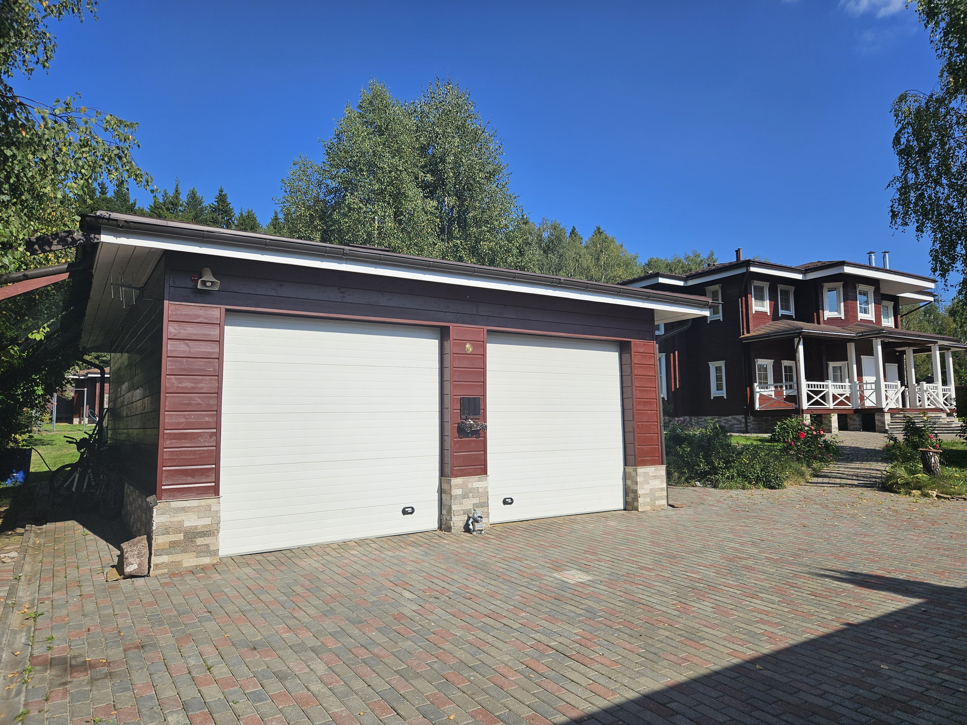 Гараж на 2 автомобиля с двумя автоматическими воротами, небольшая мастерская, генераторная с бензогенератором Honda и французской системой автозапуска на случай отключения/включения электричества. Трансформаторы-стабилизаторы на все три фазы.