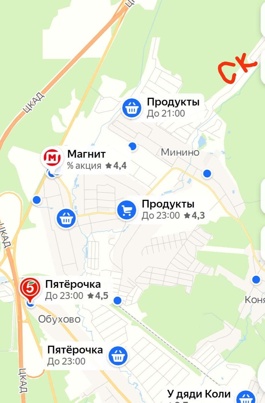 магазин; аптека; строит магазин; заправка; шиномонтаж; остановка автобуса; ж/д станция "Григорово"