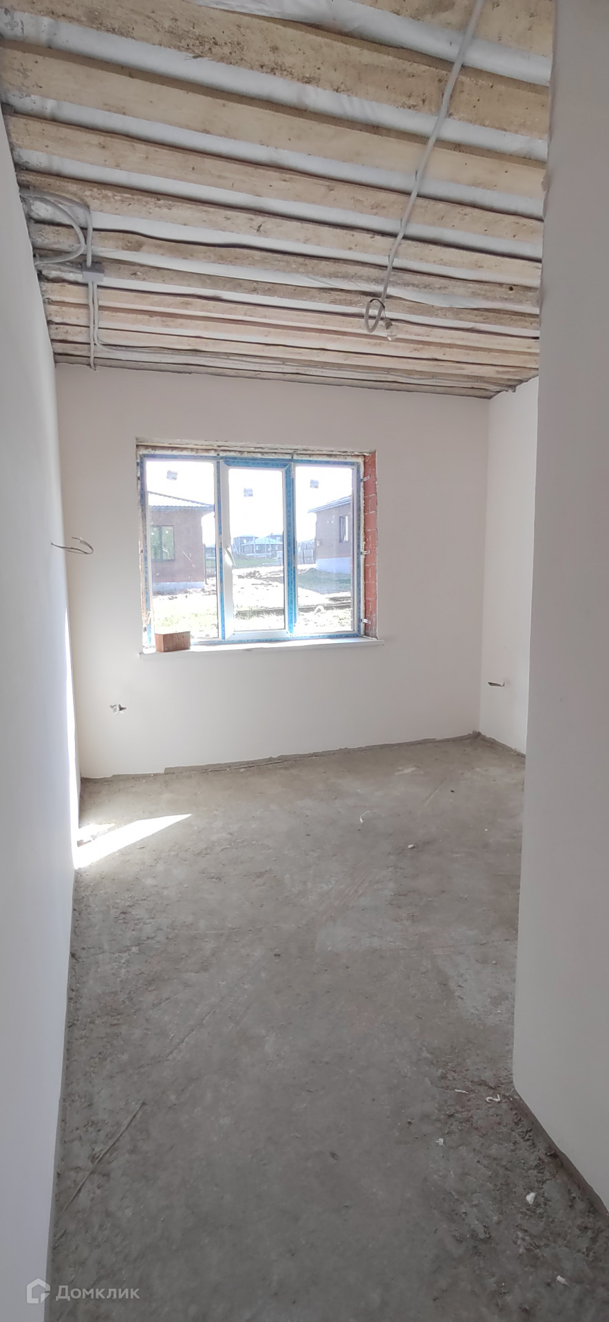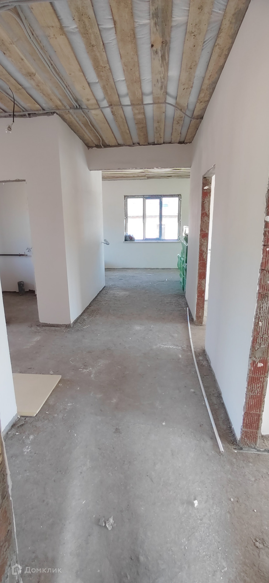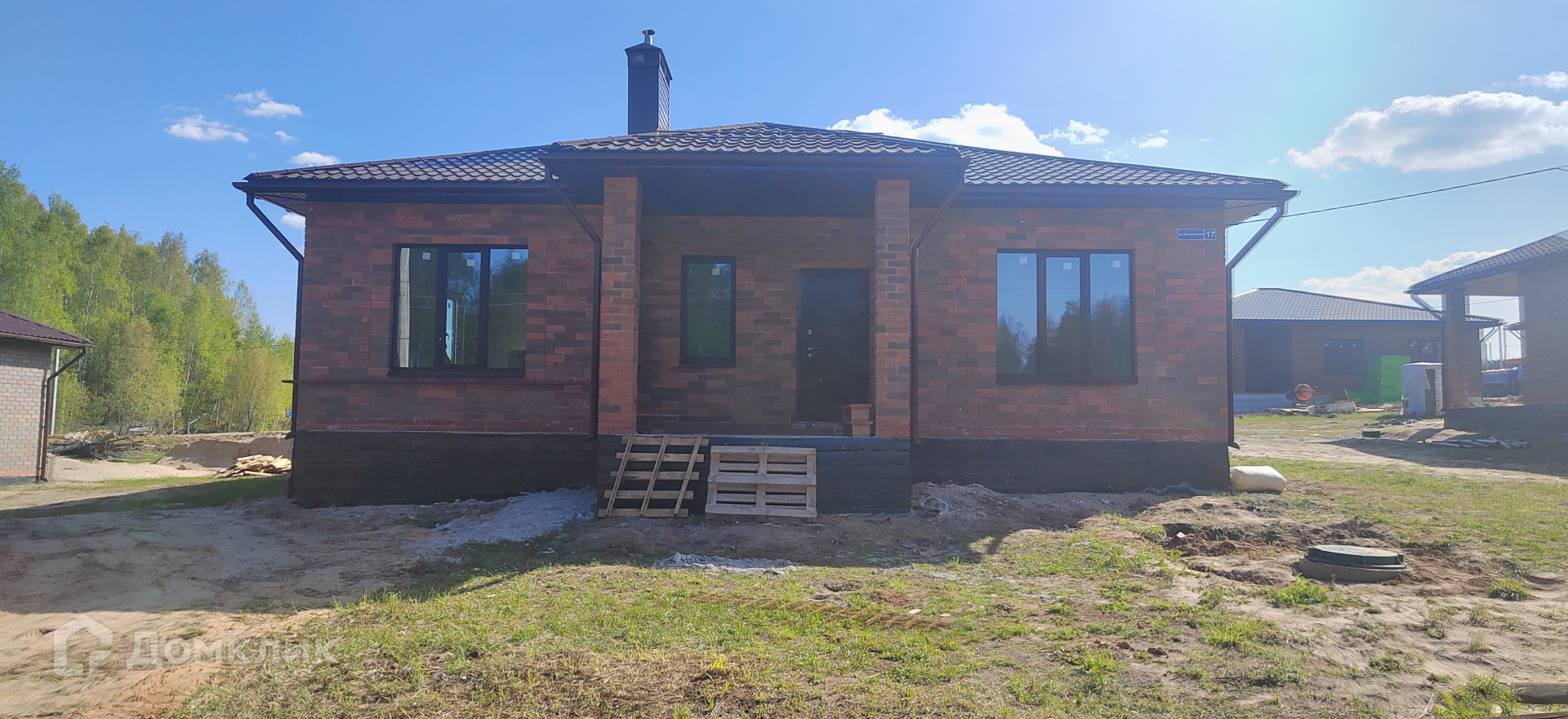 В предчистовой отделке (электропроводка разведена по всему дому, штукатурка стен, стяжка пола, теплые полы, радиаторы в комнатах, двухконтурный газовый котёл)