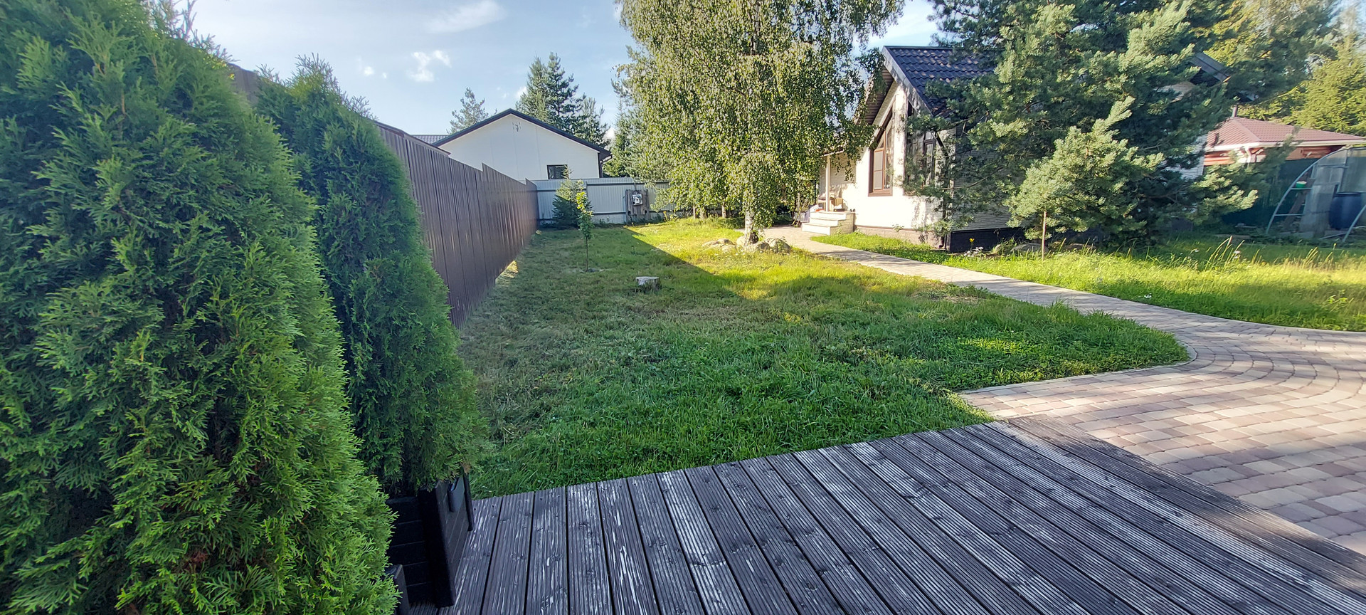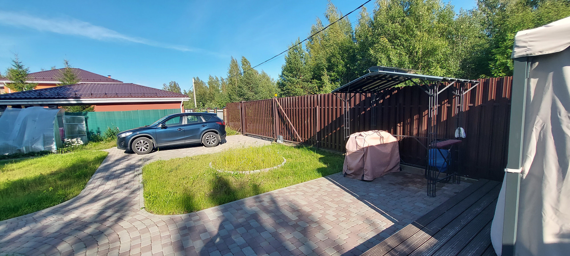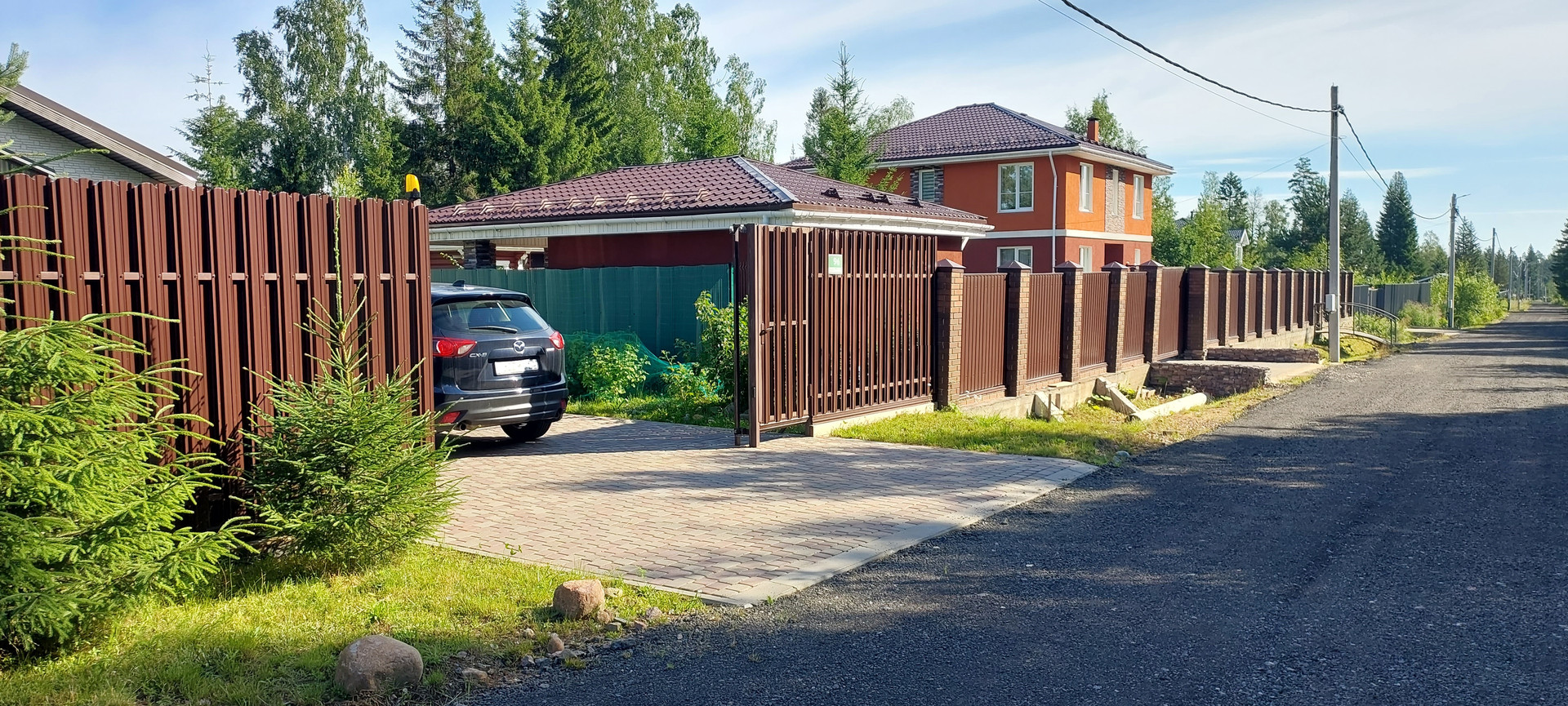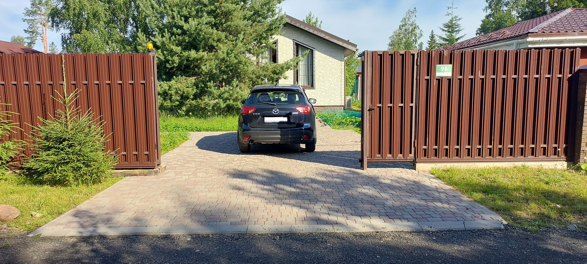 Дорожки и парковка на 2 авто выложены плиткой. Ворота откатные, управление с пульта.