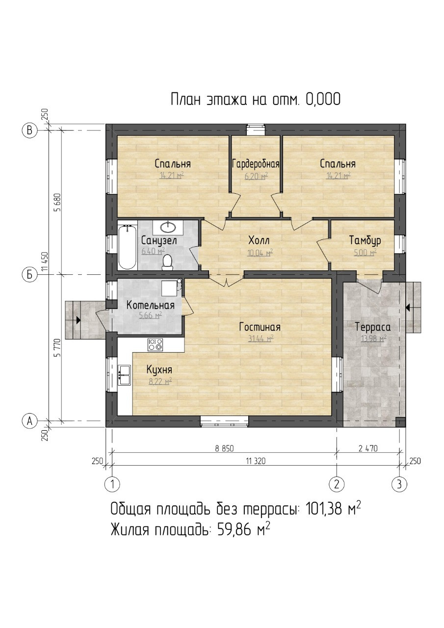 Планировка прекрасная -представлена на схеме: гостиная объединена с кухней,две комнаты (между ними гардеробная),совмещенный санузел. Все комнаты изолированы с выходом в холл,из холла -тамбур и выход на террасу.
