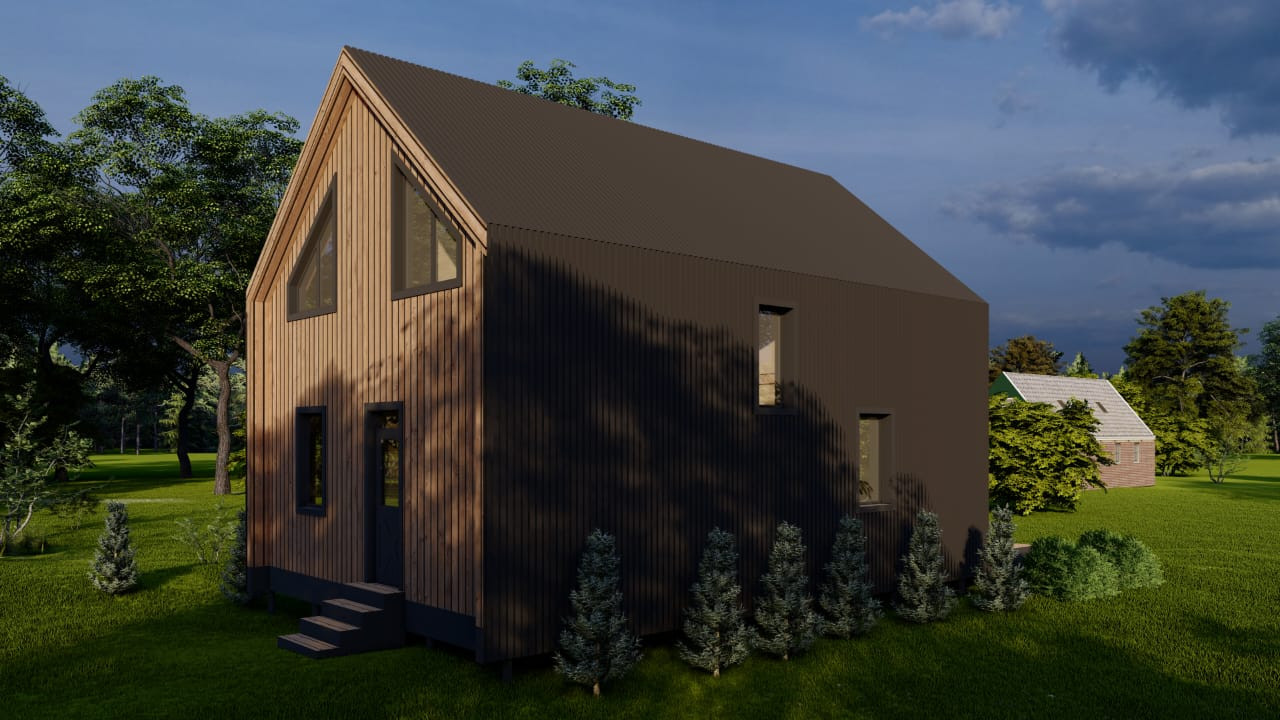 Дом по каркасной технологии в стиле «Барн» с террасой. Габариты дома 9,8х7.