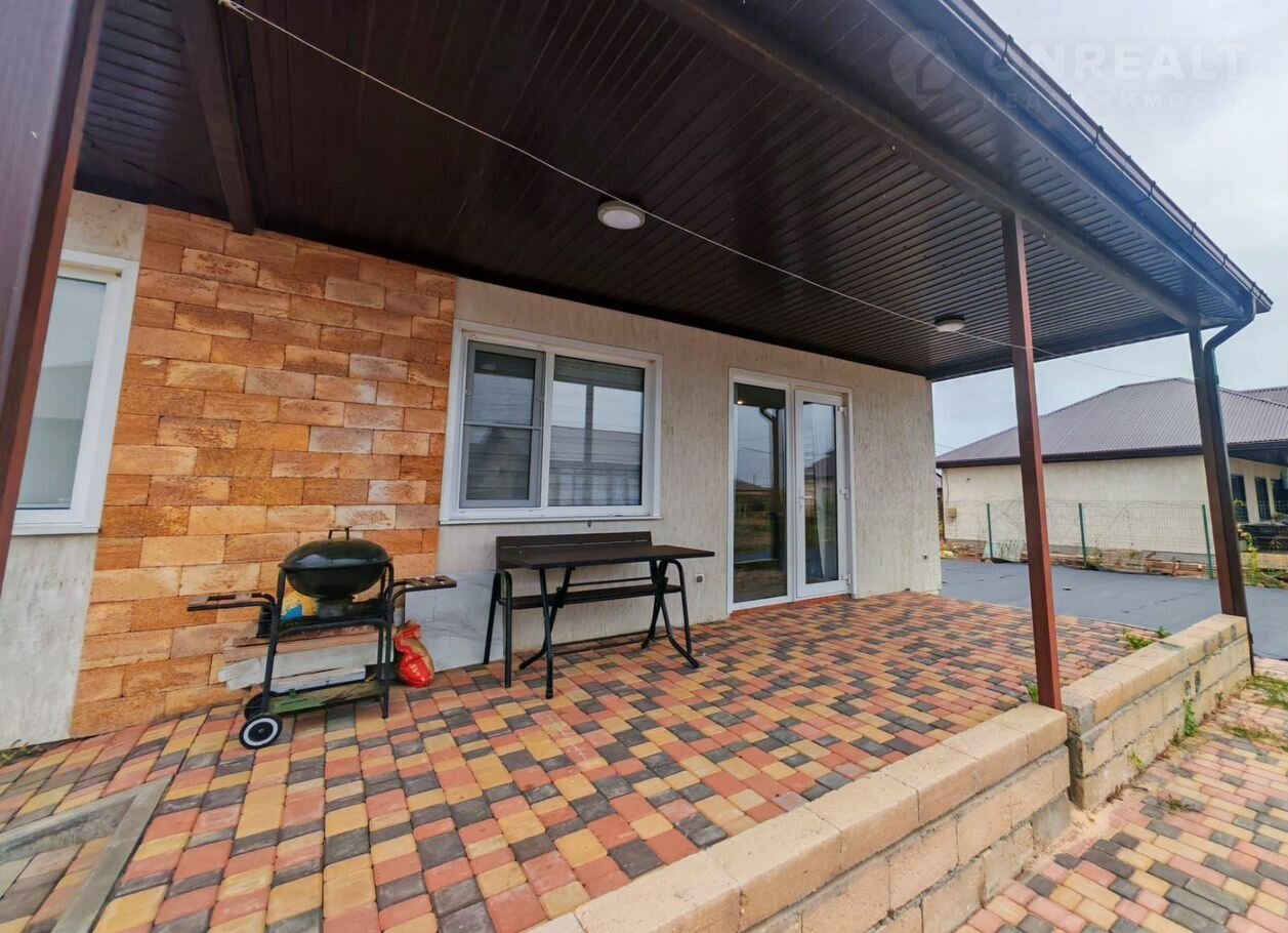 Участок площадью 6 соток полностью благоустроен: по периметру установлен забор с откатными воротами, двор вымощен брусчаткой и включает парковочное место, а также оборудованную зону отдыха на террасе.