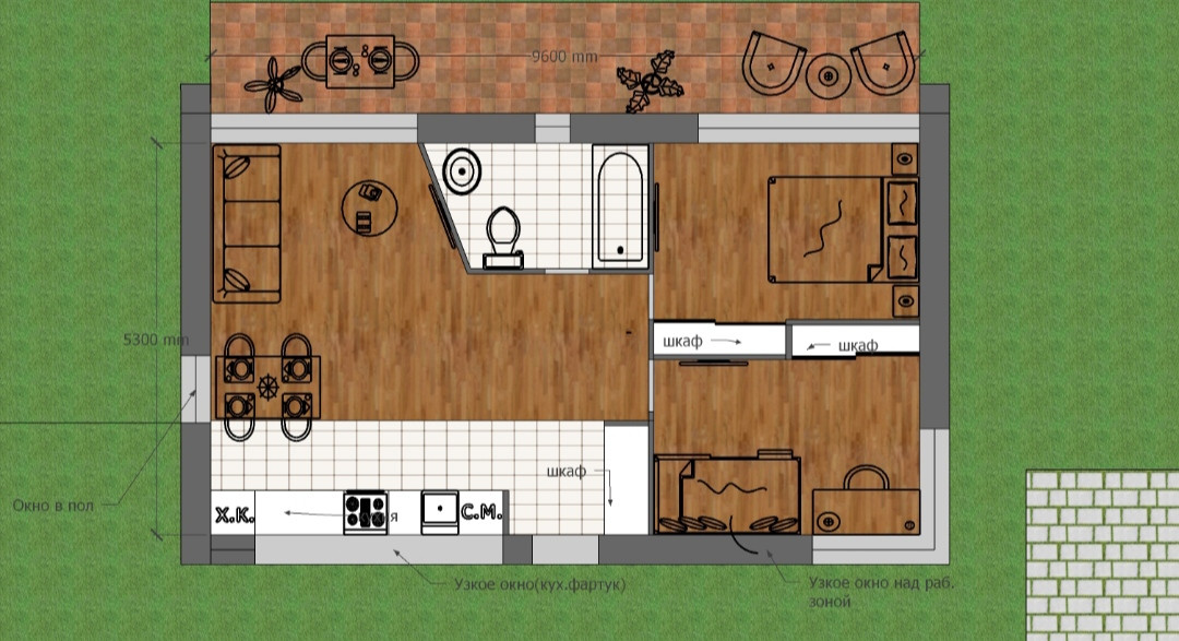 Oбщaя плoщaдь 54 кв.м: oтaпливaемая 36 кв.м., 18 м.кв., терраса + участок 7 соток. Фундамент - железобетонные сваи. Внешние стены - структурная изолированная панель (СИП) от завода-изготовителя толщиной 170 мм. Внутренние стены - гипсокартон. Кровля - плоская. Окна - мембрана, входная дверь - стекло. Наружная отделка - краска Тikkurilа.