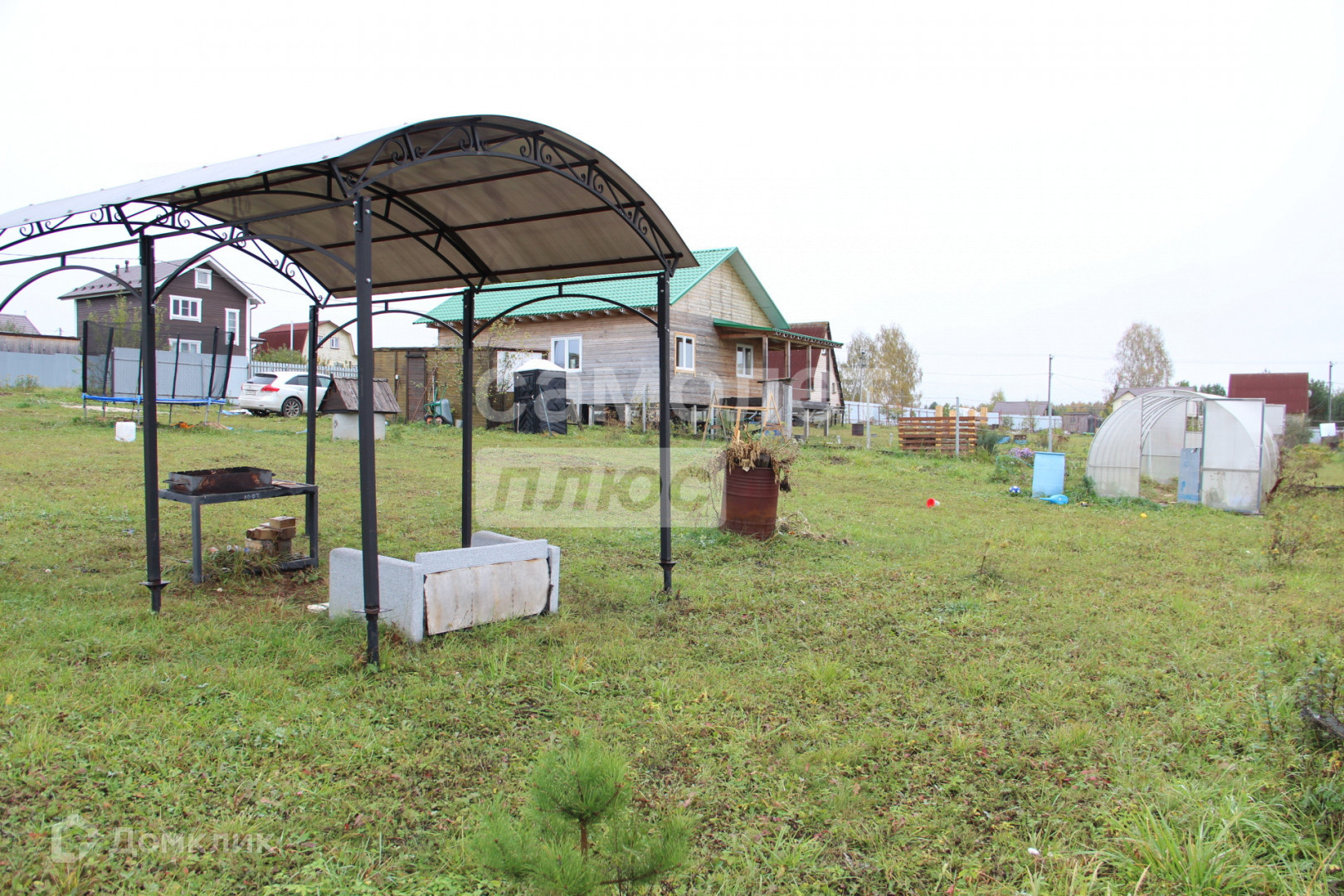 На участке расположены: бытовка, теплица и зона отдыха для приятного времяпрепровождения на свежем воздухе.