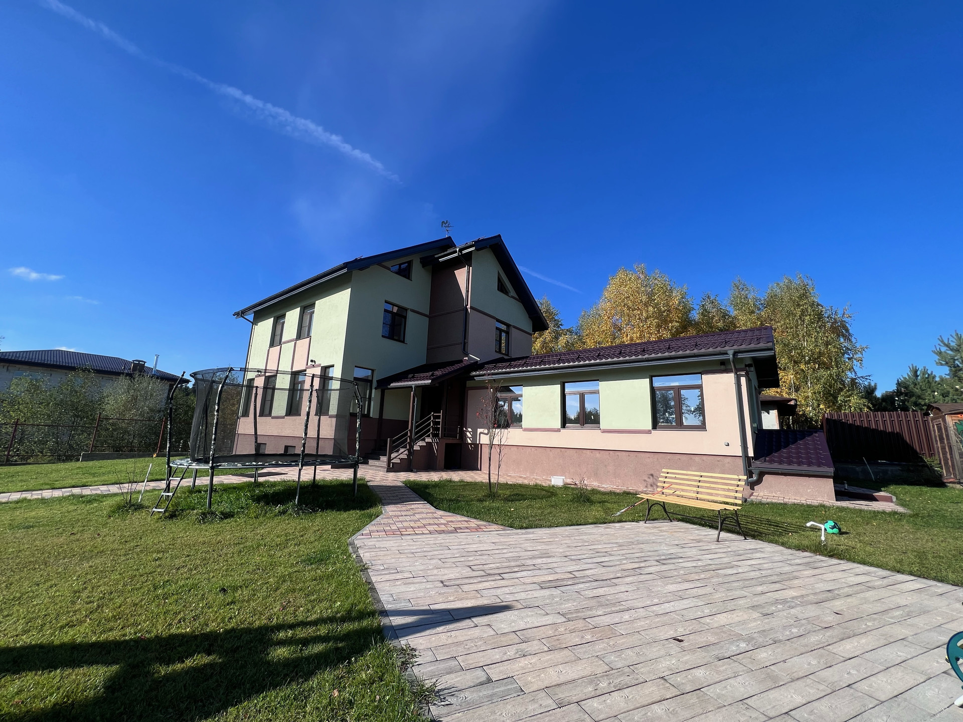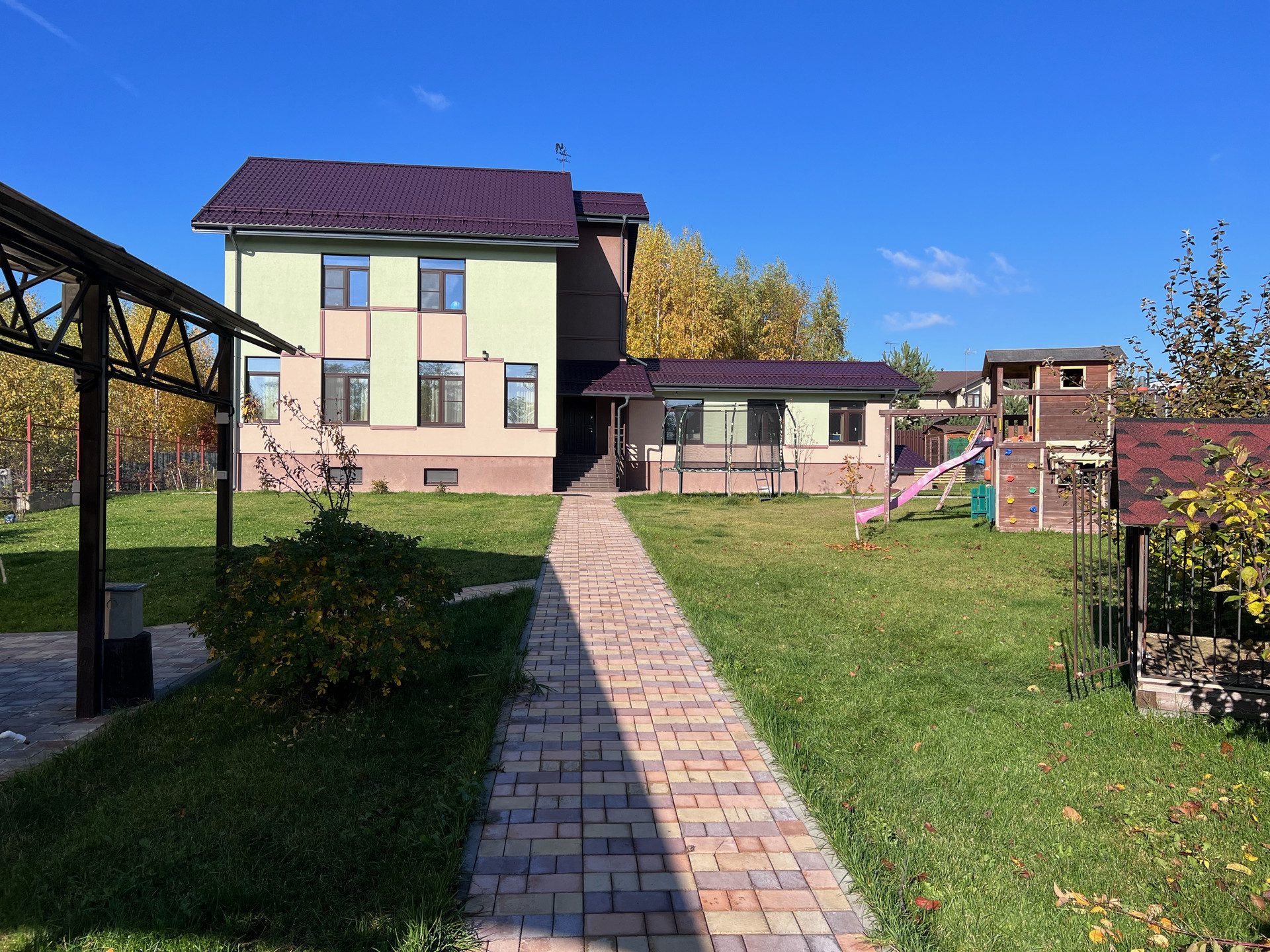 На участке установлен детский комплекс и батут.