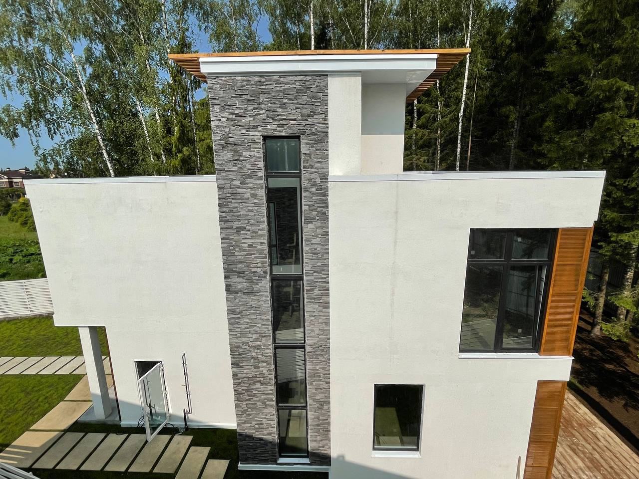 Площадь дома составляет 190 квадратных метров, предлагая достаточно пространства для всей семьи. 5 уютных комнат позволят каждому члену семьи наслаждаться своей личной зоной комфорта. Дом имеет 2 этажа, а также эксплуатируемую кровлю, предоставляя возможность использовать пространство по своему усмотрению.