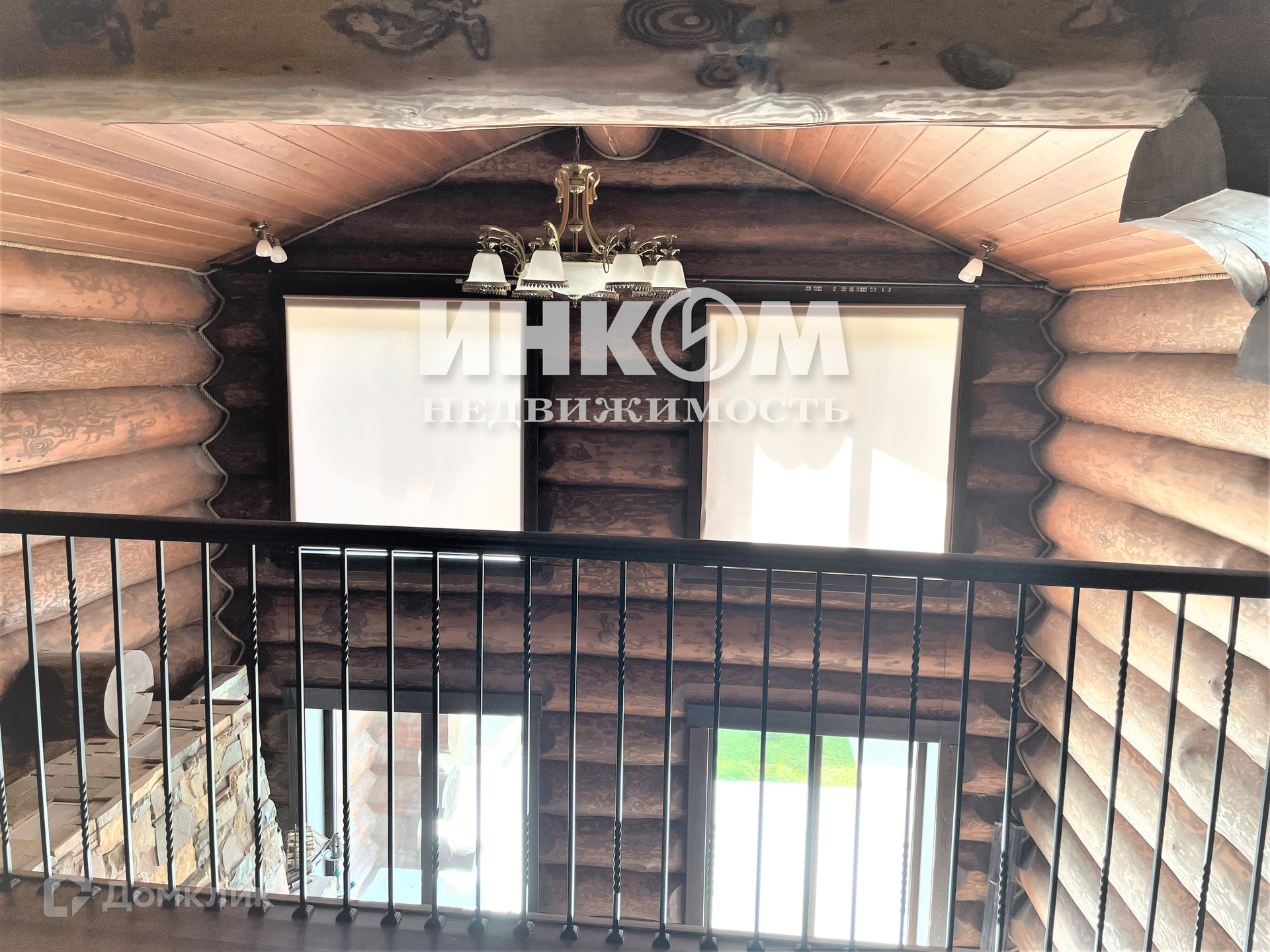 Лестница на второй этаж из бревна лиственницы с металлическим ограждением, перила из дуба.