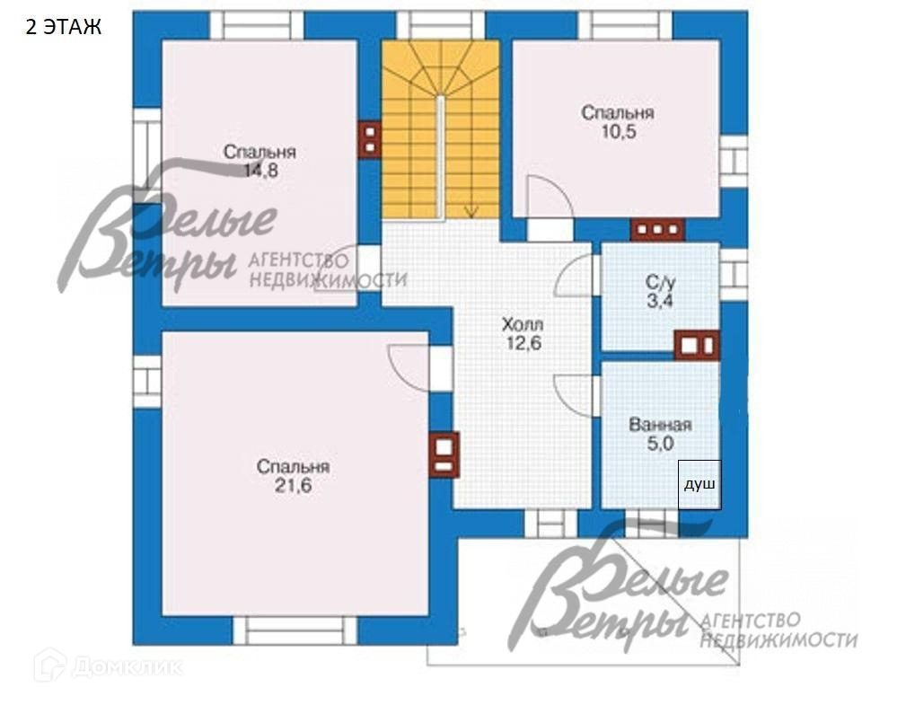 2-ой этаж: холл 12,6 кв.м, ванная комната 5 кв.м, санузел 3,4 кв.м, спальня 10,5 кв.м, спальня 14,8 кв.м,спальня 21,6 кв.м..