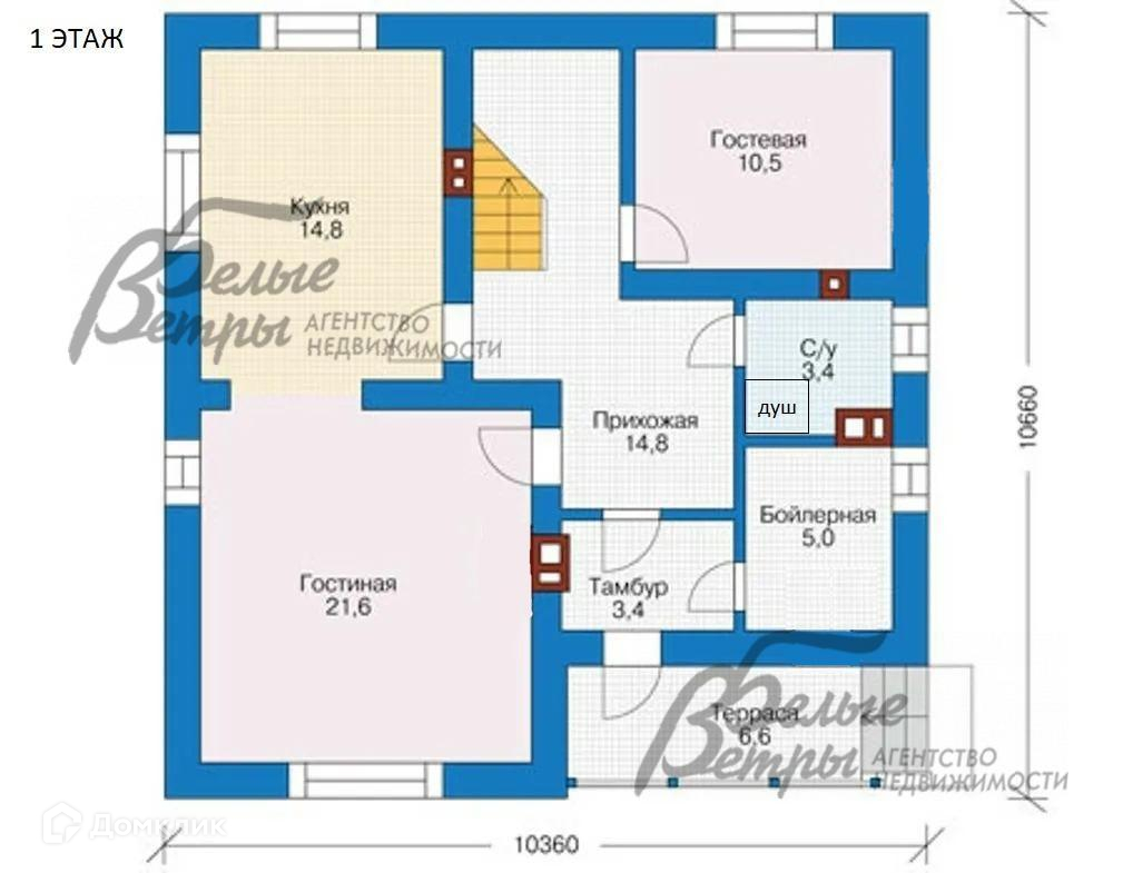 1-ый этаж: терраса 6,6 кв.м, тамбур 3,4 кв.м, бойлерная 5 кв.м, прихожая 14,8 кв.м, санузел 3,4 кв.м, гостевая спальня 10,5 кв.м, кухня 14,8 кв.м, гостиная 21,6 кв.м..