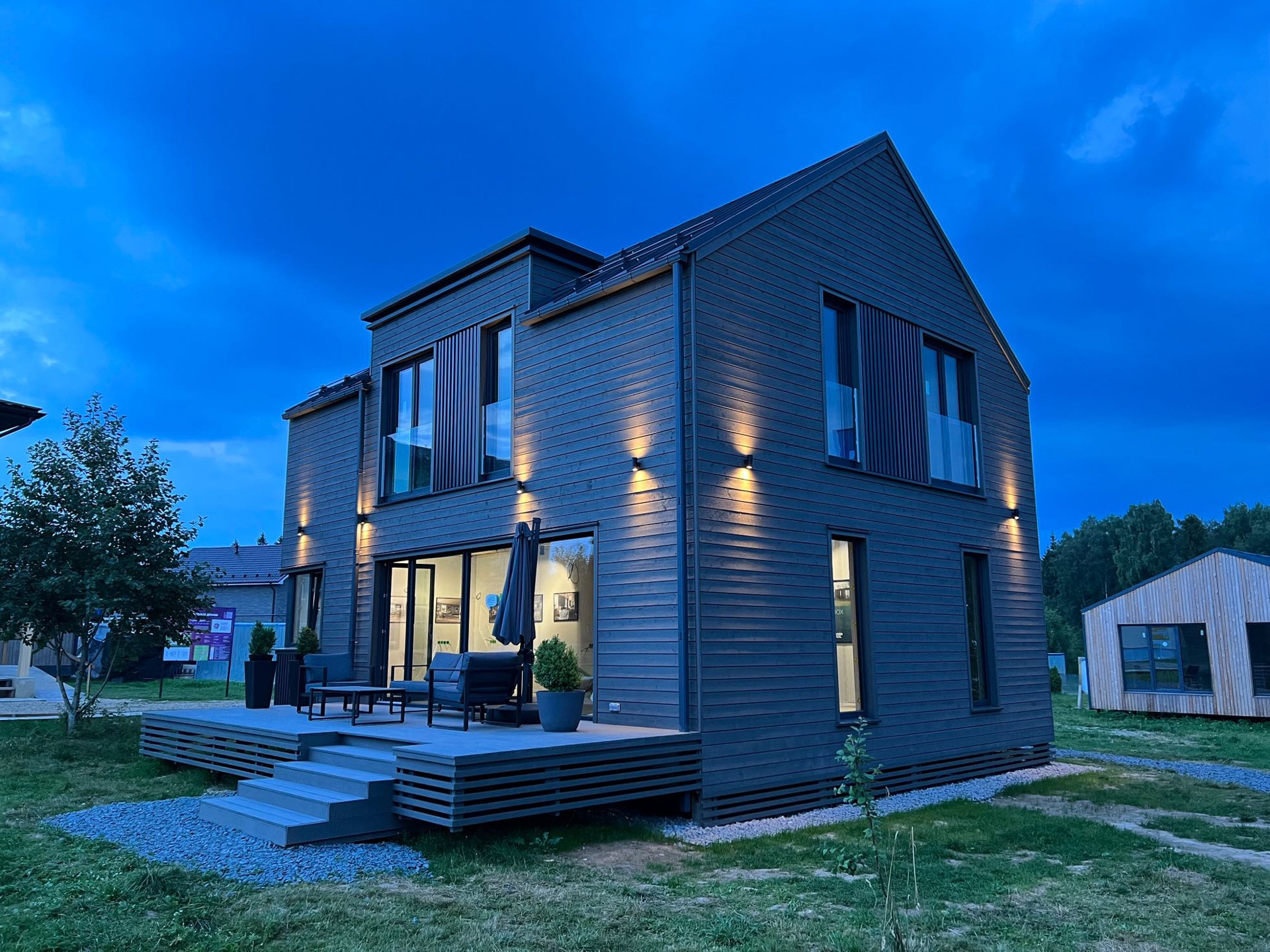 Домокомплект изготовлен по панельно-каркасной технологии на заводе с применением роботизированного немецкого конвейера Wienmann с высочайшей точностью. Толщина утепления кровли и нулевого перекрытия 300 мм, стены 250 мм минераловатного утеплителя. На заводе также окрашен и смонтированы фасад из скандинавской доски с поднятым ворсом, смонтированы окна и отливы, что исключает вероятность нарушения технологии монтажа и герметизации теплого контура на стройплощадке.