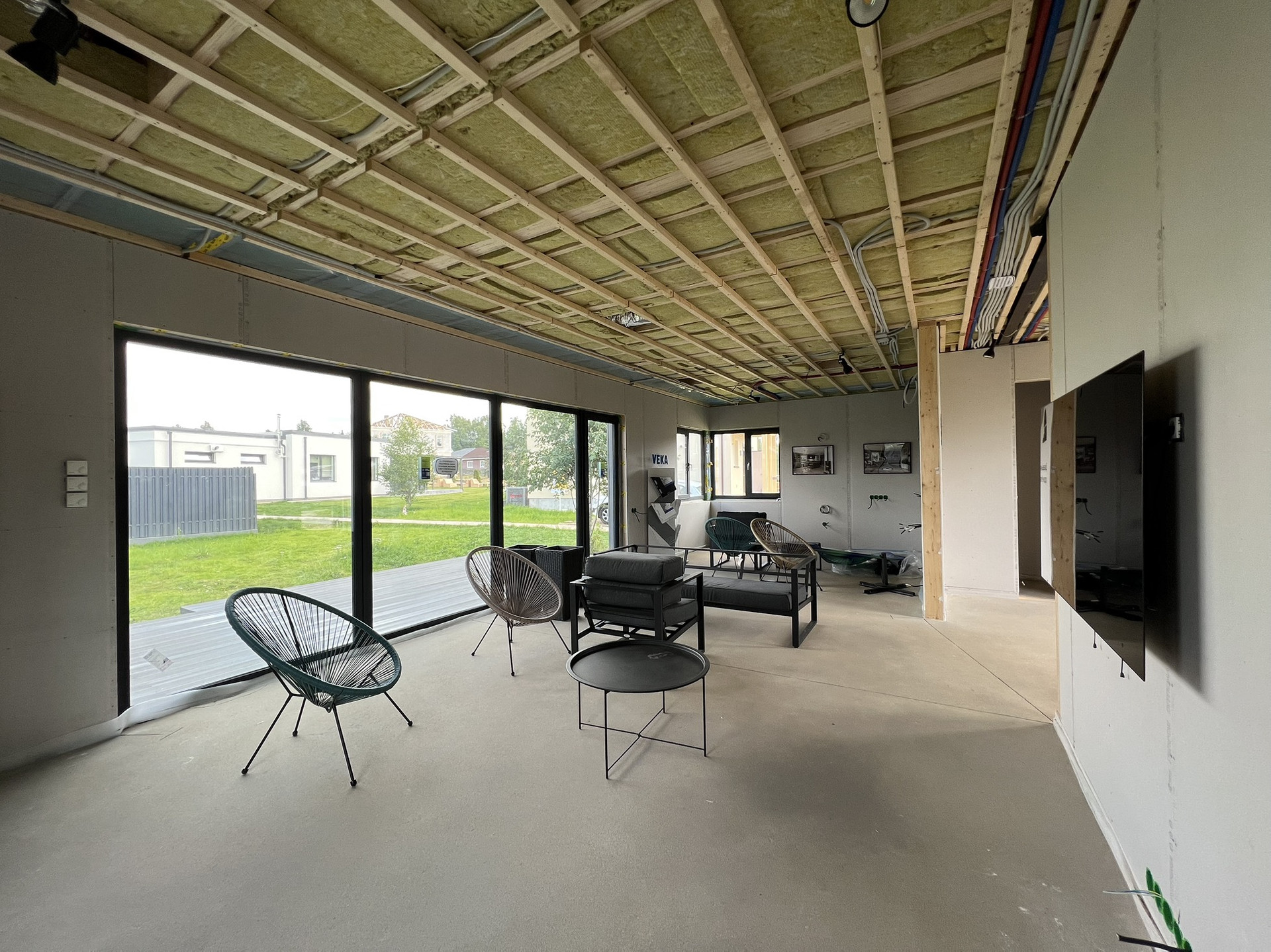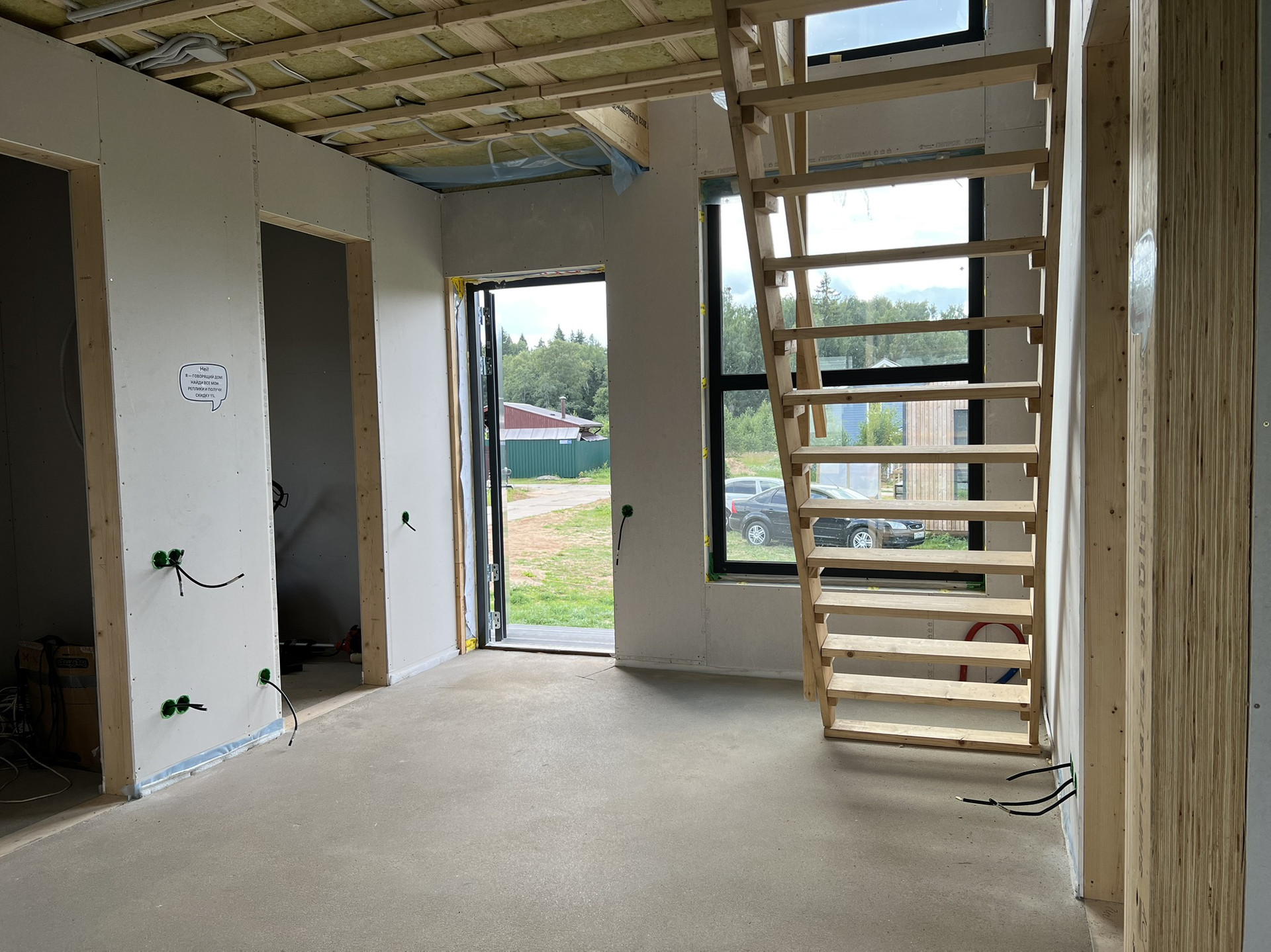 По всем перекрытиям выполнена полусухая стяжка с водяным теплым полом. Разведена электрика и вода. В доме частично обустроена принудительная вентиляция с рекуперацией и вентмашиной. Обустроена канализация. Стены дома внутри обшиты гипроком, установлены подрозетники.