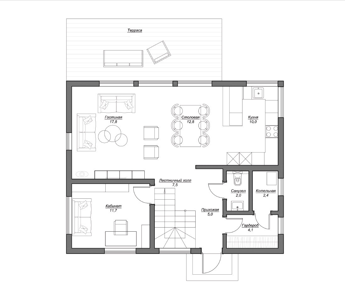 Кухня-гостиная столовая (40.6м2), 1 спальня-кабинет (11.7м2), 1 гостевой санузел (2м2), котельная+гардероб верхней одежды (6,5м2)